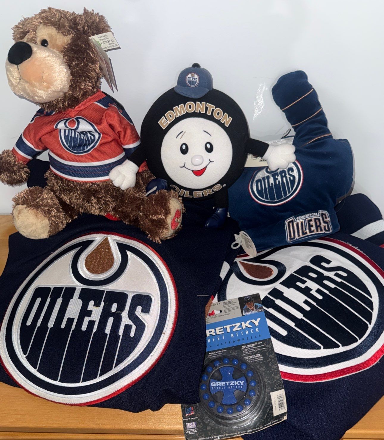 Lot 18 Hockey Fan Must Haves - 2 Oilers Jerseys Size M/L Collectible Plush & More