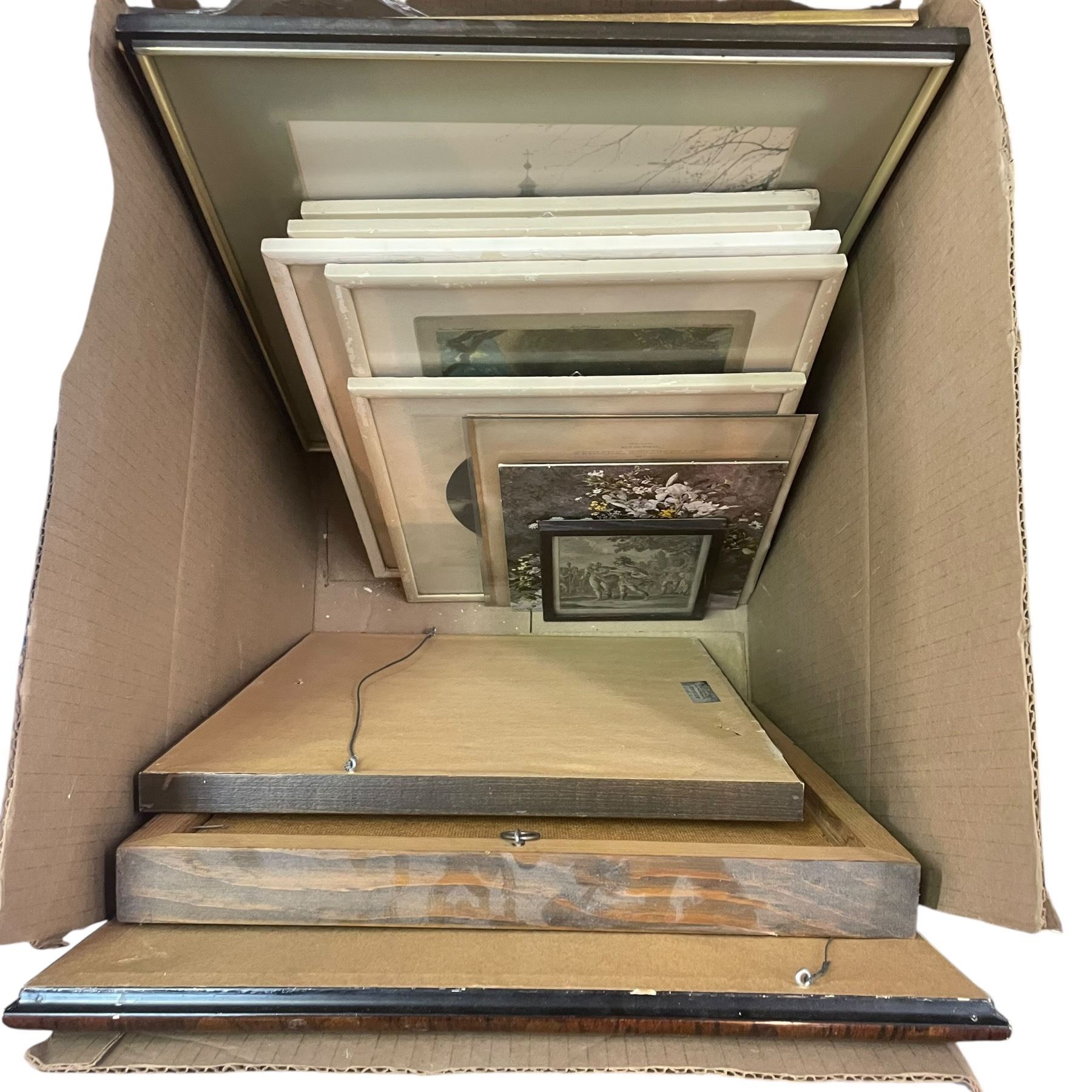 Box of Vintage Pictures in Frames and Household Goods