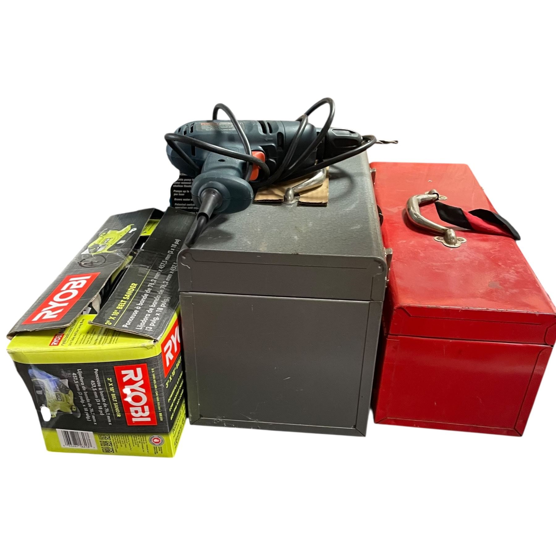 Lot 827 2 Toolboxes with Tools, Ryobi Belt Sander, Flotec Sump Pump and Black and Deck Drill