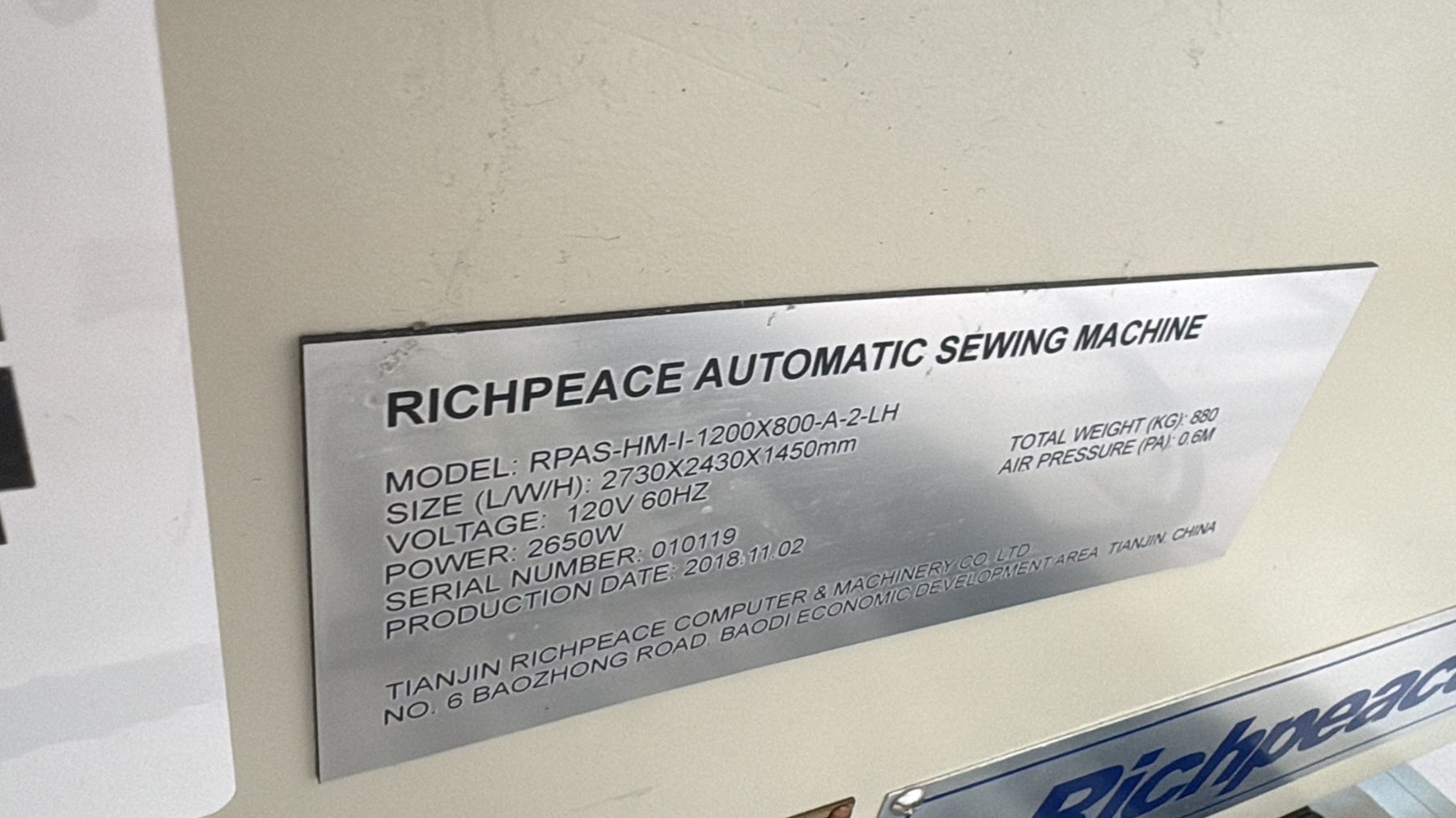Lot 24 RICHPEACE RPAS-HM-1-1200X800-A-2-LH AUTOMATIC, SINGLE-HEAD, PROGRAMMABLE INDUSTRIAL SEWING STATION