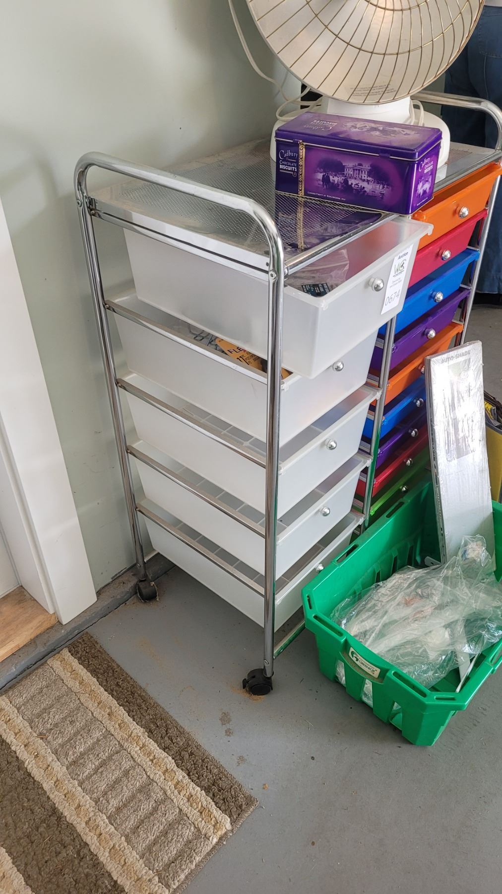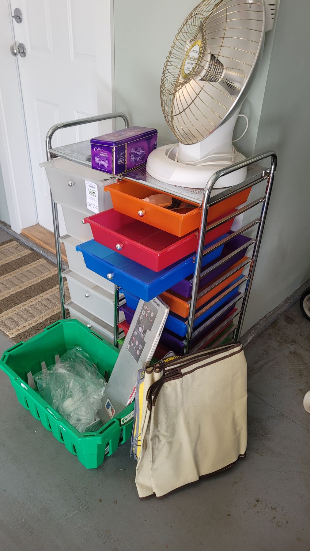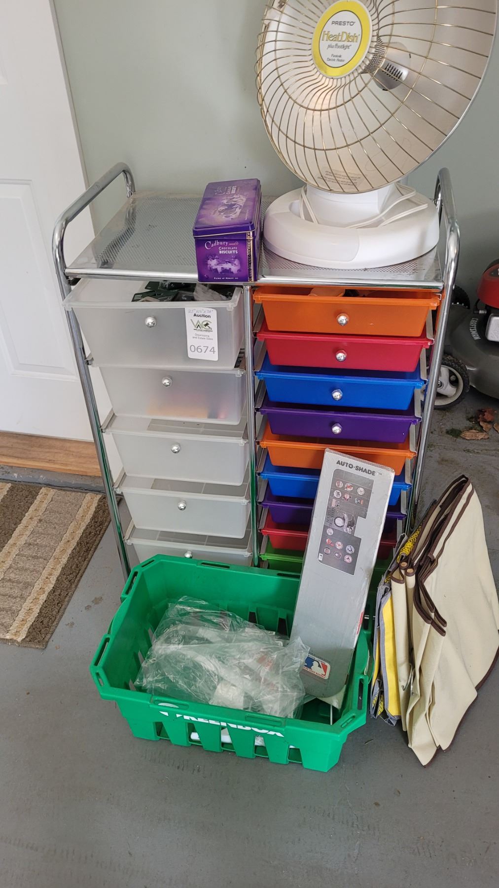 Rolling cart with drawers, 25x16x38.Presto heater, untested. Pick up 9-10