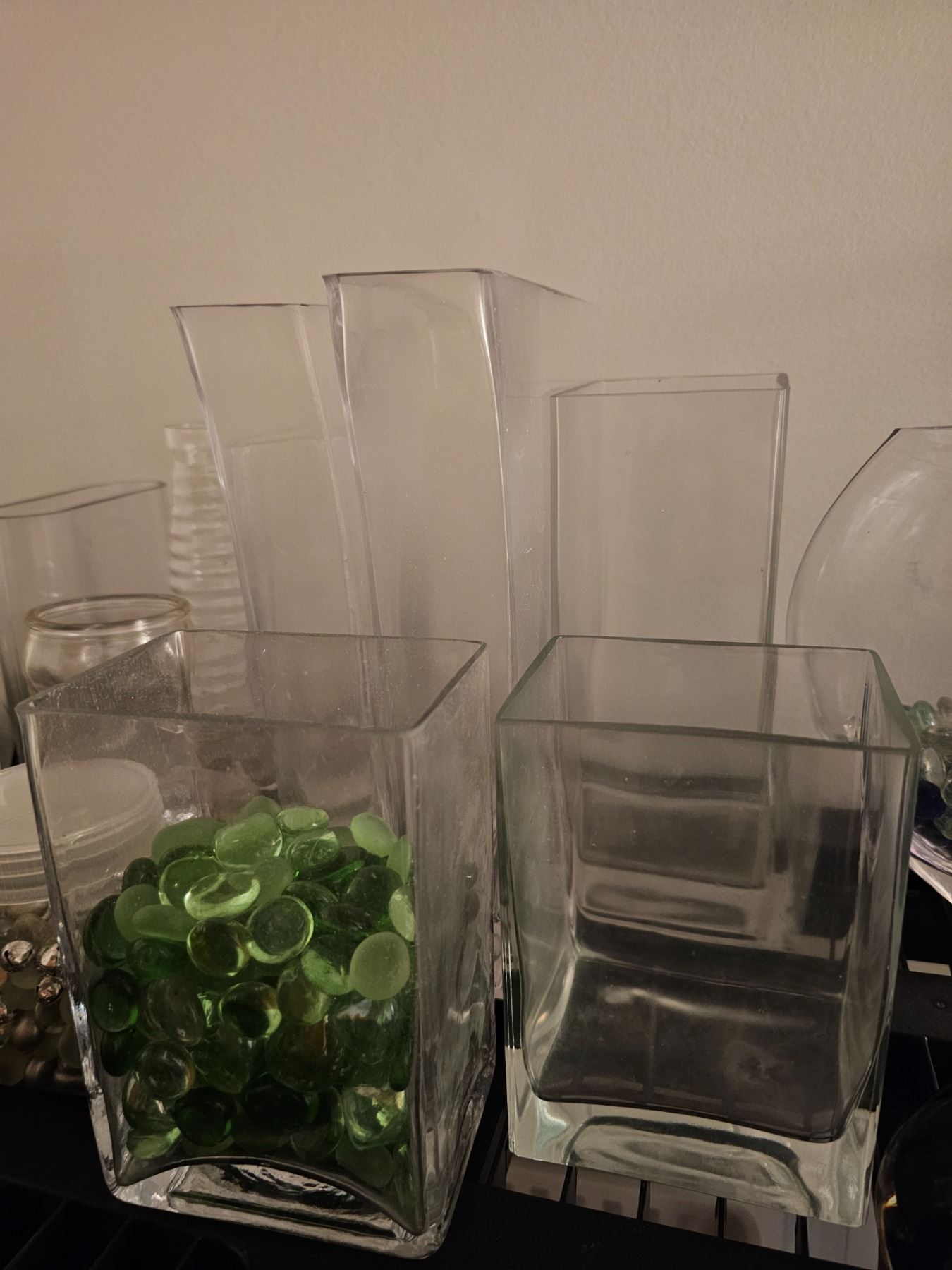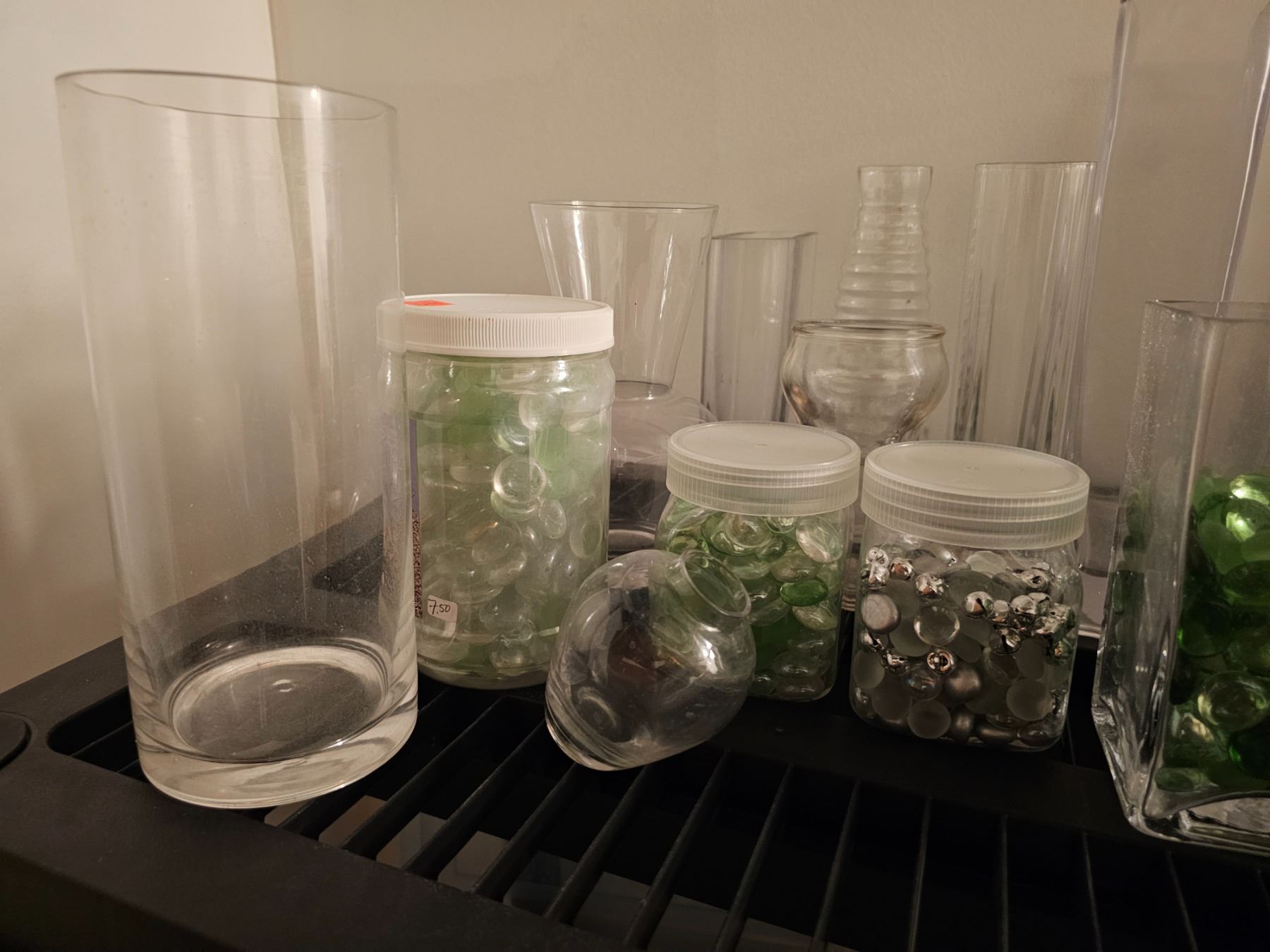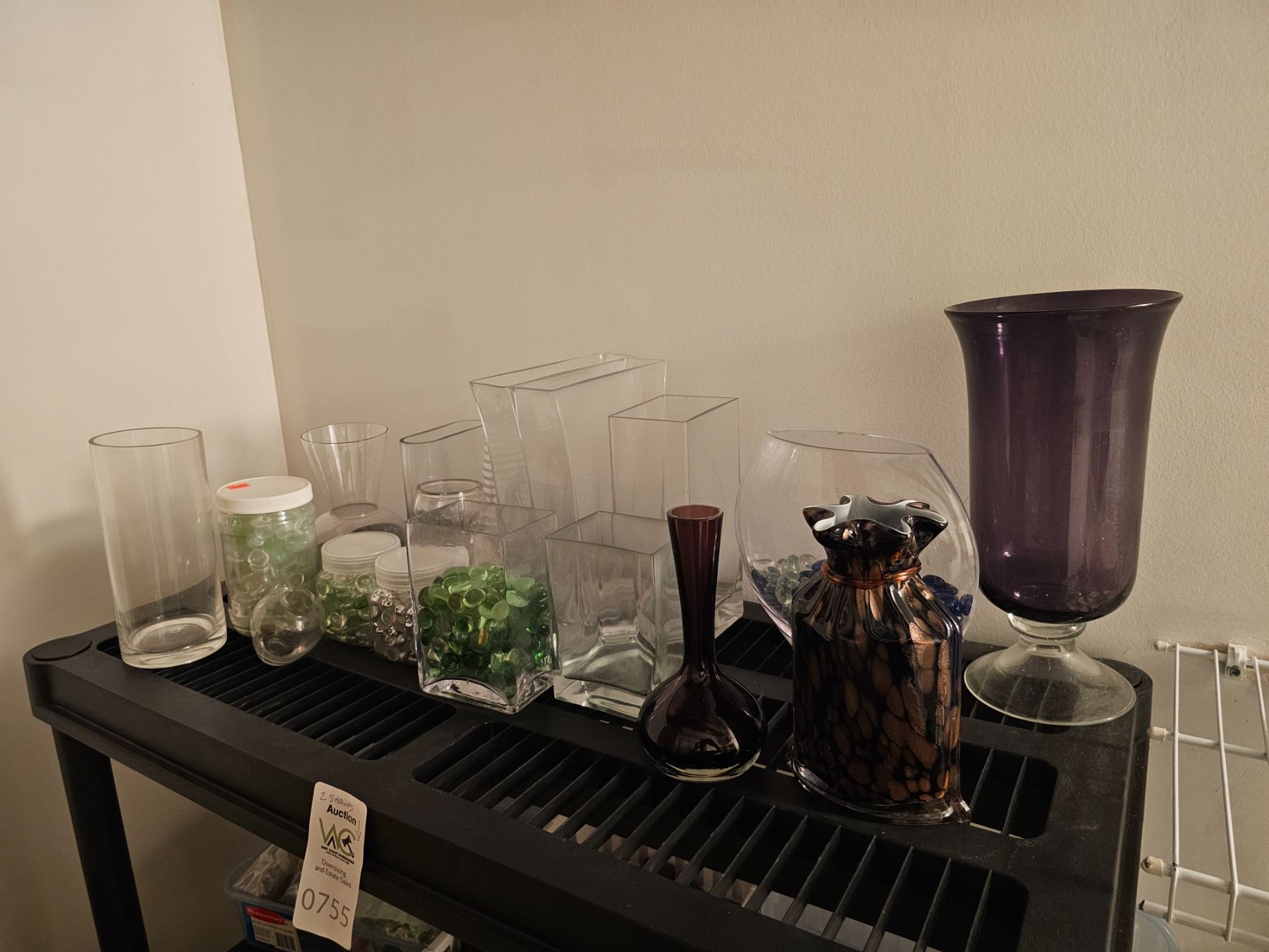 Pebbles, glass pebbles, vases. 2 shelves. Pickup at 9 am
