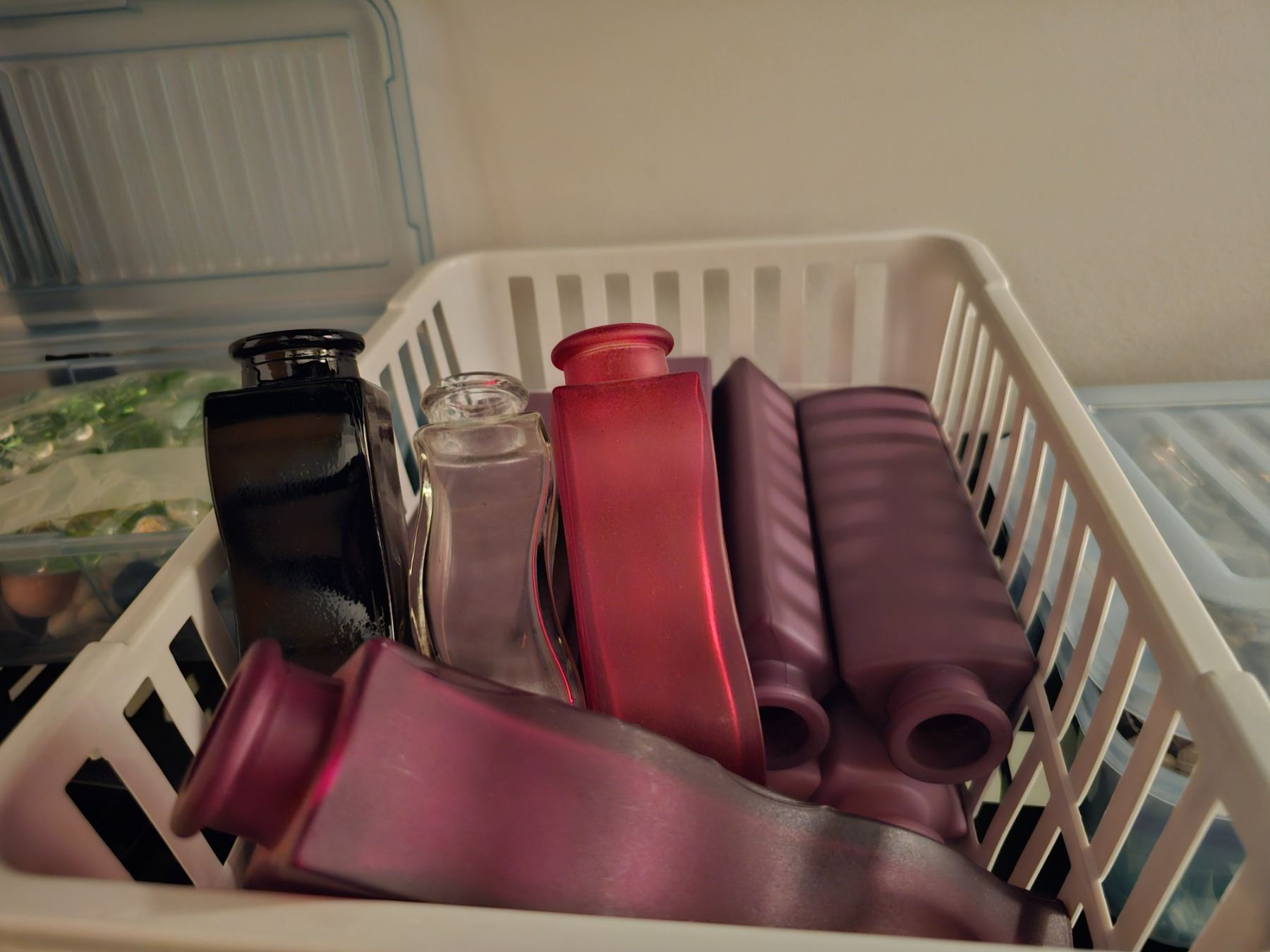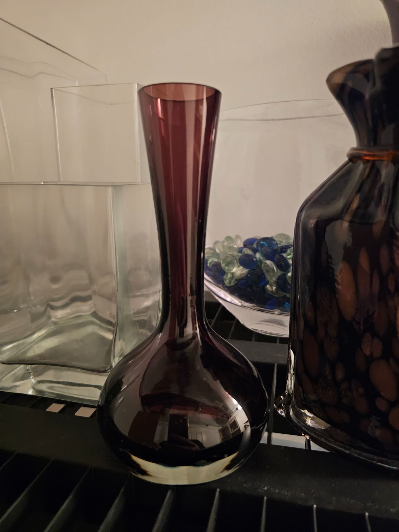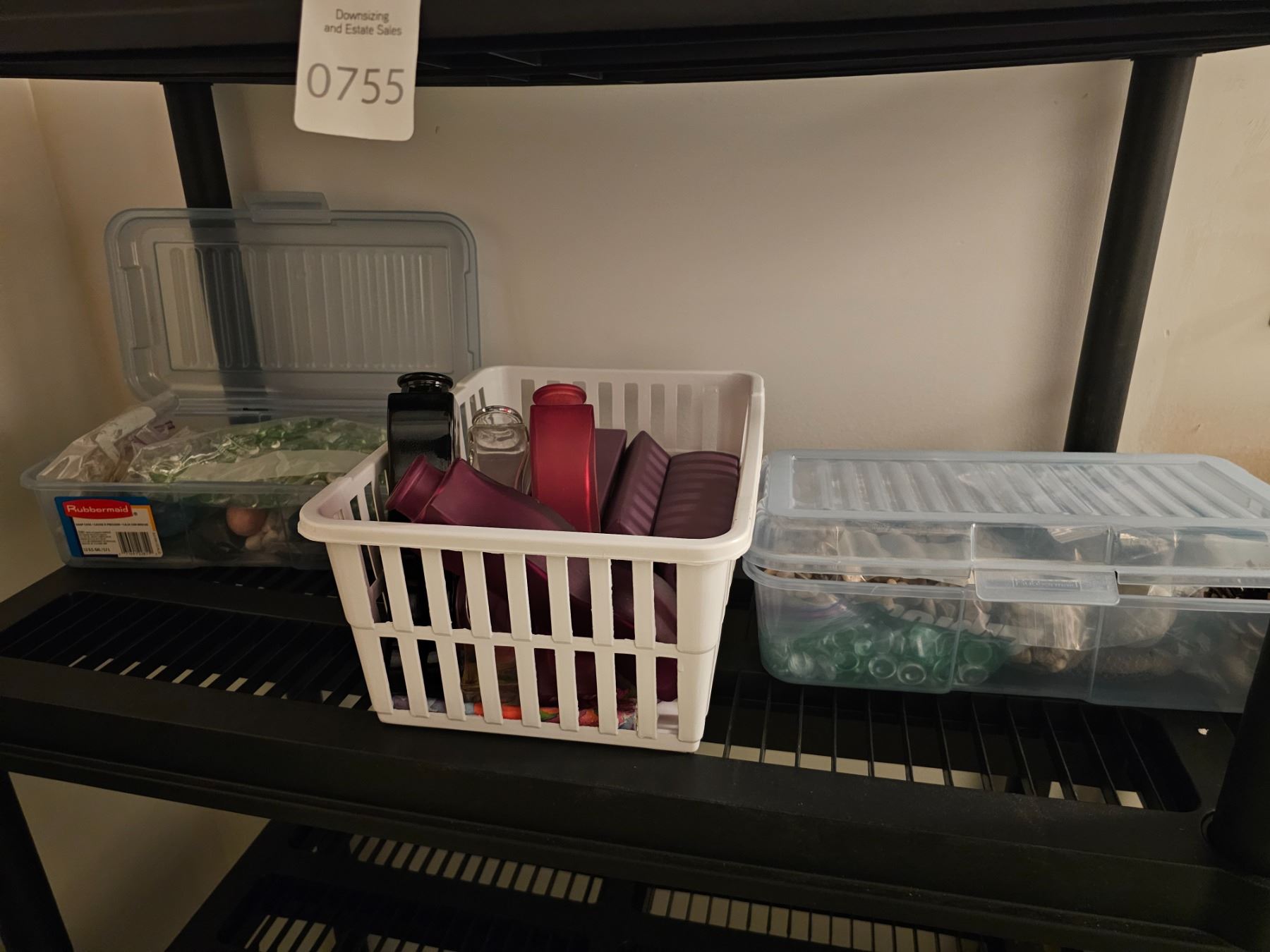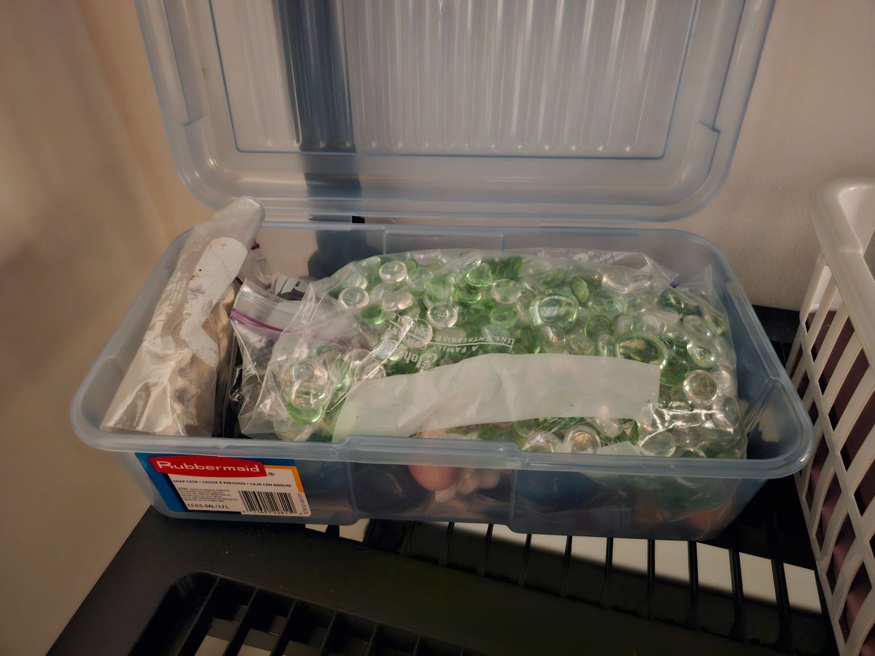 Pebbles, glass pebbles, vases. 2 shelves. Pickup at 9 am
