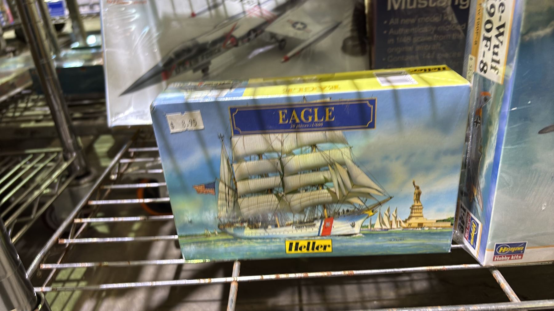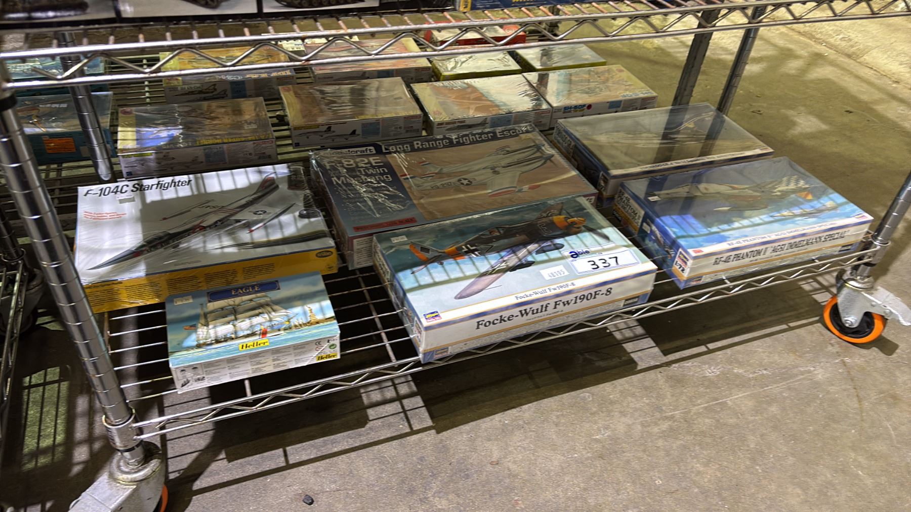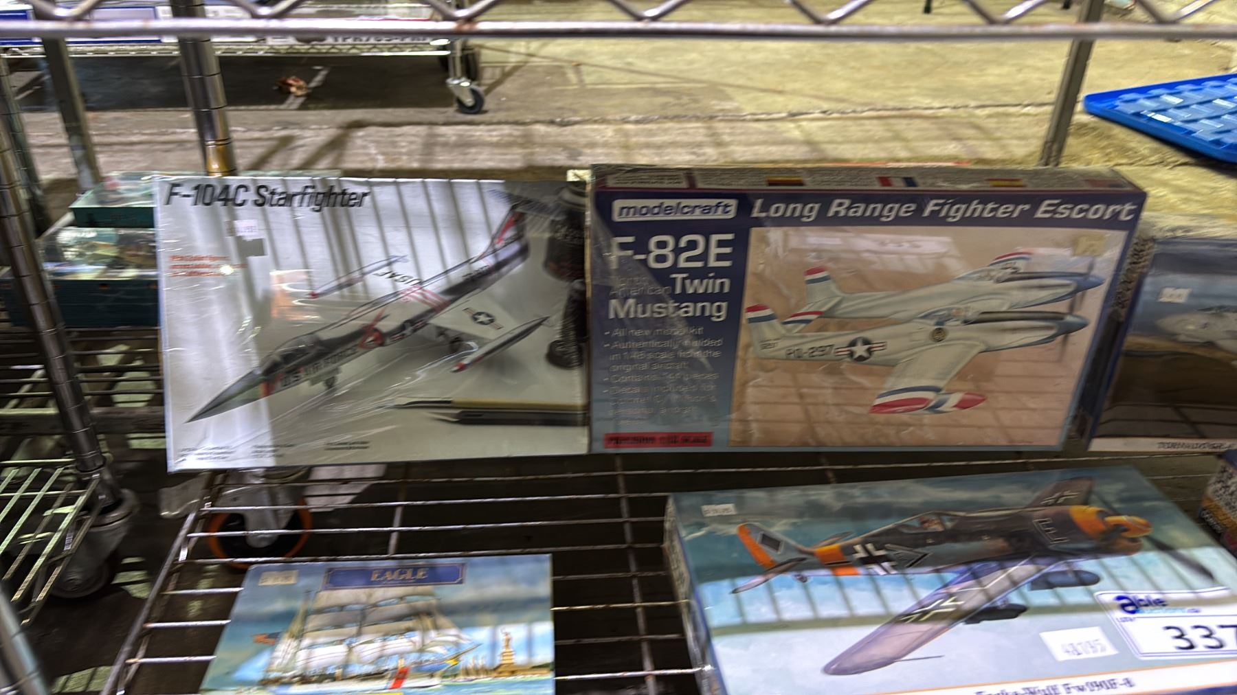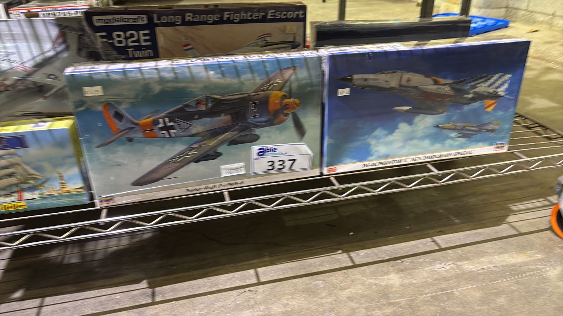 Lot 337 SHELF OF ASSORTED AIRPLANE MODEL KITS & 1 BOAT MODEL KIT: HELLER, HASEGAWA, MODELCRAFT & MORE