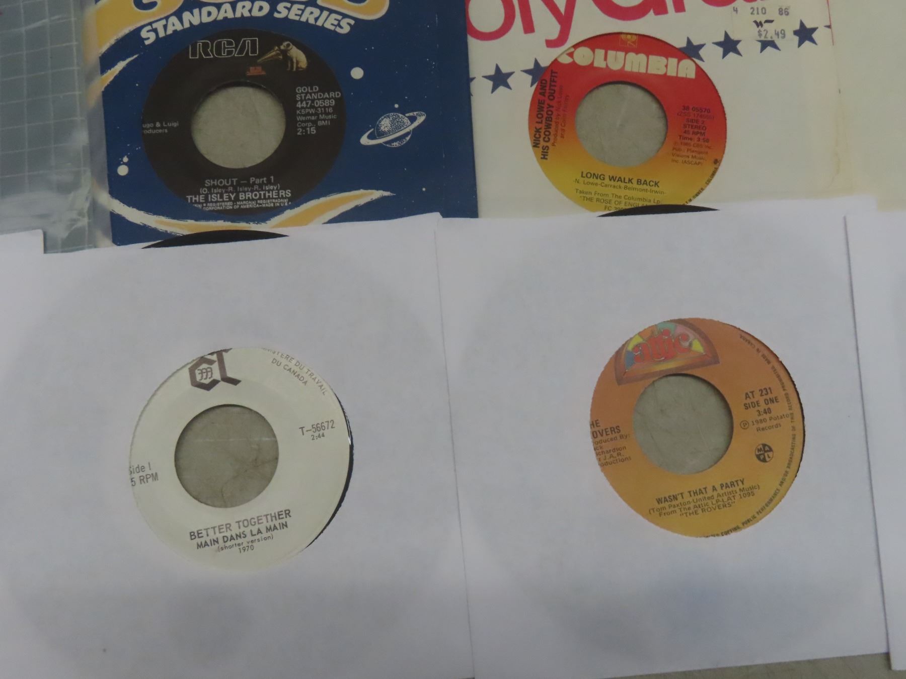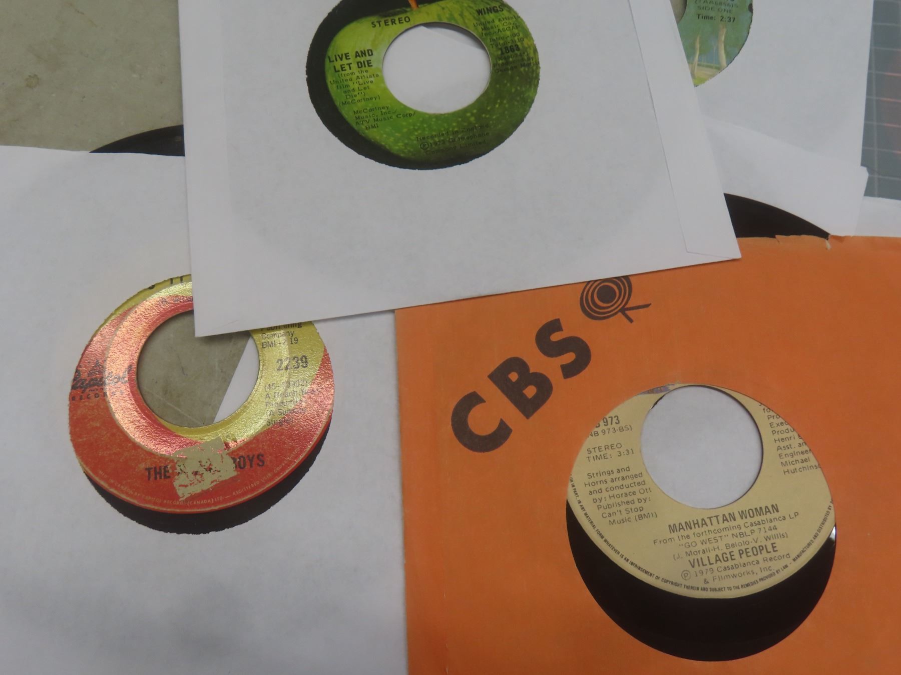 Nice Assortment of 40 Different 45rpm Records, 1960s–70s Era: Wings, Chubby Checker, Beach Boys, Don McLean, Troggs, Iggy Pop, Village People and More – All Very Fine