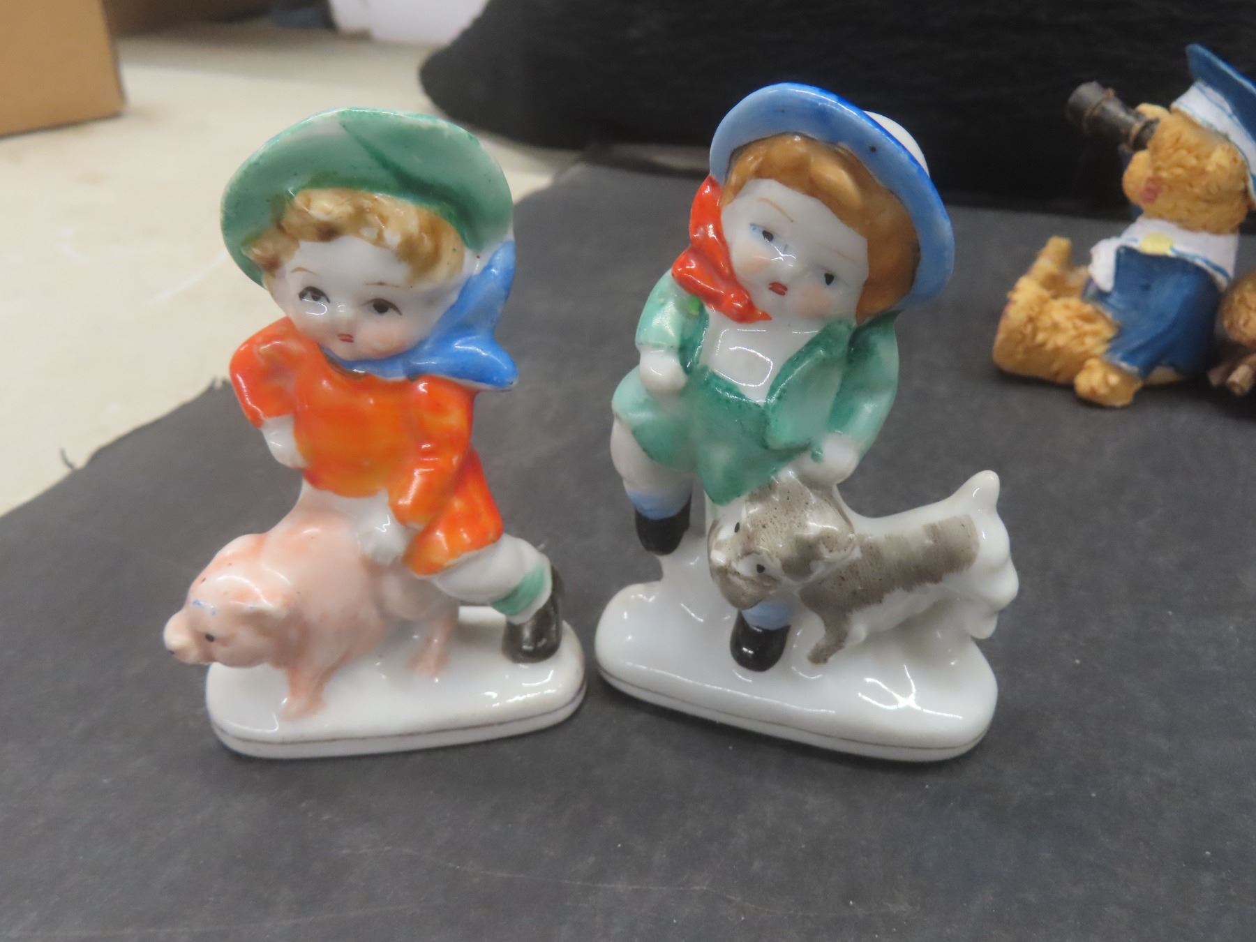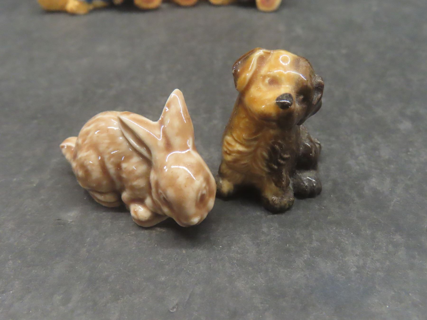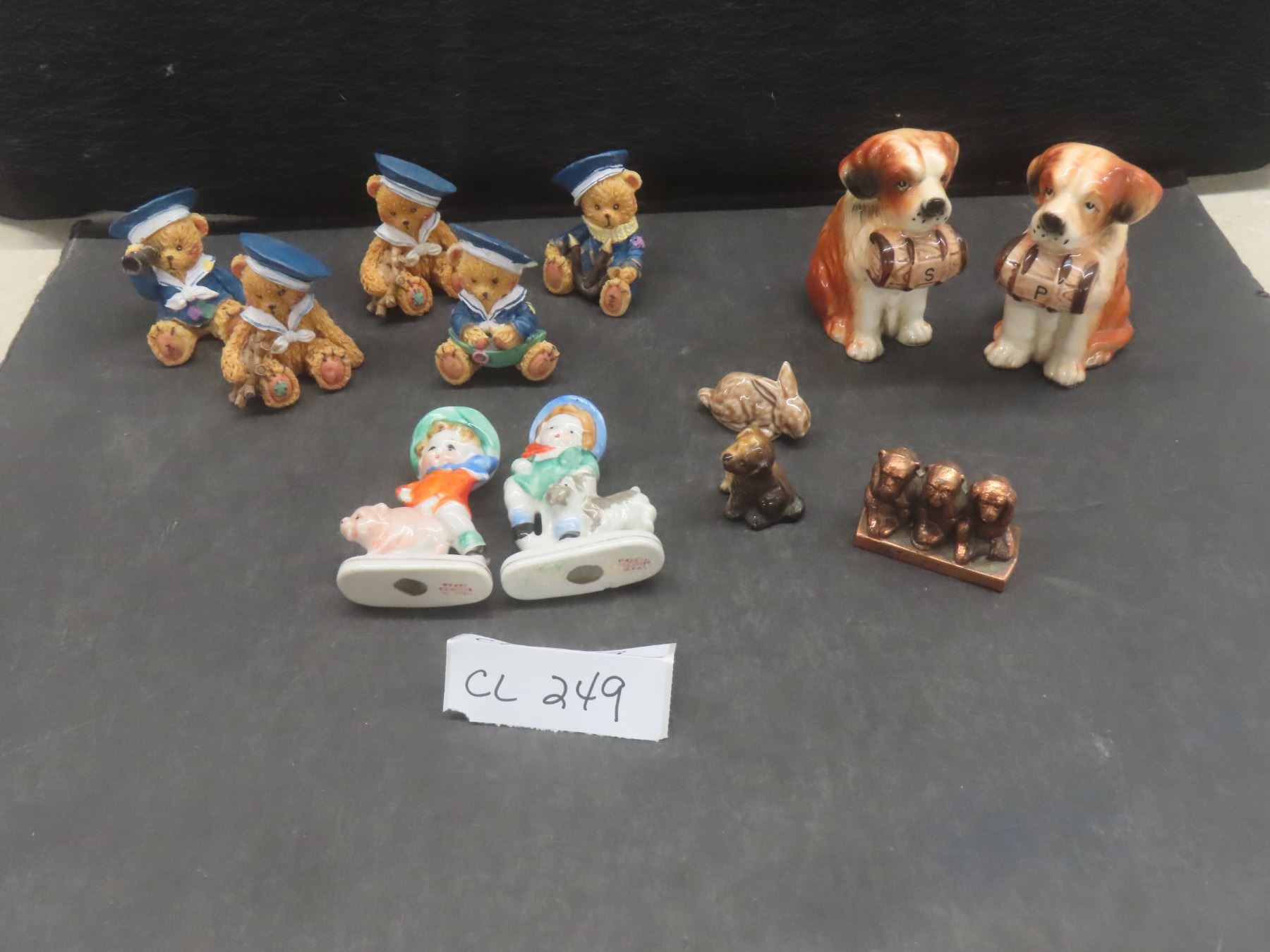 Assorted Figurines: St. Bernard Salt and Pepper Set; Copper See/Hear/Speak No Evil Monkeys; 2 Wade Tea Dog and Rabbit Figurines; 5 Teddy Bears; 2 Occupied Japan Figures