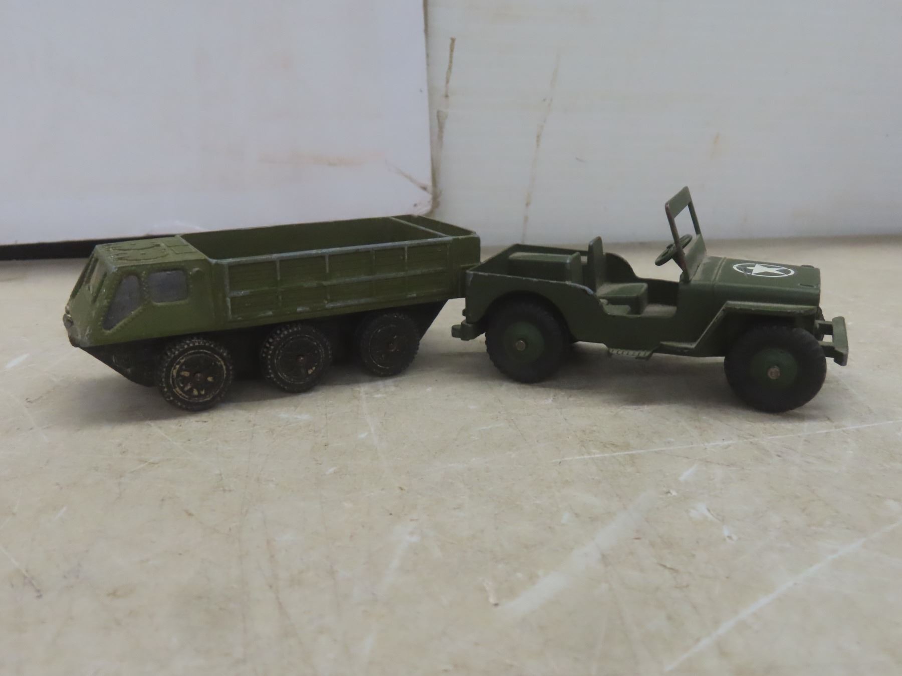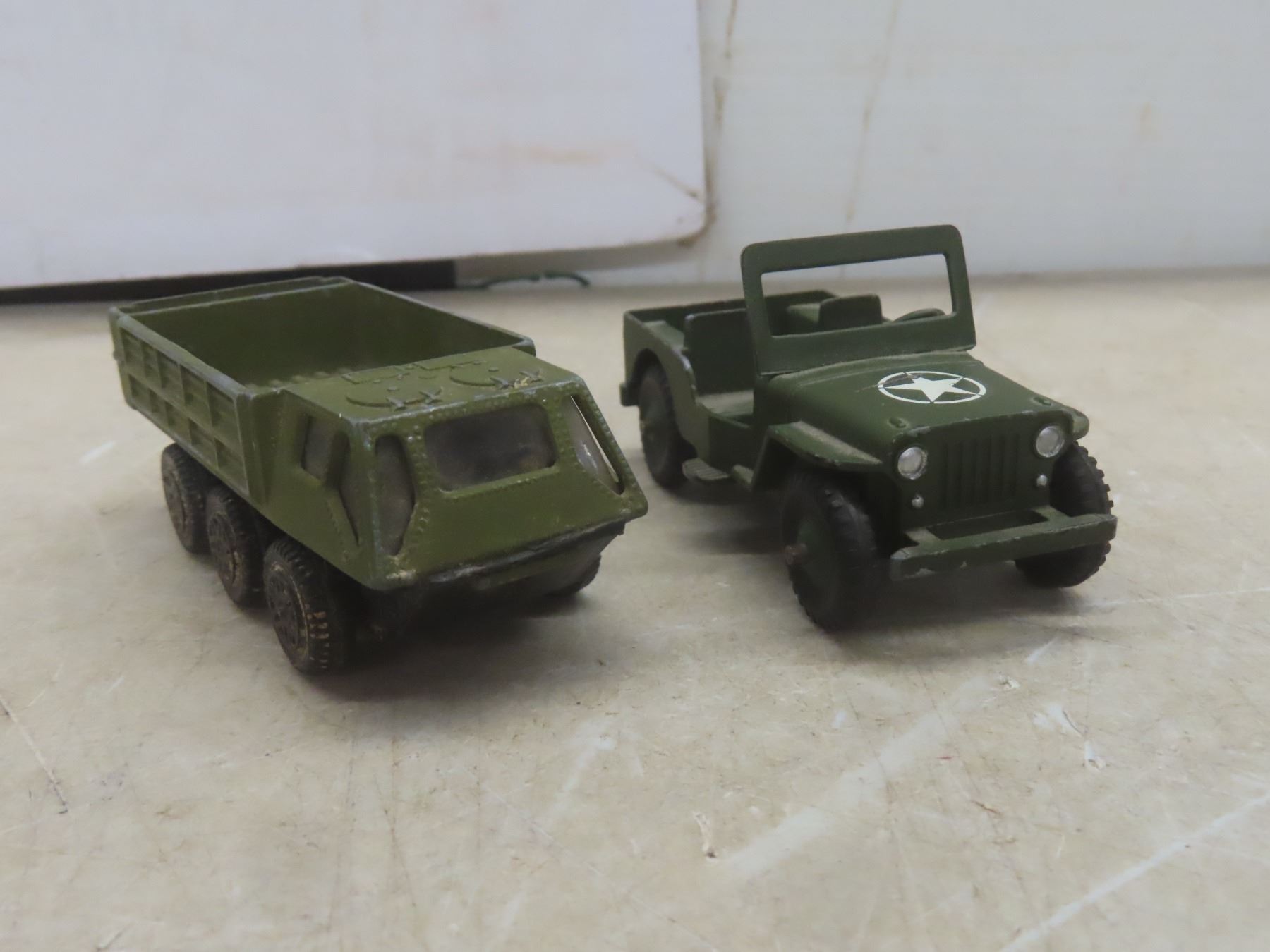 5 Army Toys: 4 Stalwart Dinky, 1 Lone Star Jeep, 4 Jeep Willys, 4 Unimax Tank – No Dinky Truck 420