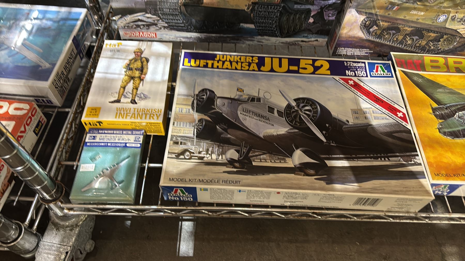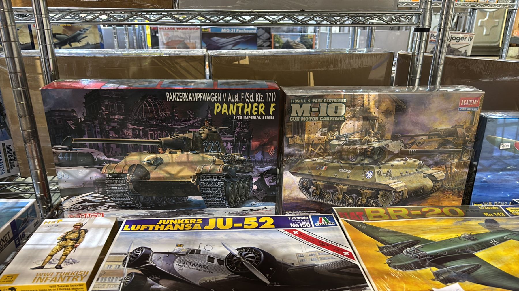 SHELF OF ASSORTED MODEL KITS: AIRPLANES, TANKS & MILITARY FIGURES