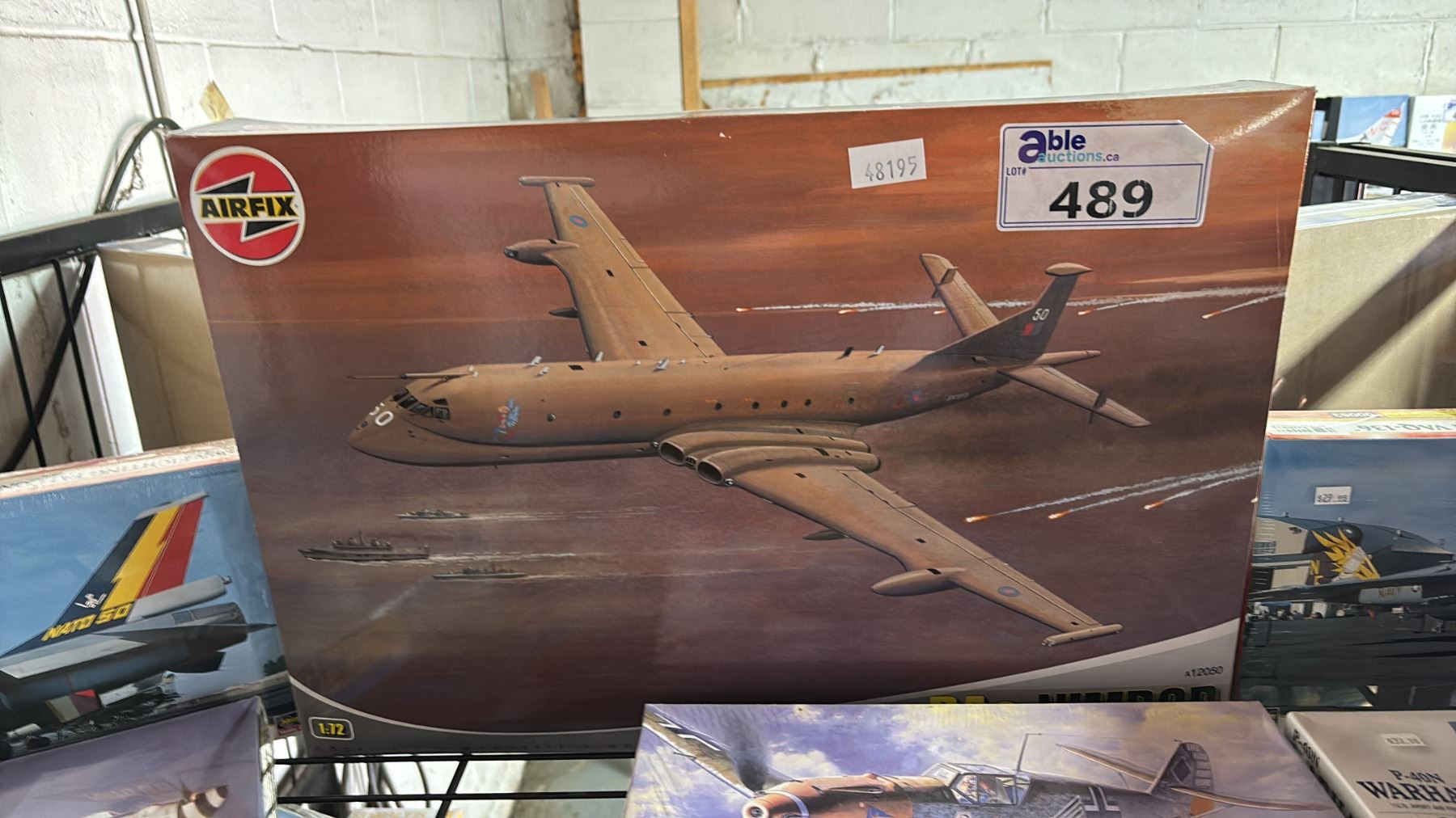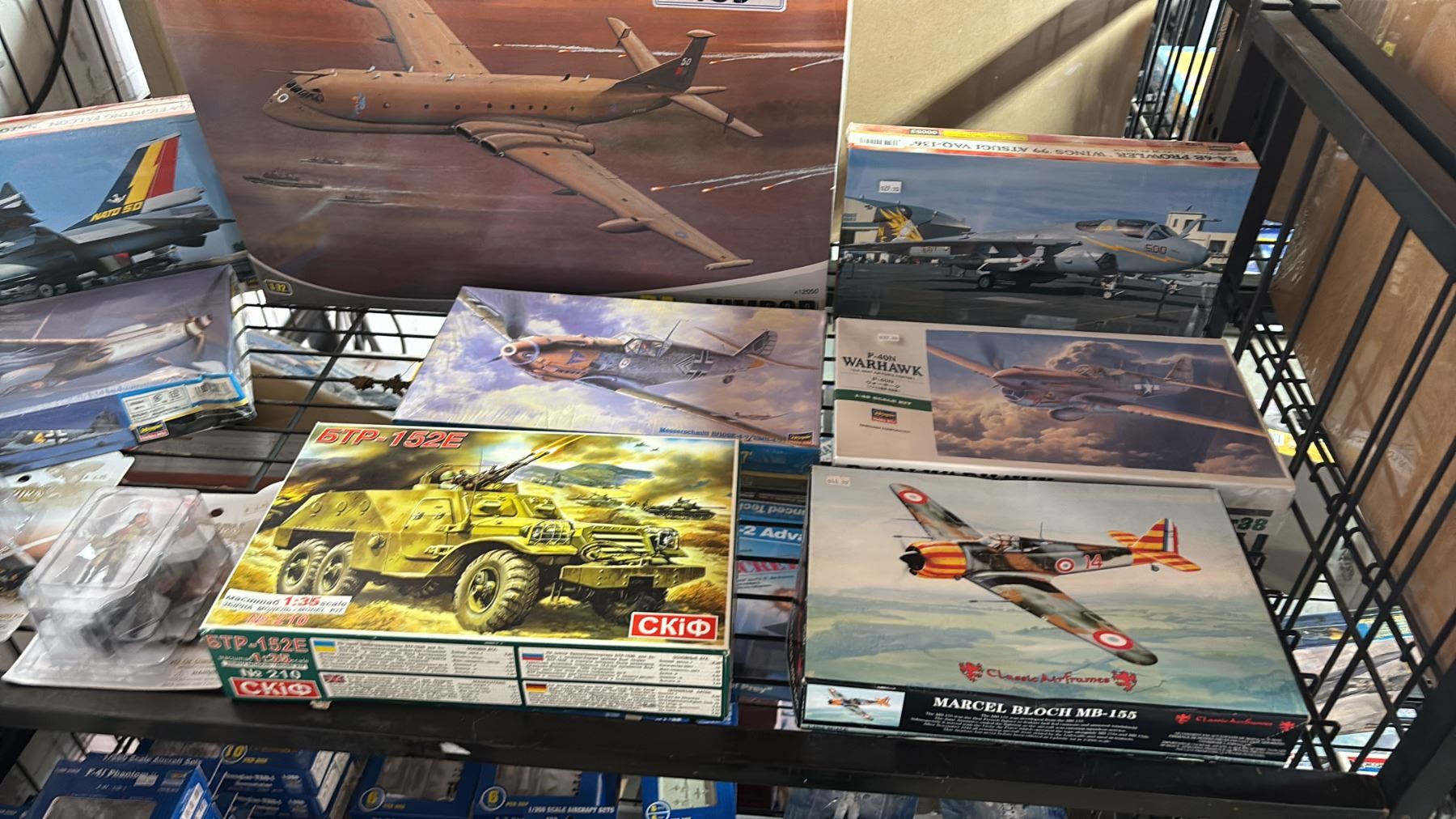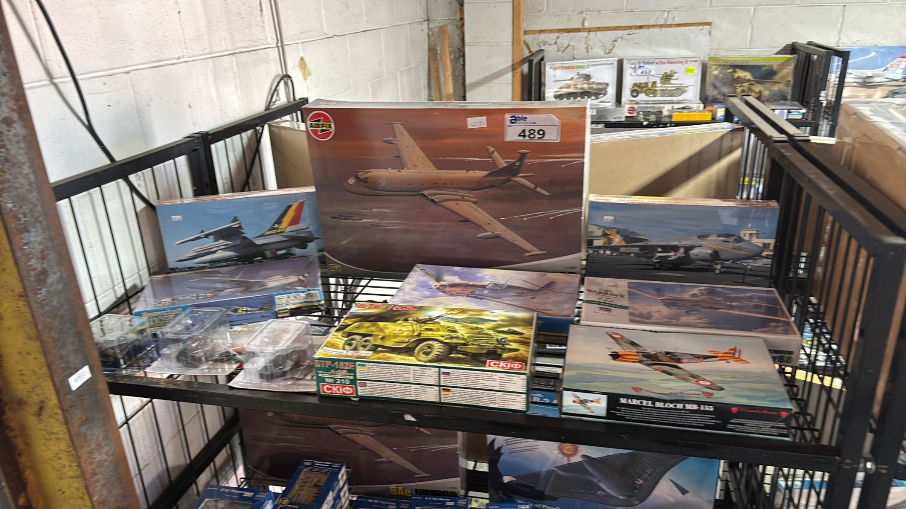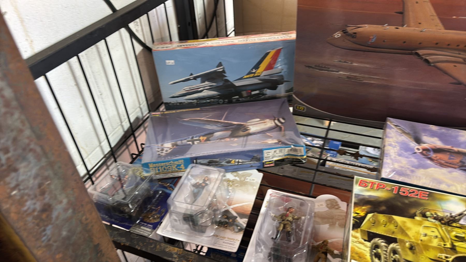 Lot 489 SHELF OF ASSORTED AIRPLANE & TANK MODEL KITS & ASSORTED FIGURINES
