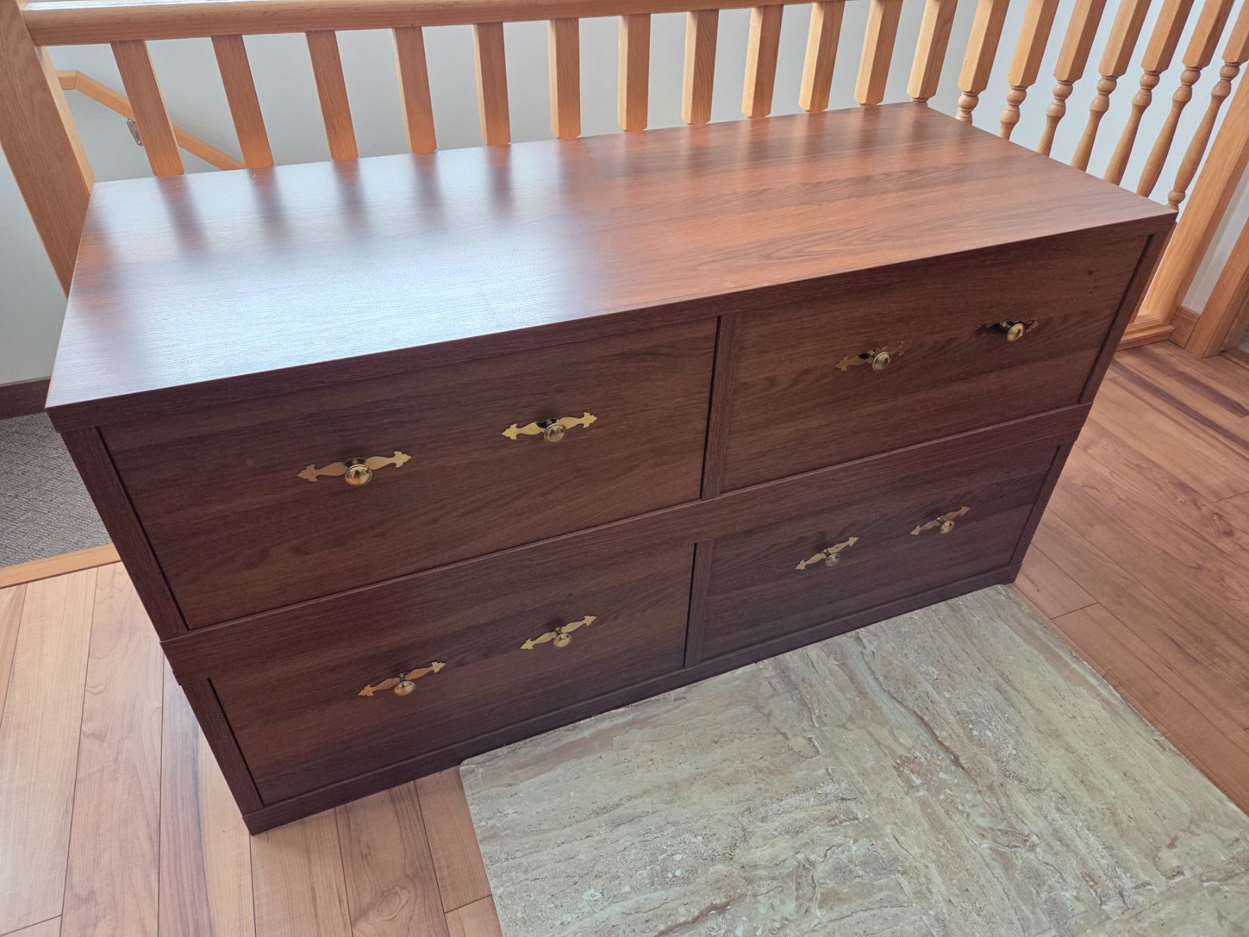 A sturdy and wide four-drawer cabinet featuring a rich wood-grain finish