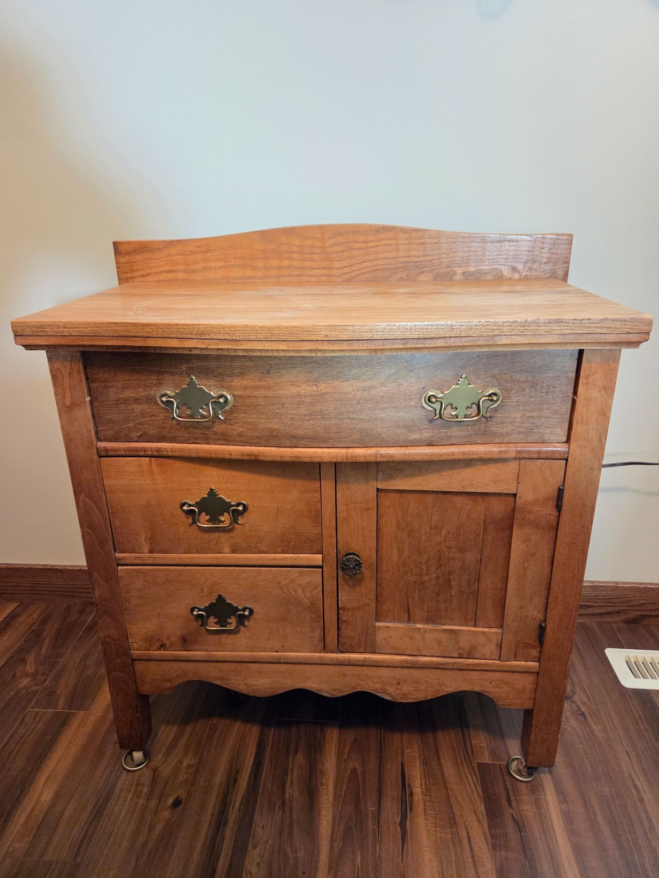 Three spacious drawers alongside a side storage cabinet, all set on vintage metal casters for easy mobility.
