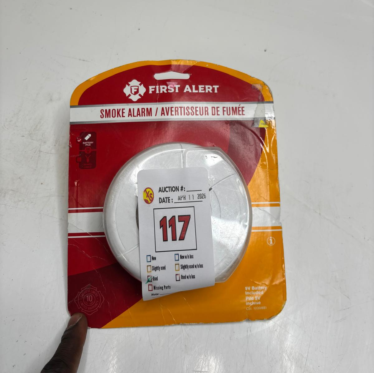 Lot 117 FIRST ALERT HARDWIRED 120 V WHITE IONIZATION SMOKE DETECTOR WITH BATTERY BACKUP -U