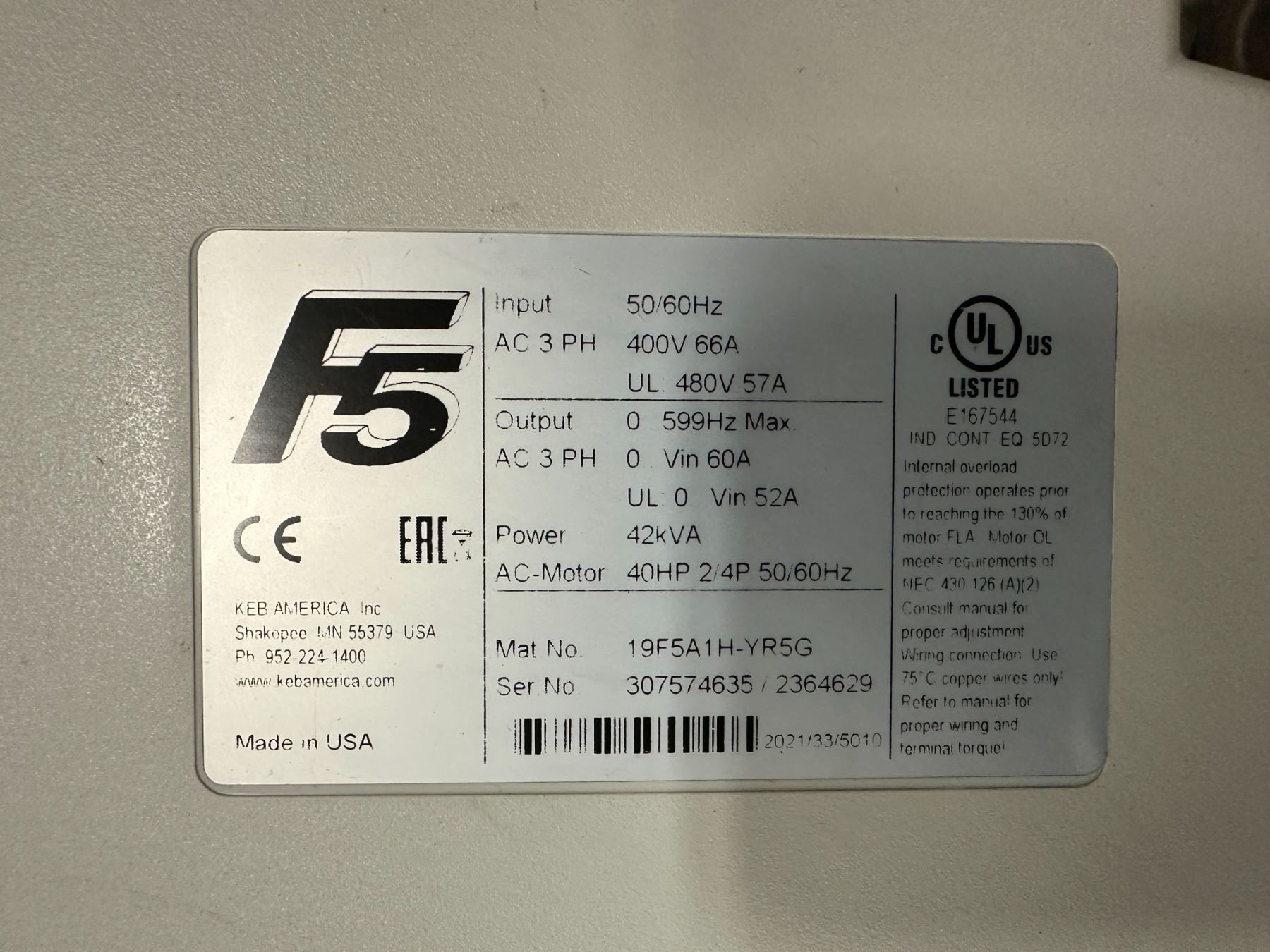 Lot 275P Keb #19F5A1H-YR5G Variable Frequency Drive
