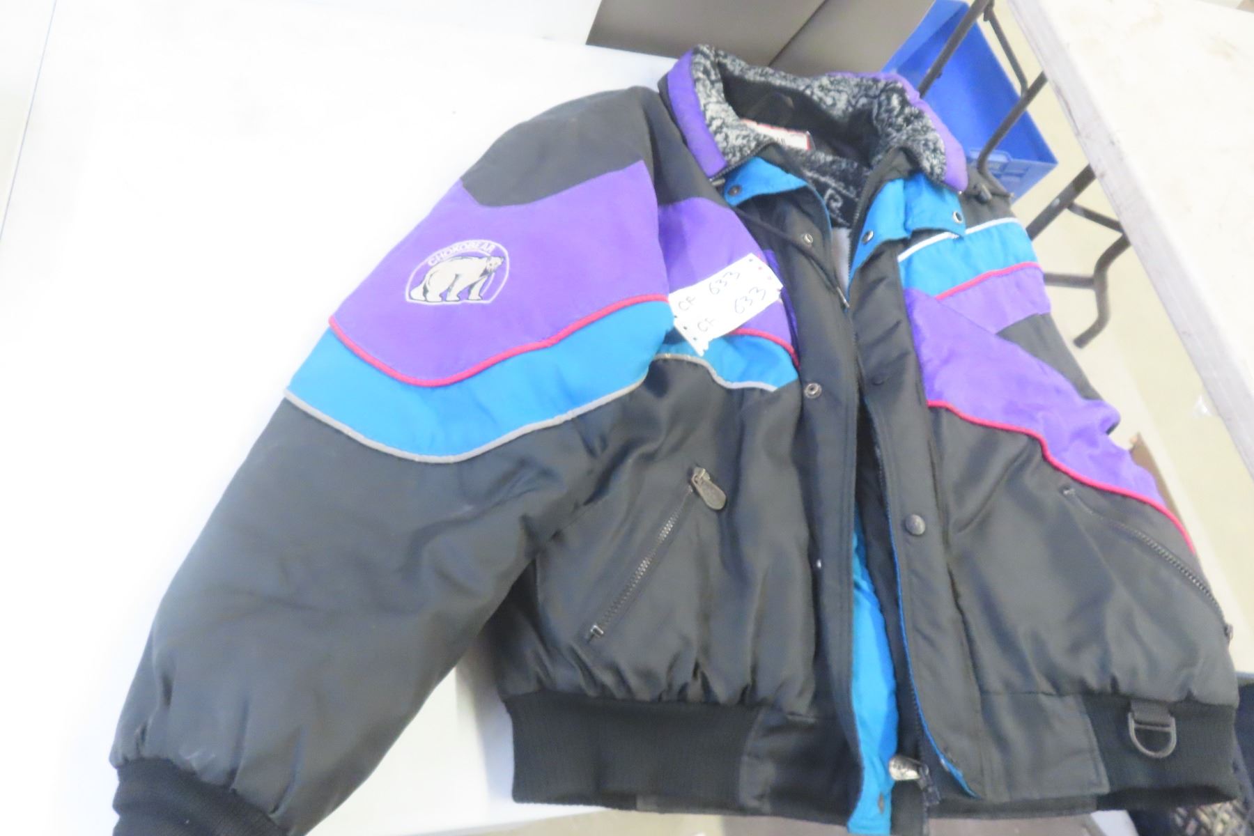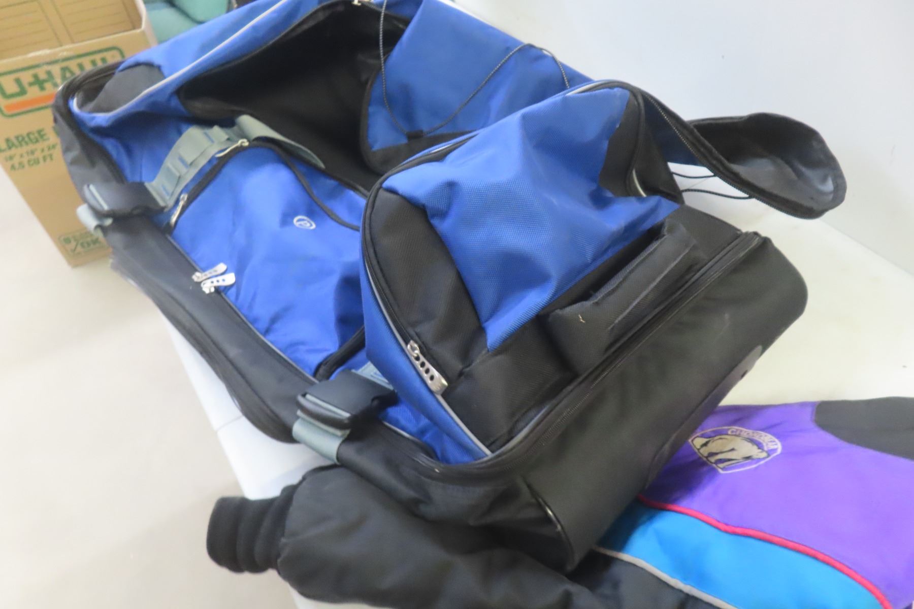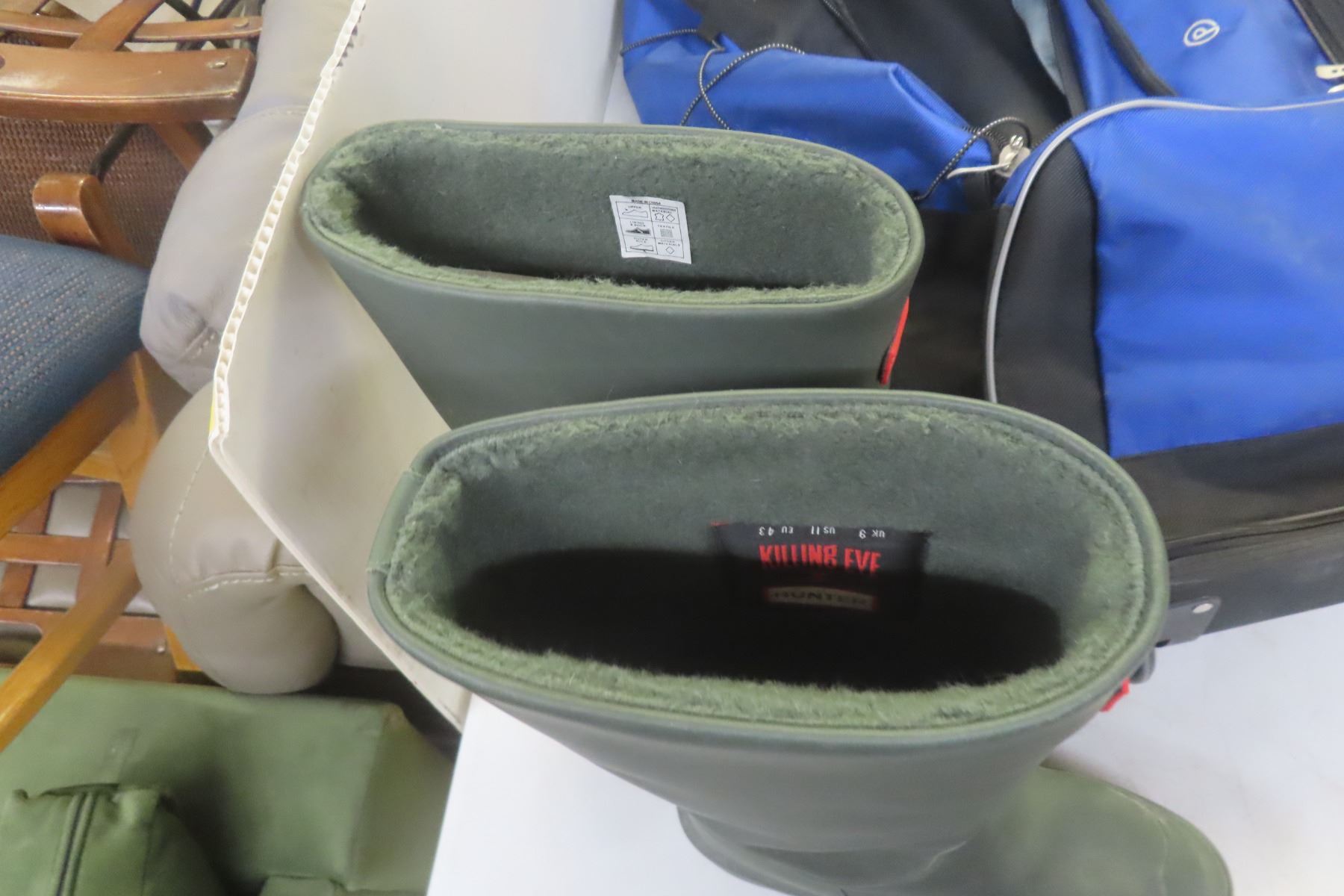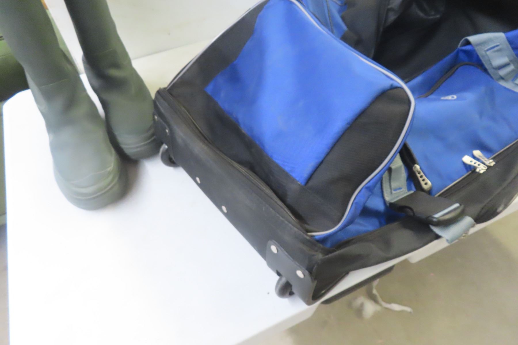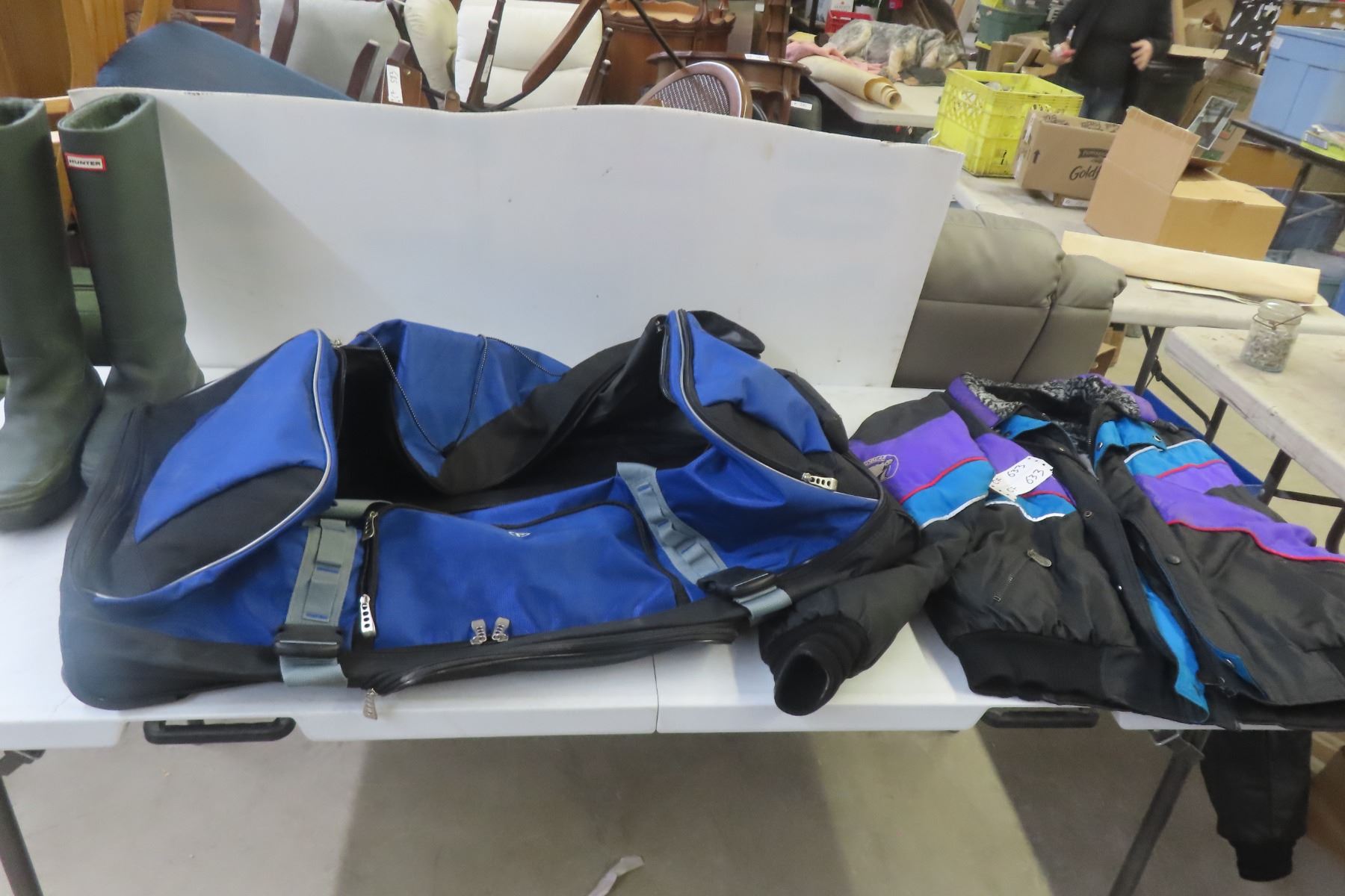 Lot 633 Rolling Hockey Bag, Size 11 Insulated Rubber Boots, Large Winter Jacket
