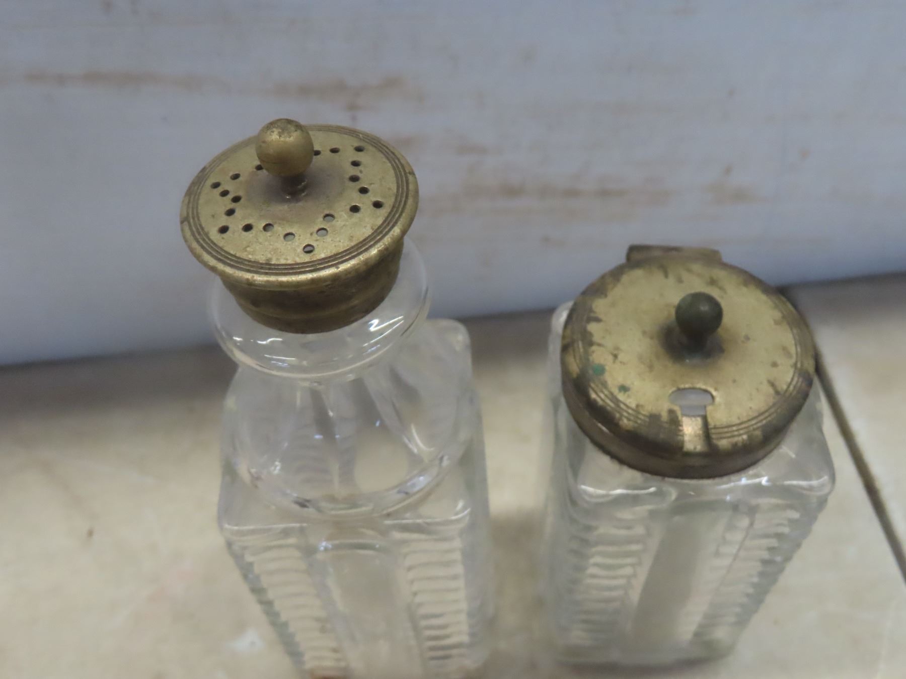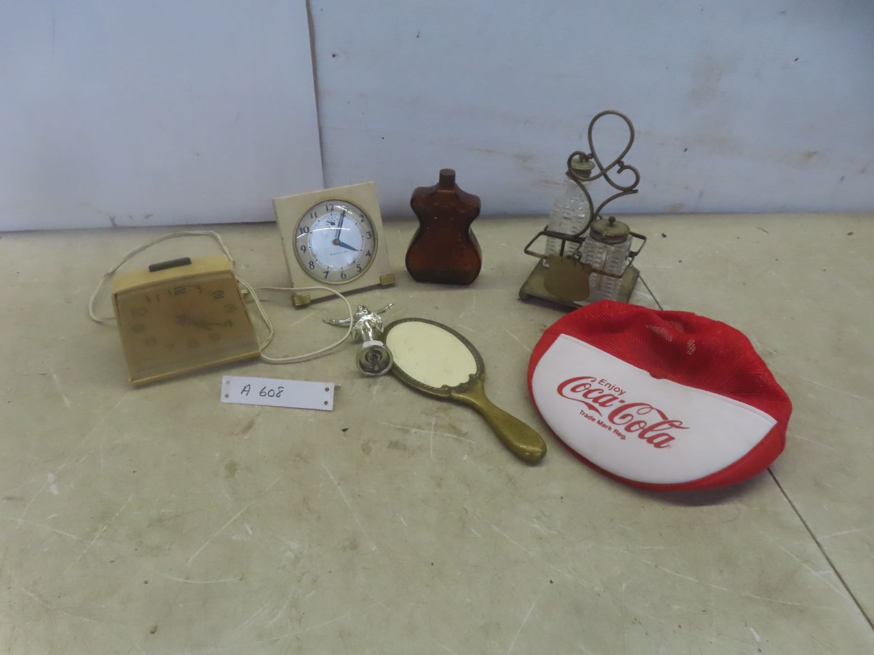 2 Vintage Clocks: Westclox and Ingraham – Damaged; Denver Vanity Mirror; Avon Cologne Bottle; 3-Piece GF Cruet Set