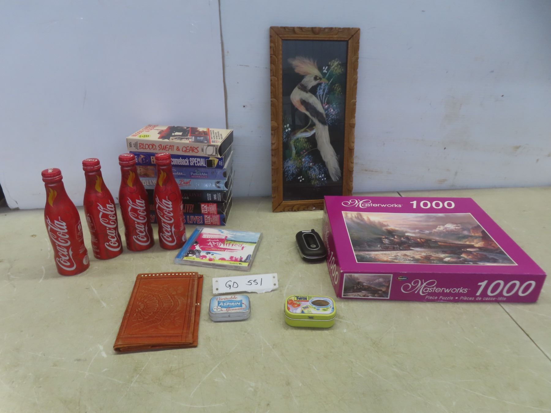 Vintage Folk Art: Feathercraft Framed Picture, 15?" × 8"; 4 Limited Edition Coca-Cola Aluminum Bottles; VHS Tapes; Leather Wallet and More