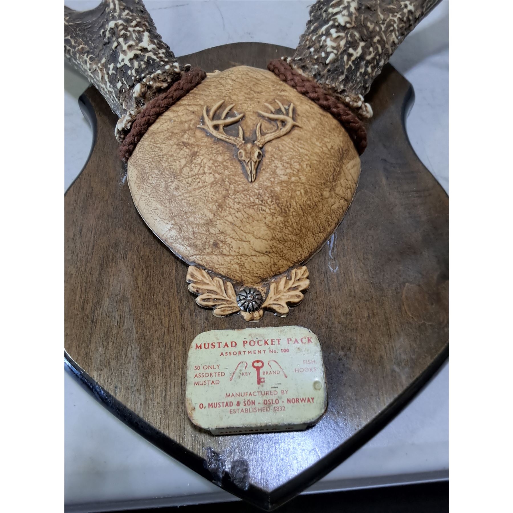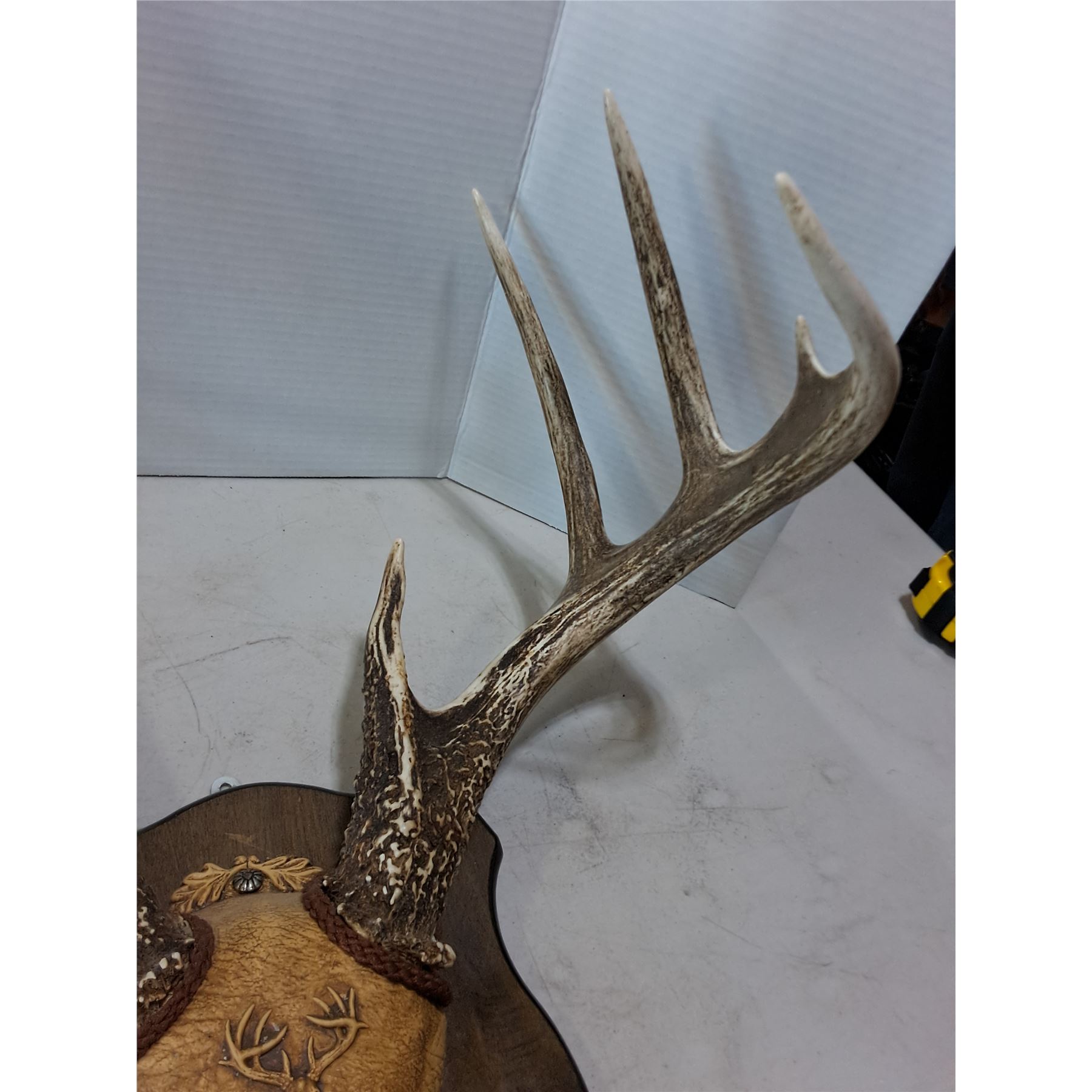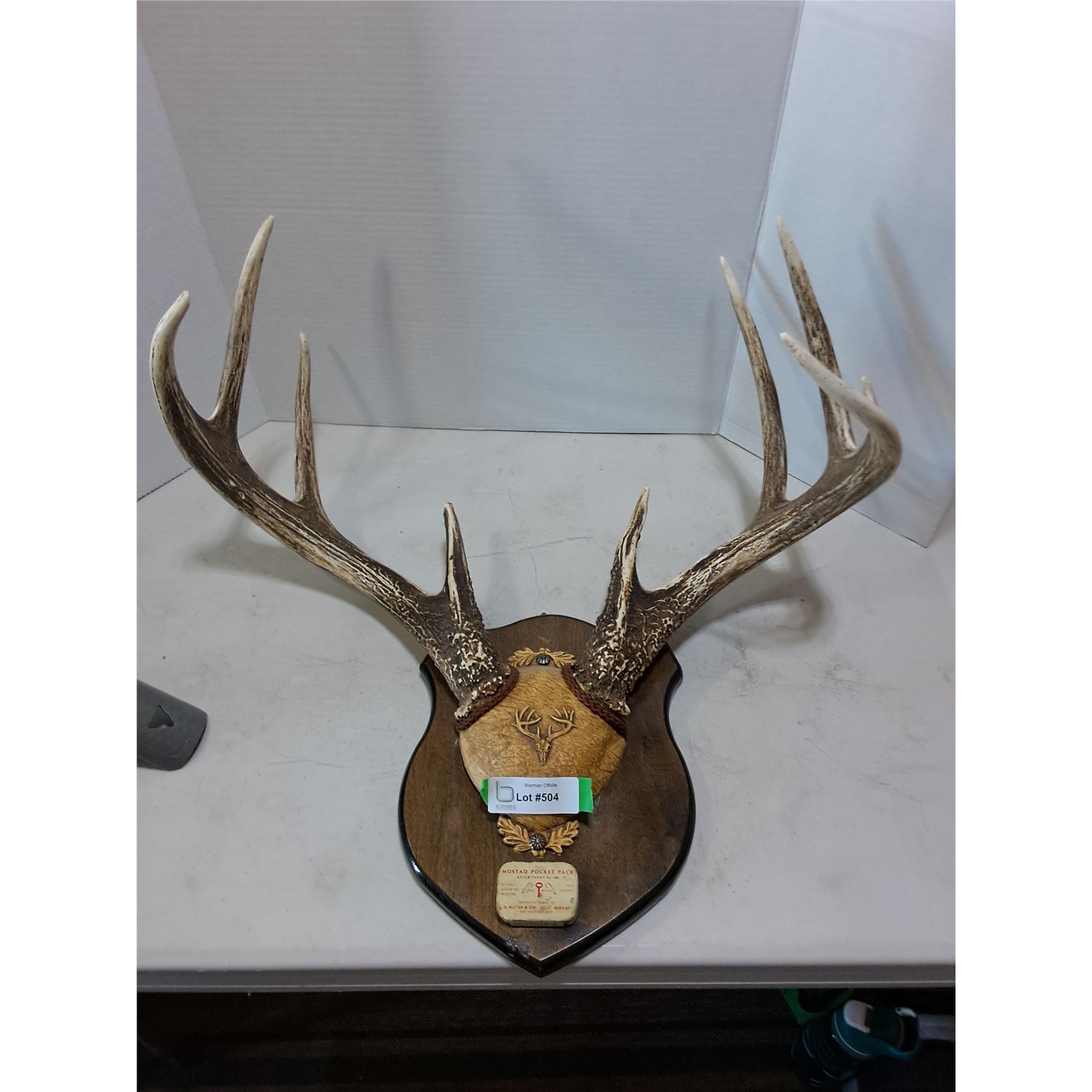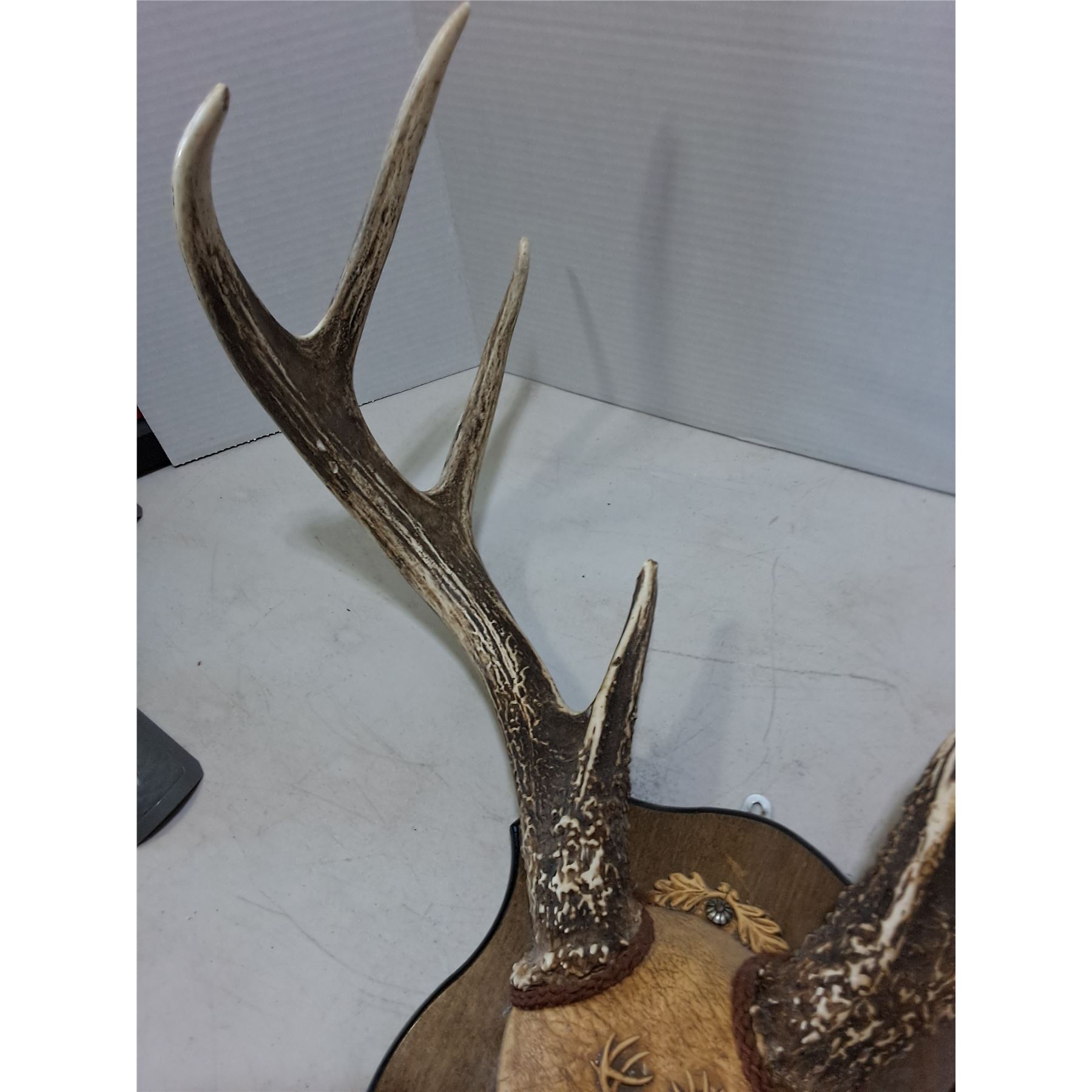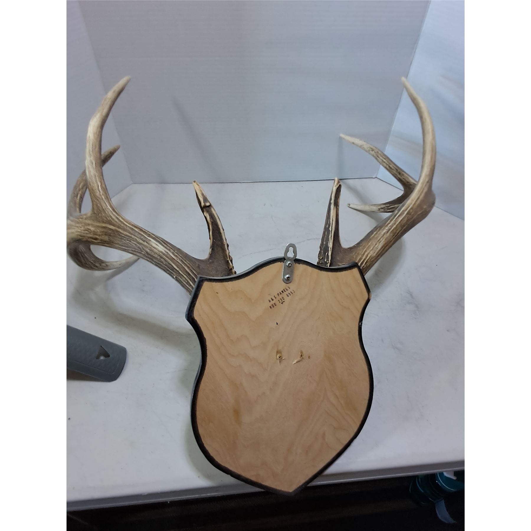 Lot 504 Vintage 9-Point Mounted Deer Horn Rack on Wooden Plaque - Horns 21" Width - PICK UP ONLY