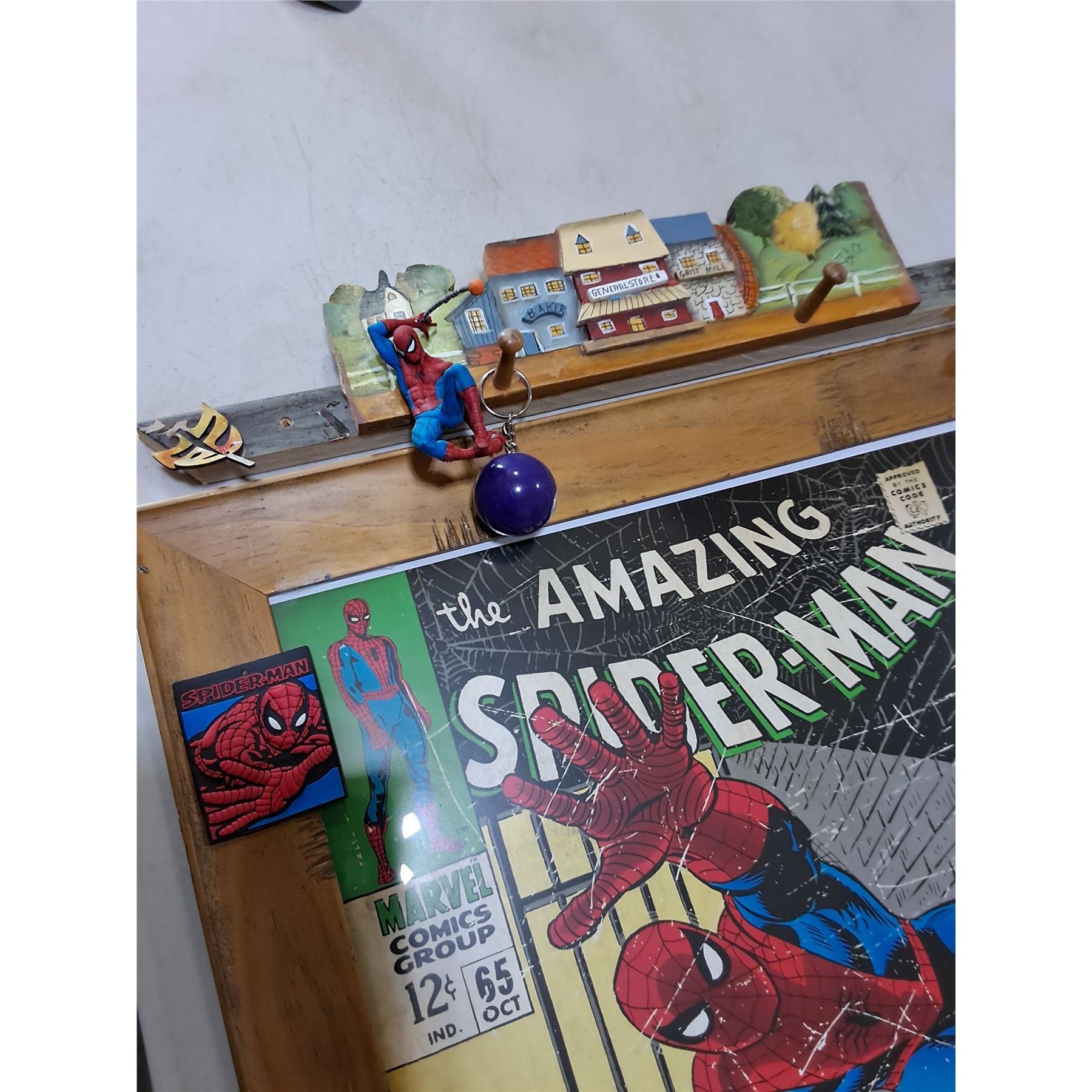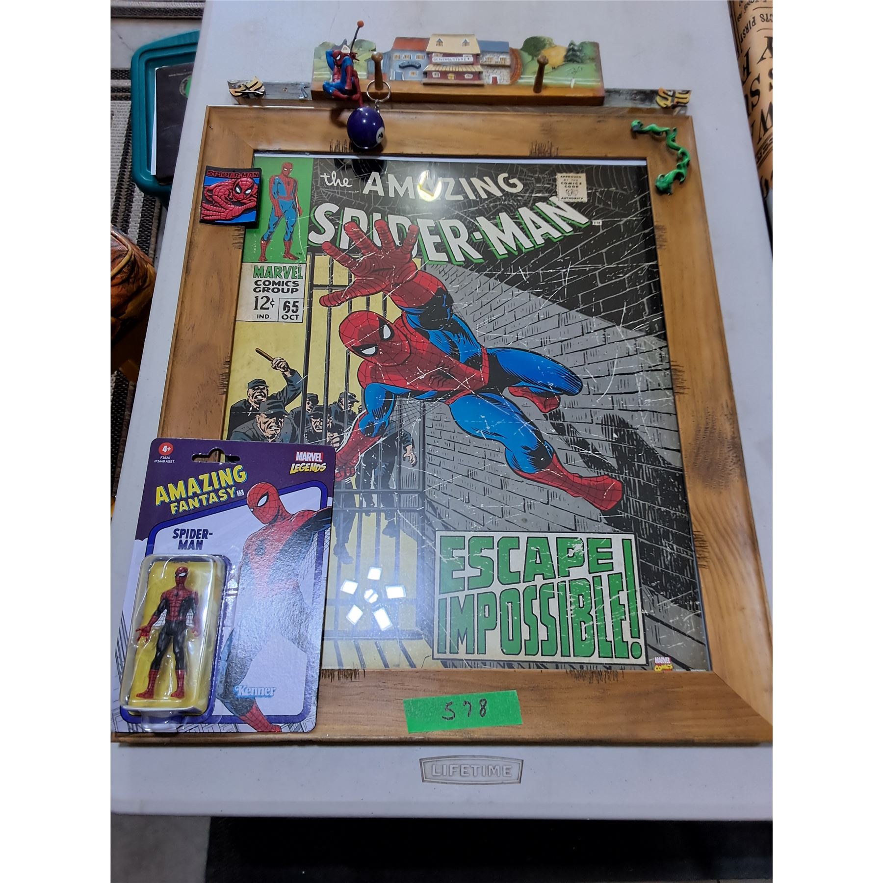 Lot 578 Spider-Man Memorabilia (Framed 24" x 20" Comic Book Poster w/Coat Rack on top, NIB Figure) -PU