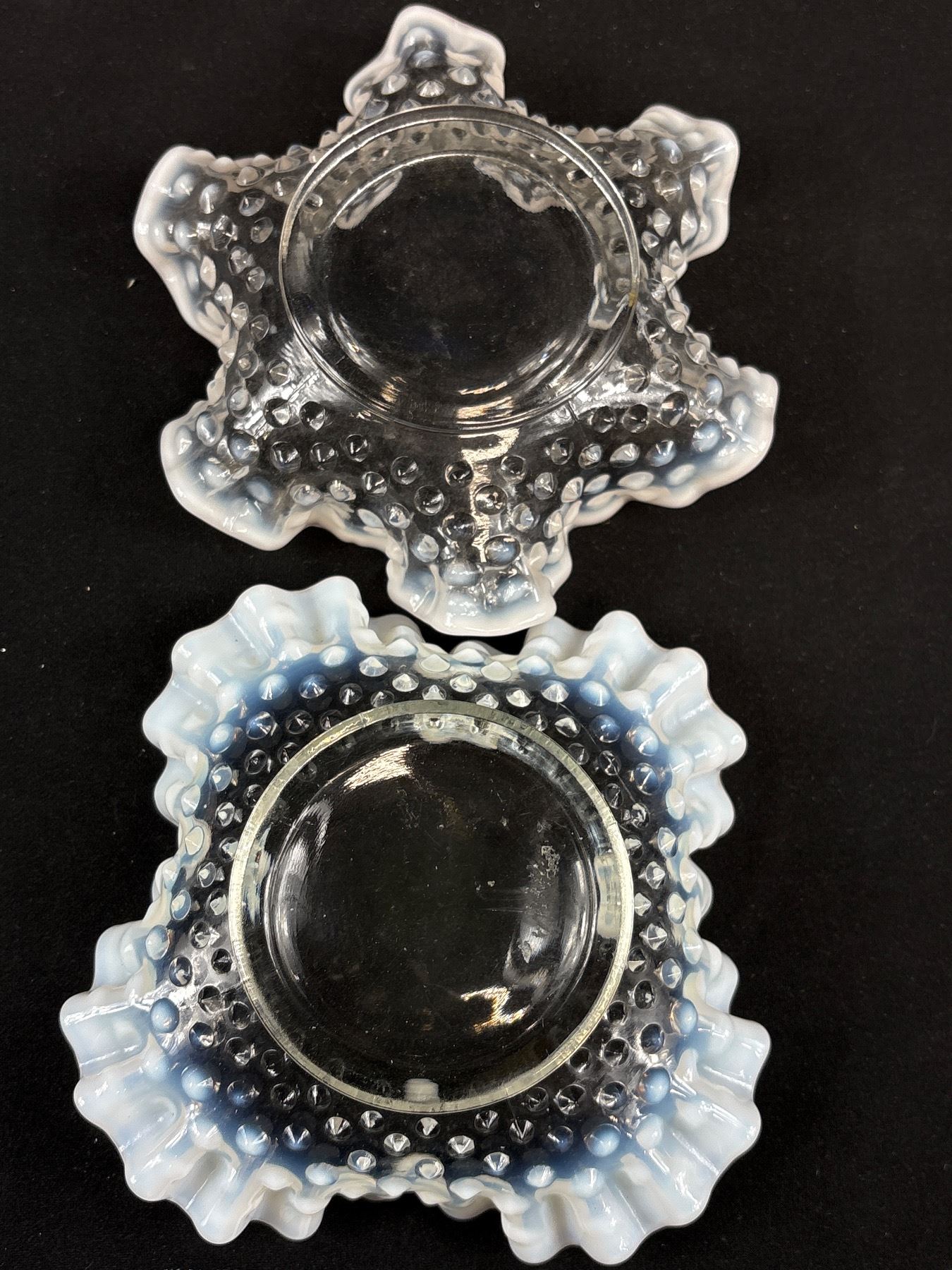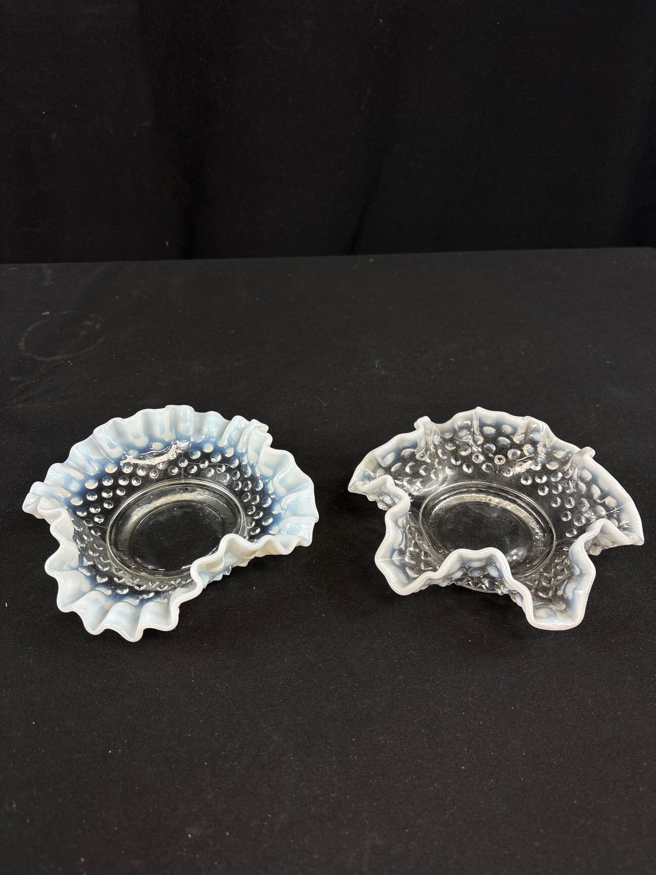 2 Vintage Fenton French Opalescent Hobnail Ruffled Edge Bon Bon Dishes