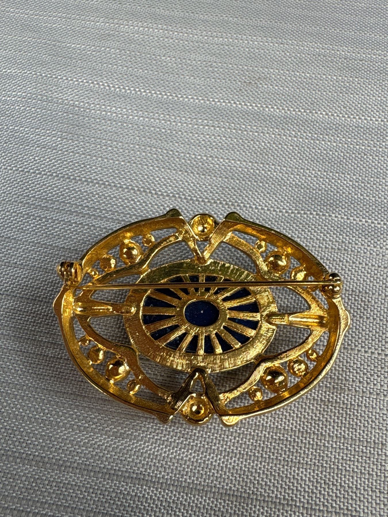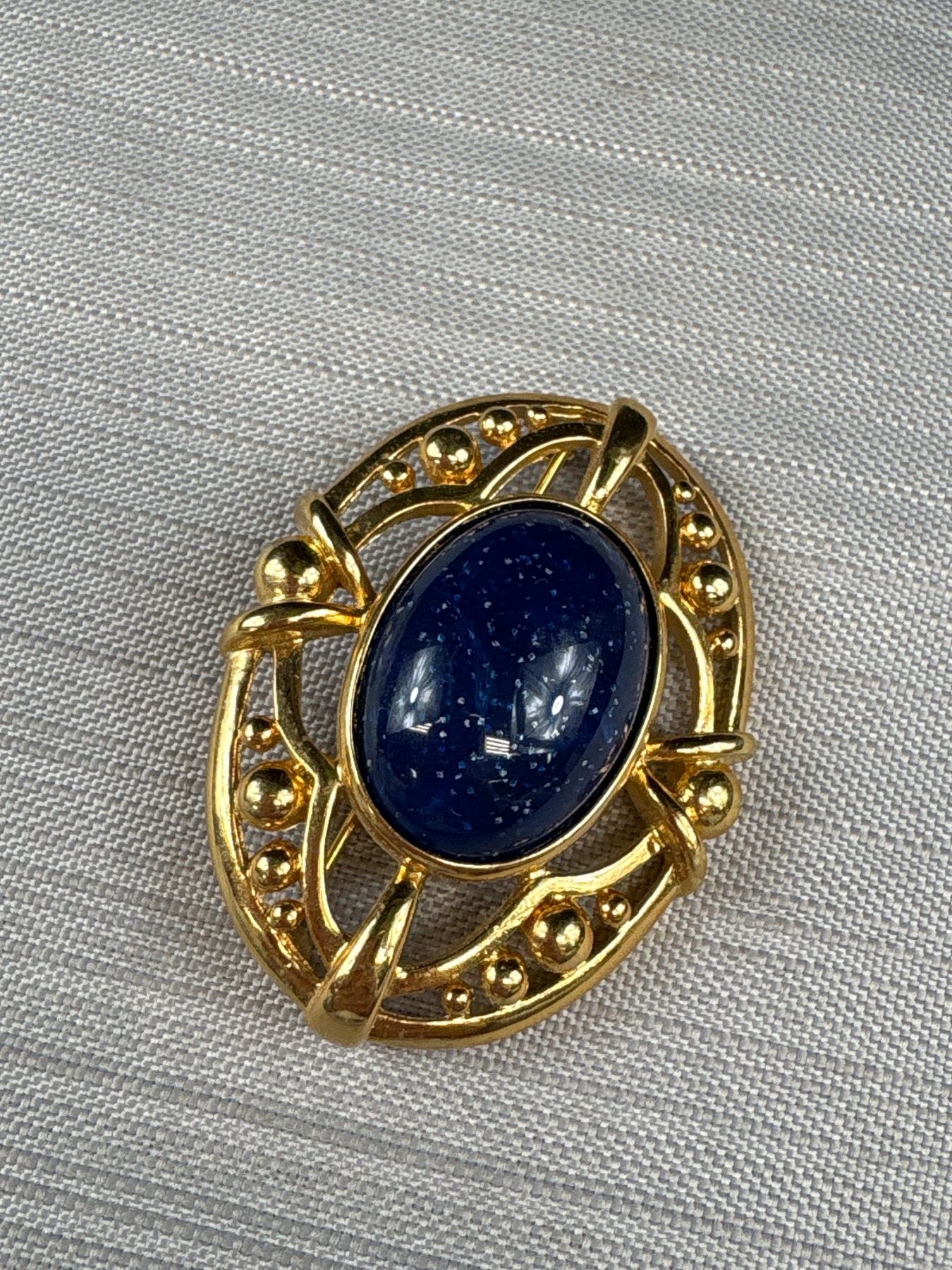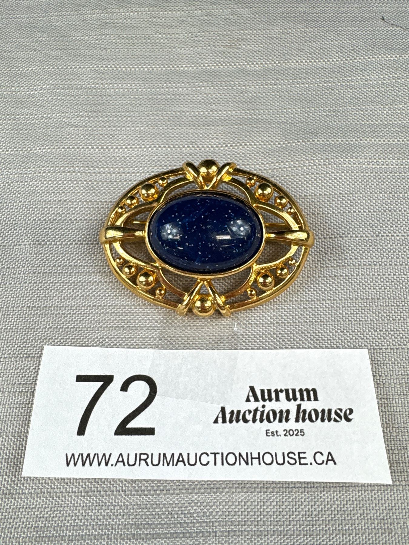 Lot 72 Vintage Gold Tone Brooch w/ Navy Blue and White Flecked Coloured Gemstone