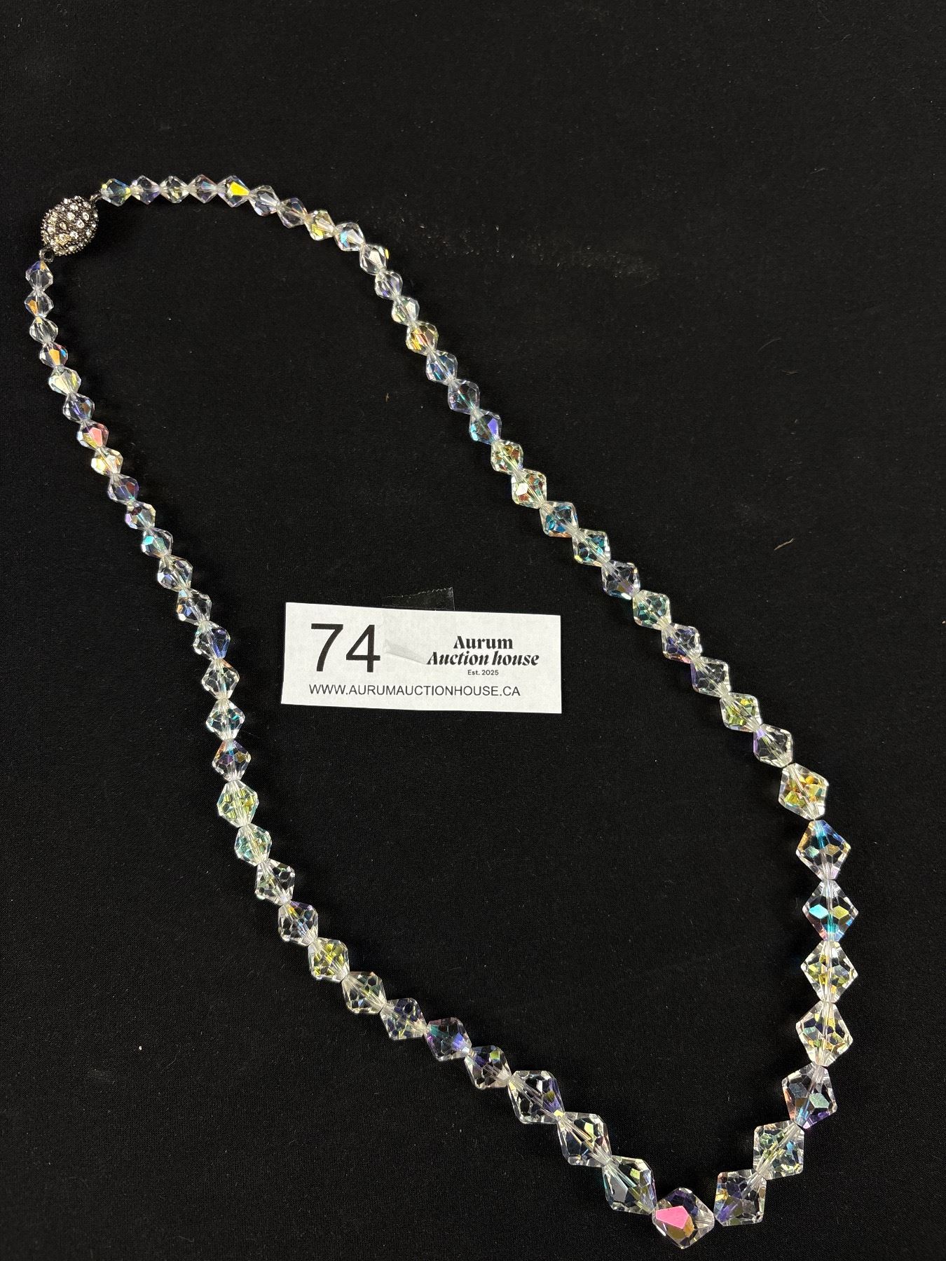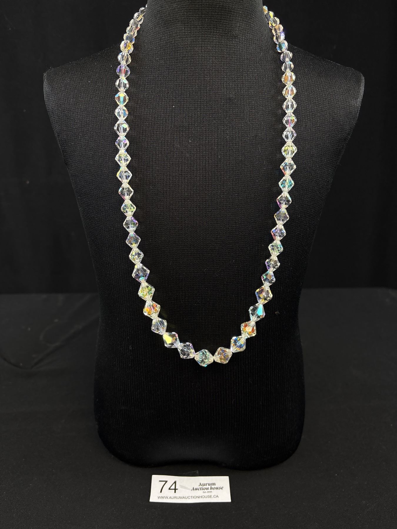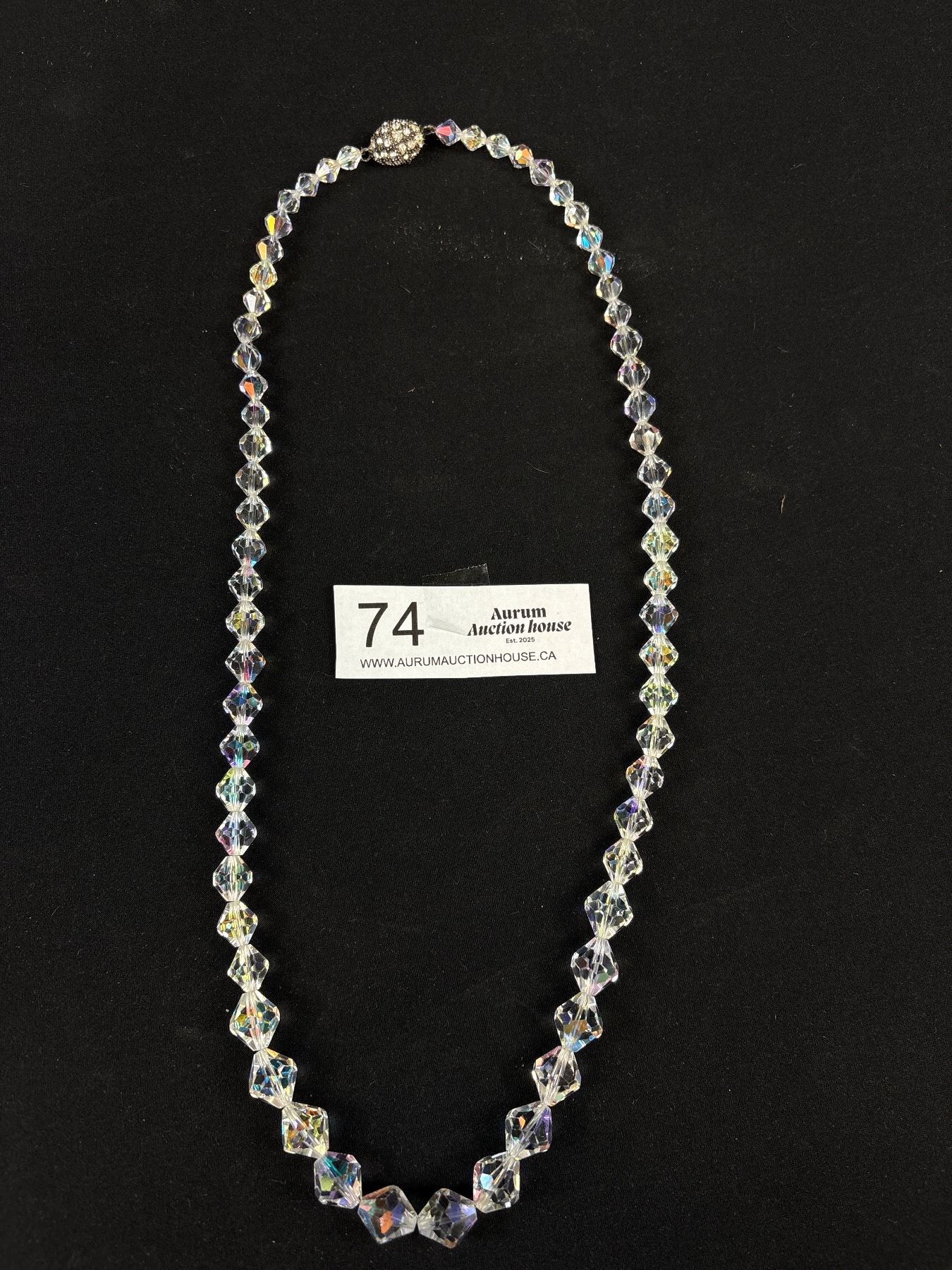 Lot 74 Vintage 1950 Aurora Borealis Crystal Necklace w/ a Rhinestone Barrel Magnetic Clasp 26" Long