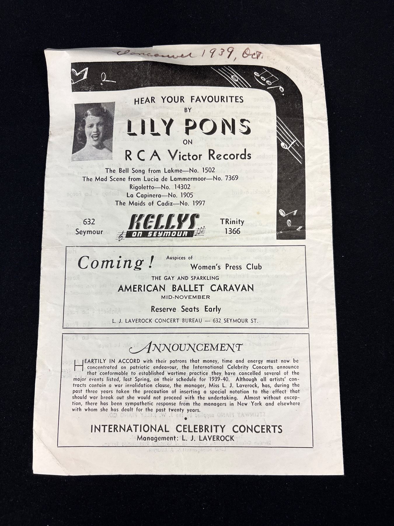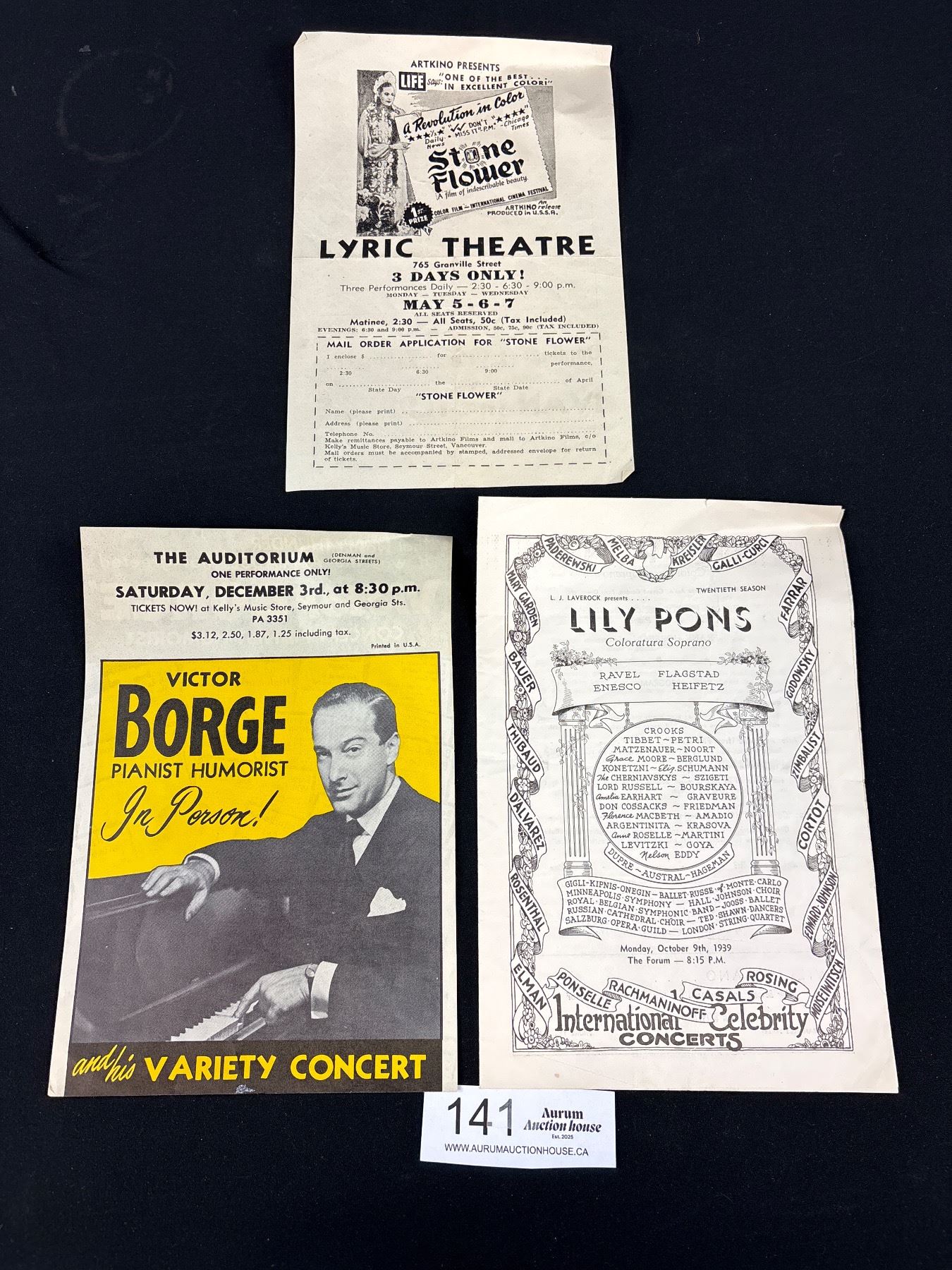 Lot 141 3 Early Theatre/Concert Flyers + Programmes All Vancouver