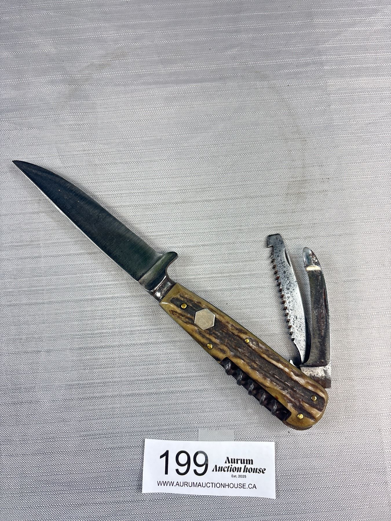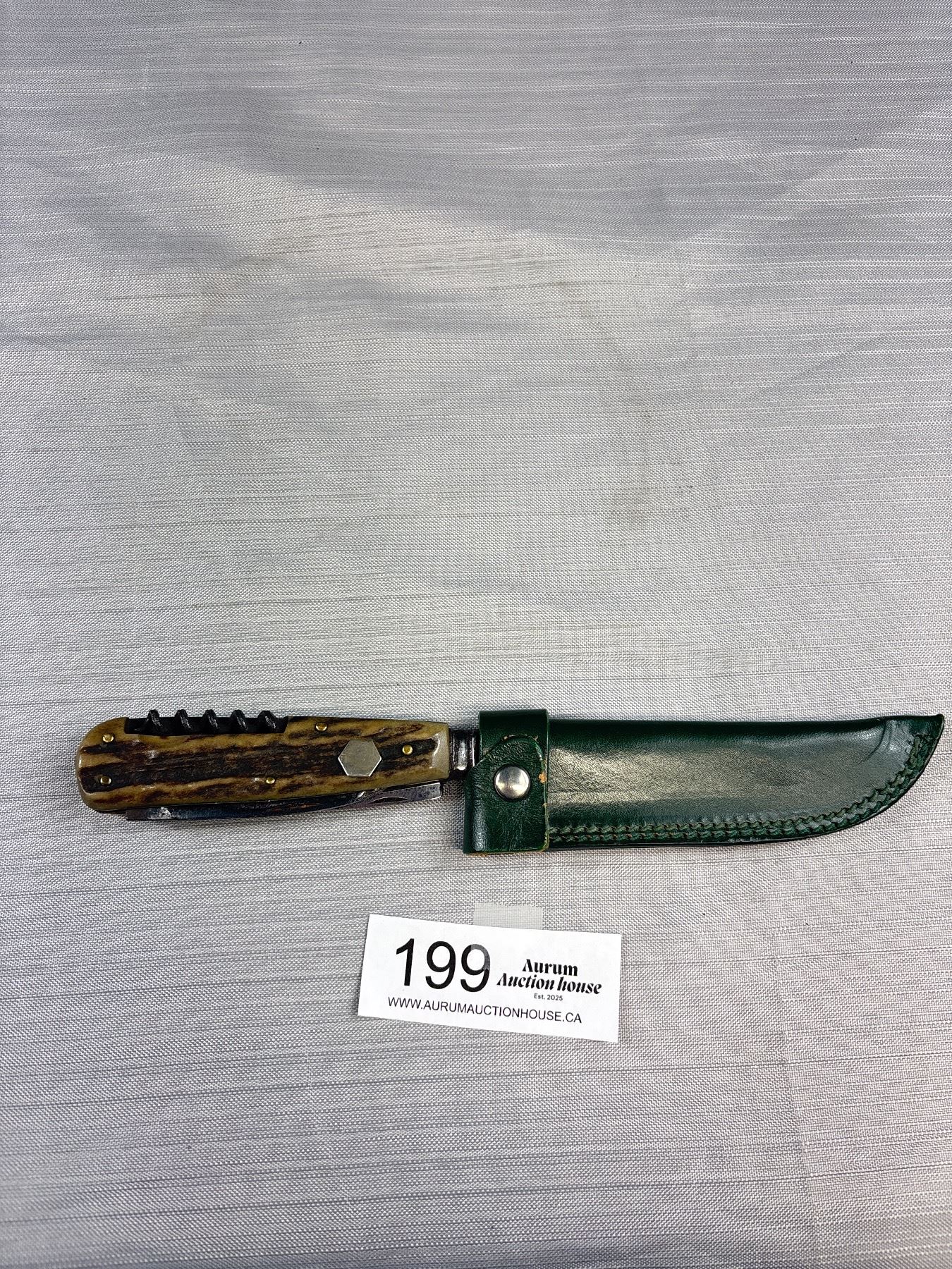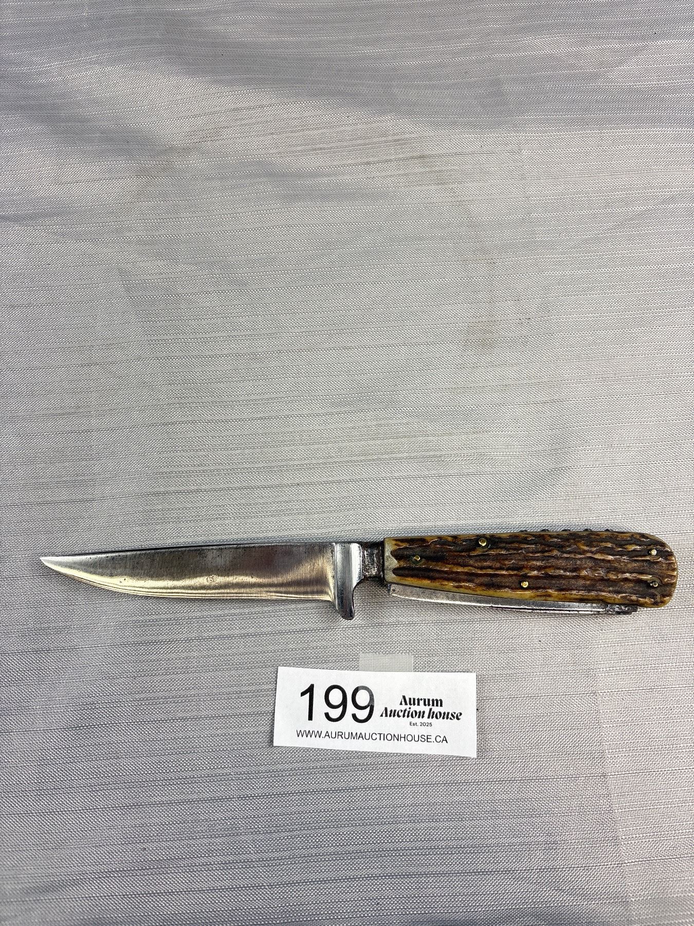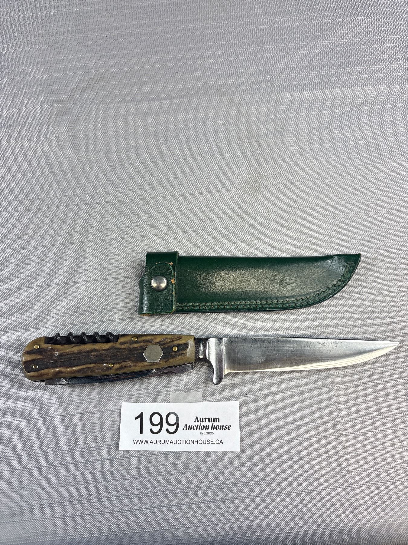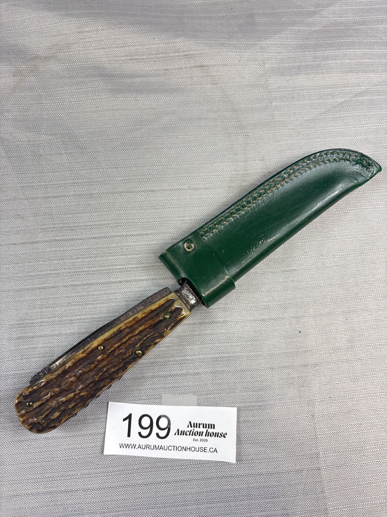 Lot 199 Vintage Stag Handle Knife with Sheath Puma? 800 Silver Tag on Side
