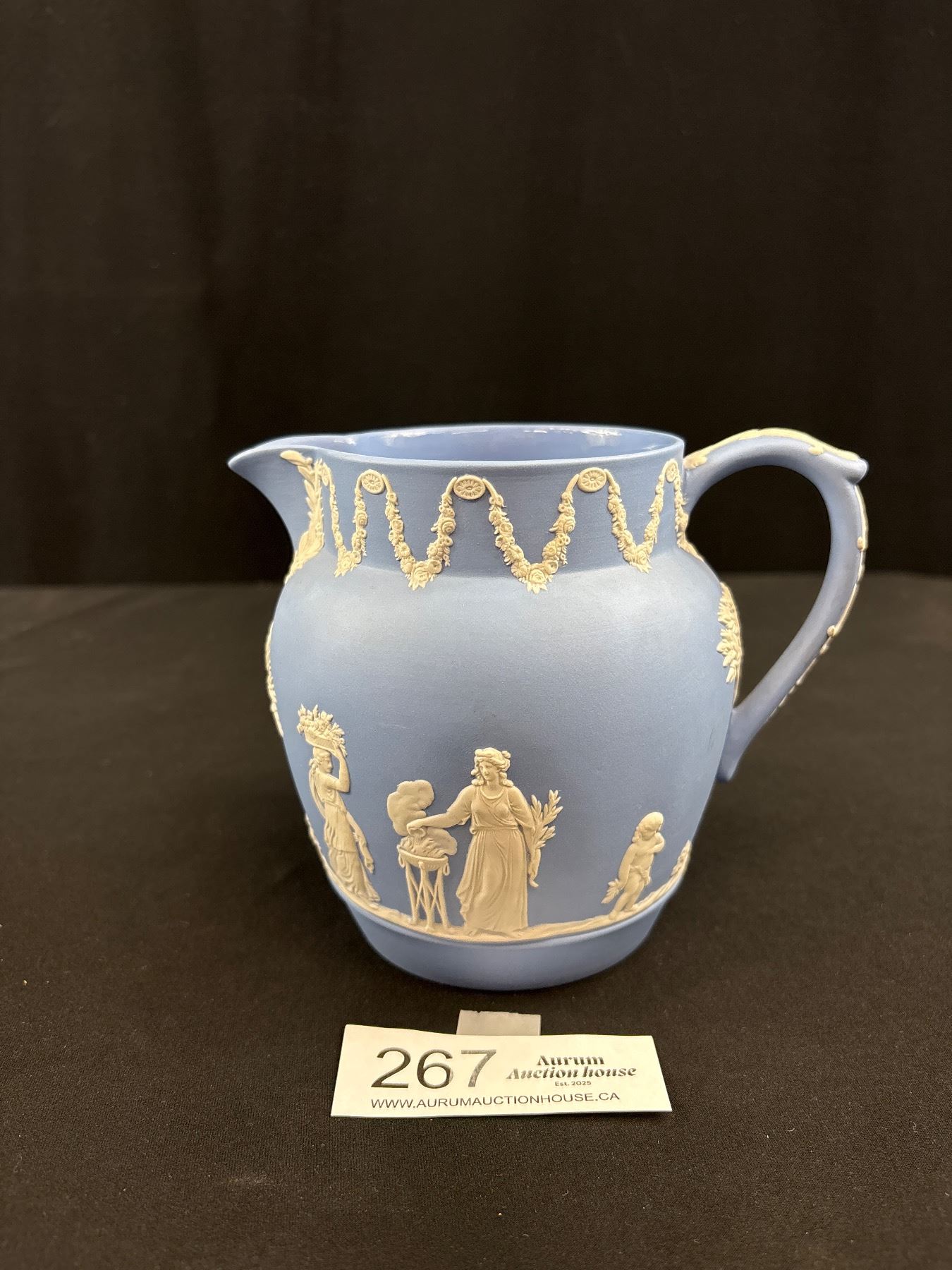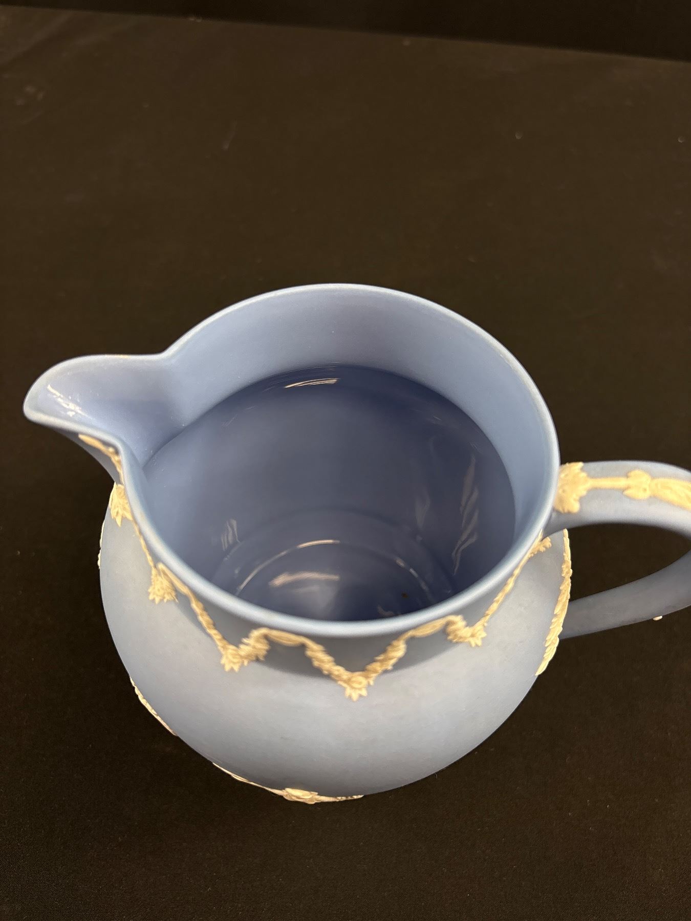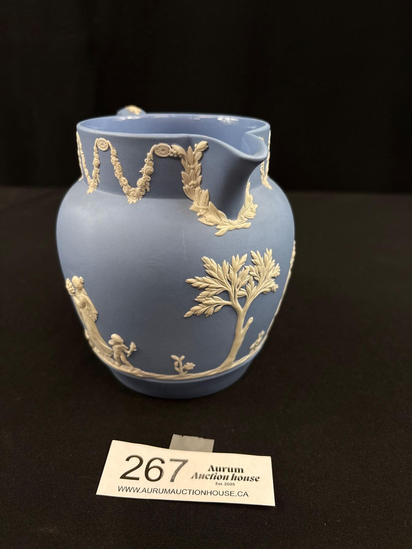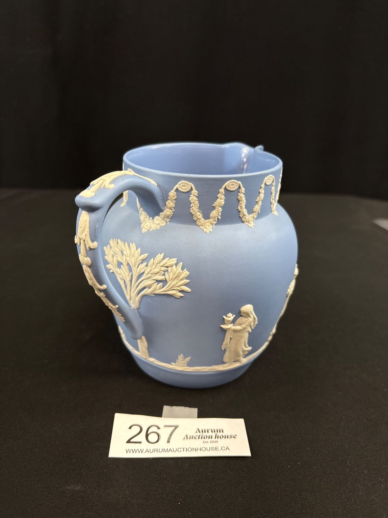 Lot 267 Vintage Wedgewood Jasperware Dutch Sacrifice Pitcher in Blue and White 5" Tall