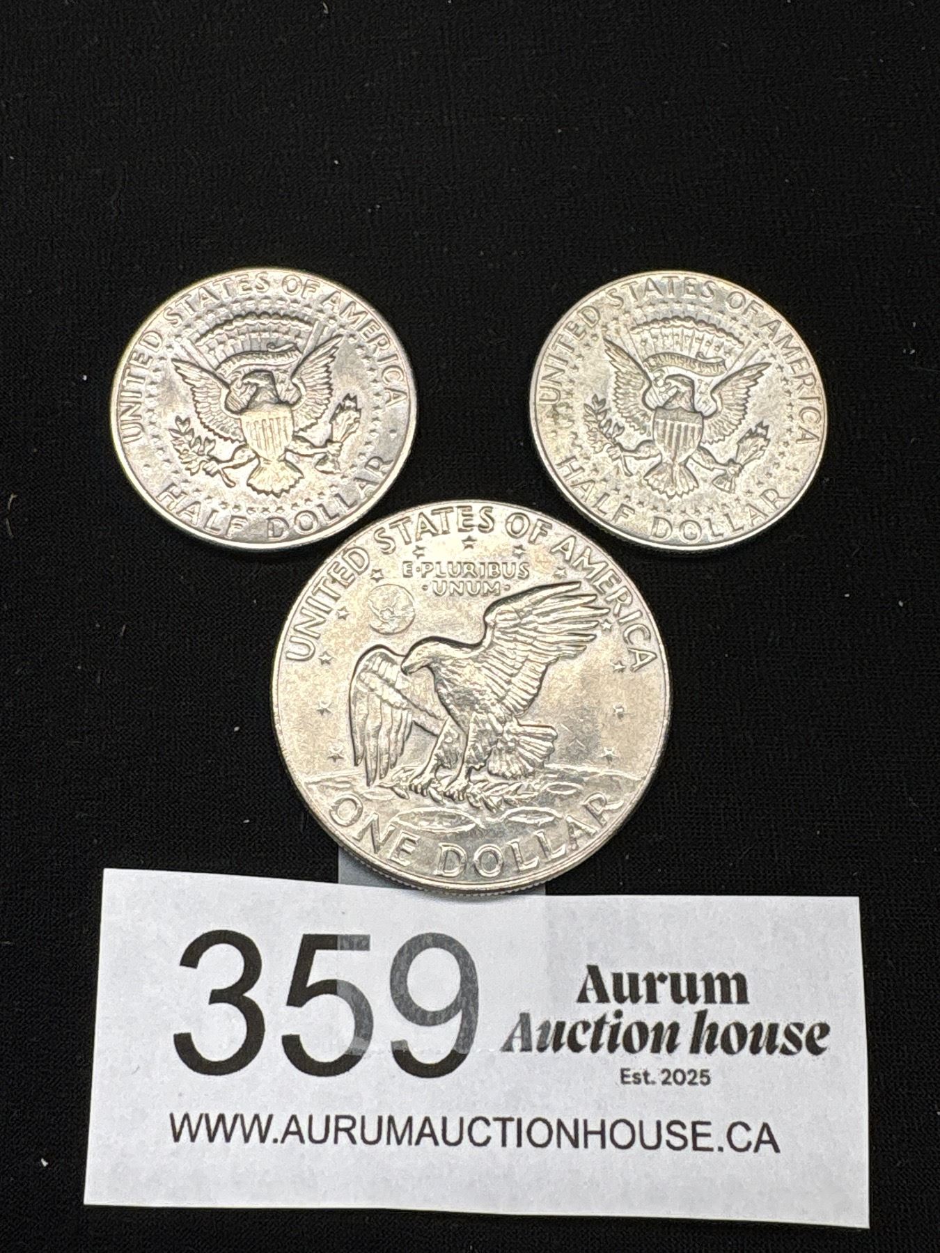 Lot 359 1974 US Dollar plus 1971 and 1968 (40% Silver) US Half Dollars