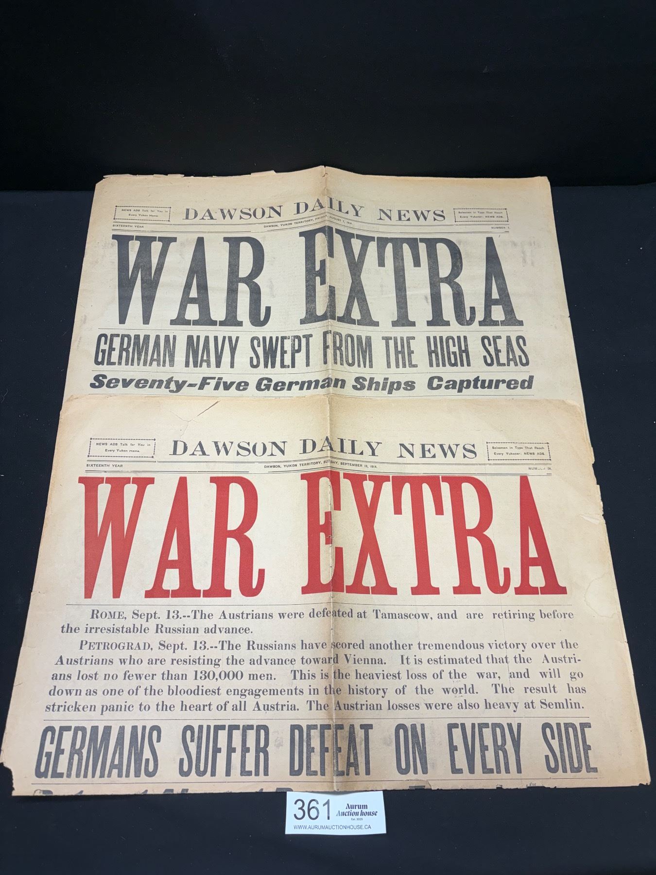 Lot 361 August 7 and September 13, 1914 WAR EXTRA Newspaper