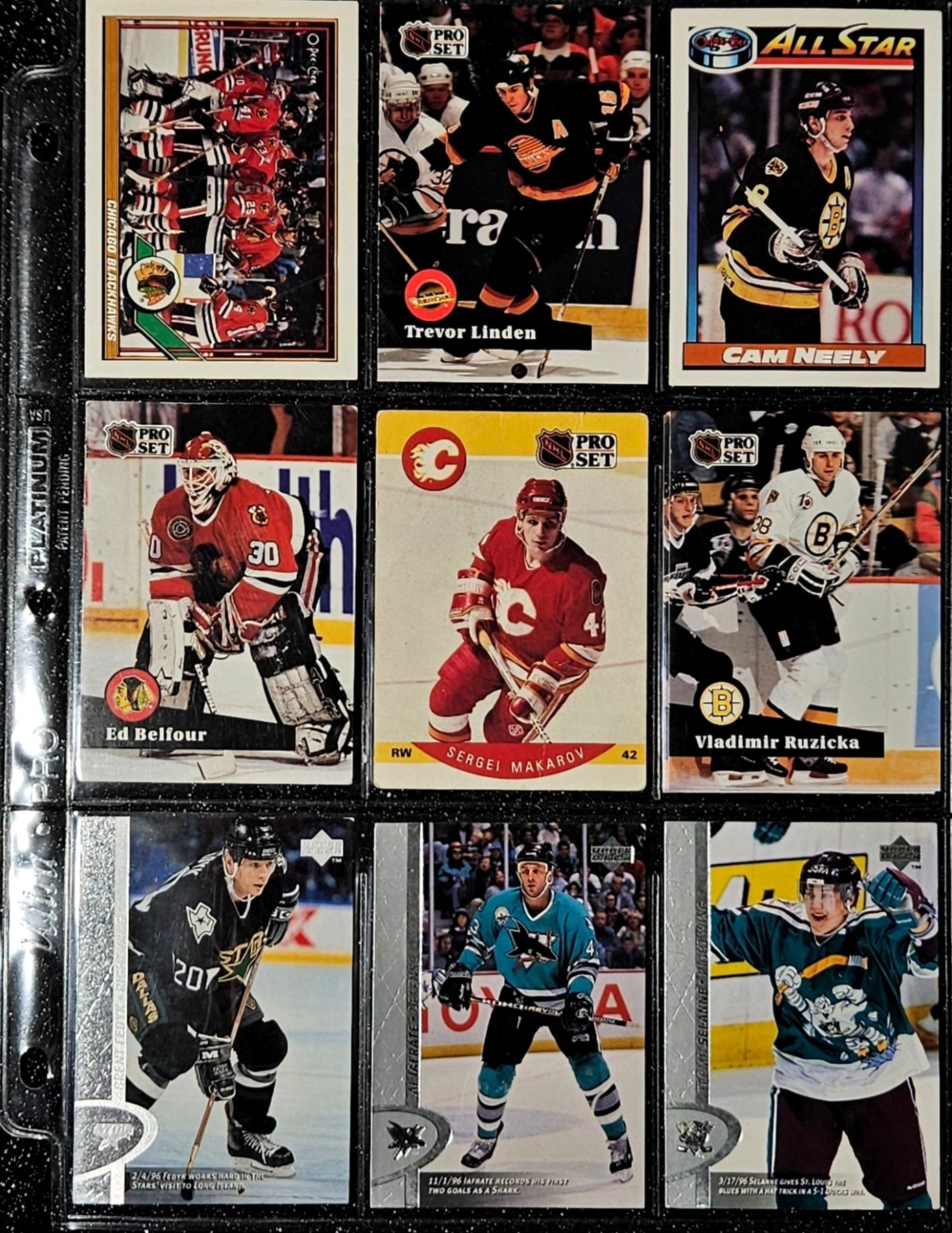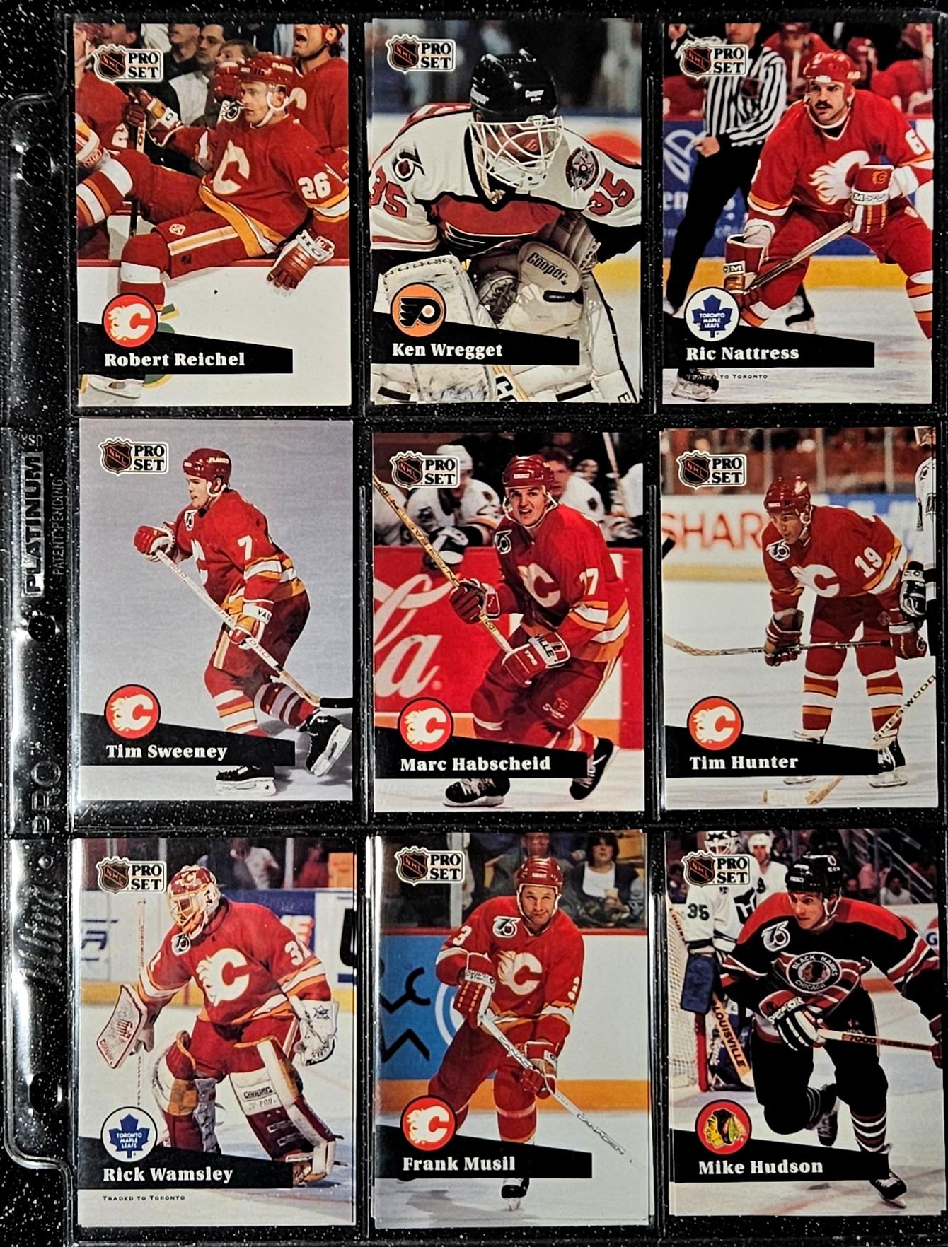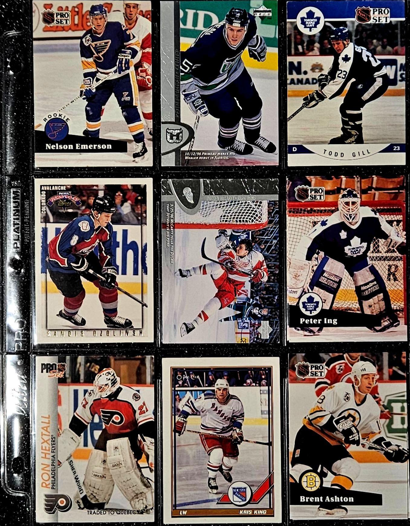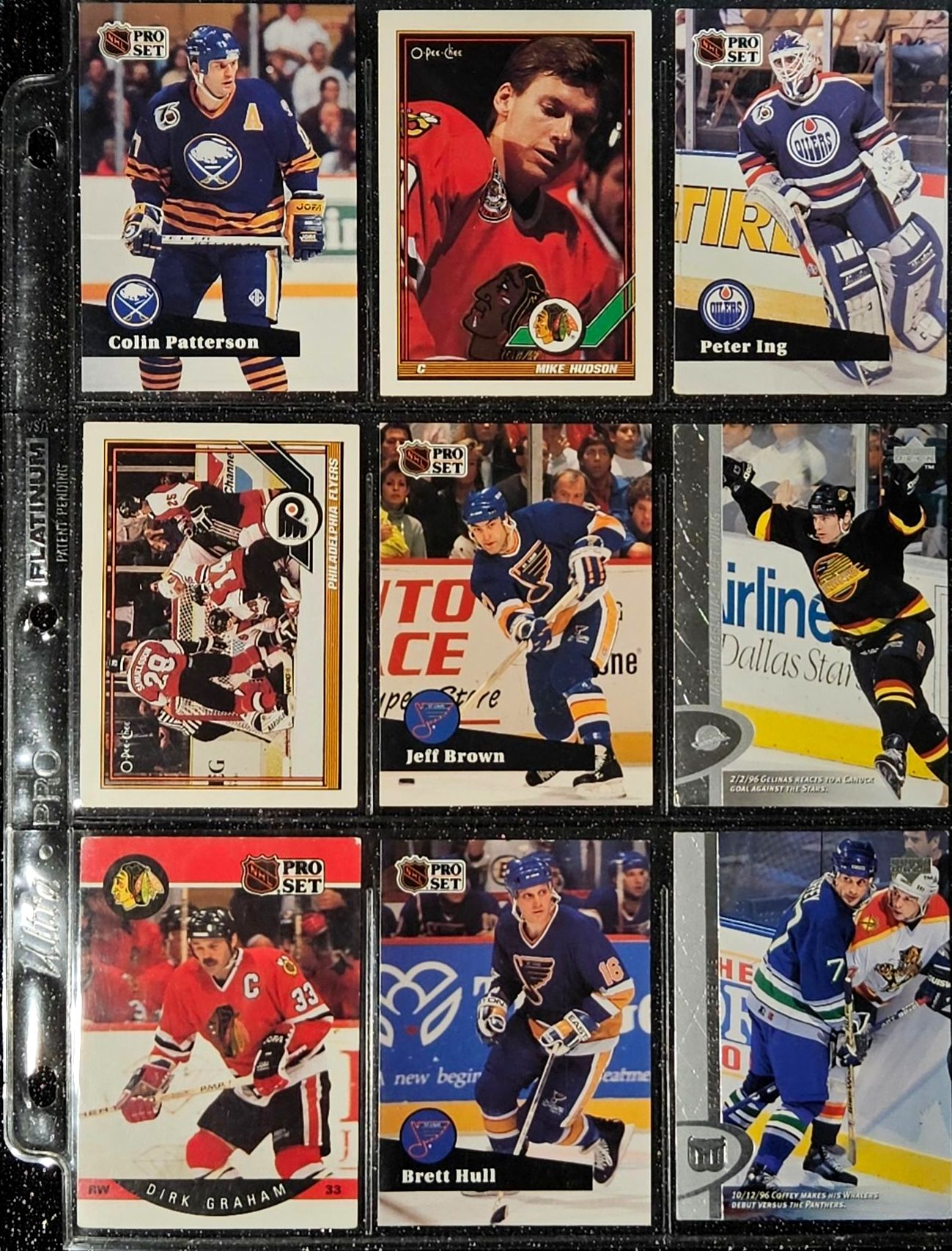 This Vintage NHL 1990's Set Includes Notable Players Such as Brett Hull, Dirk Graham, and Peter Ing. The Cards Are In a Protective Plastic Binder Sheet( 10 sheets total)
