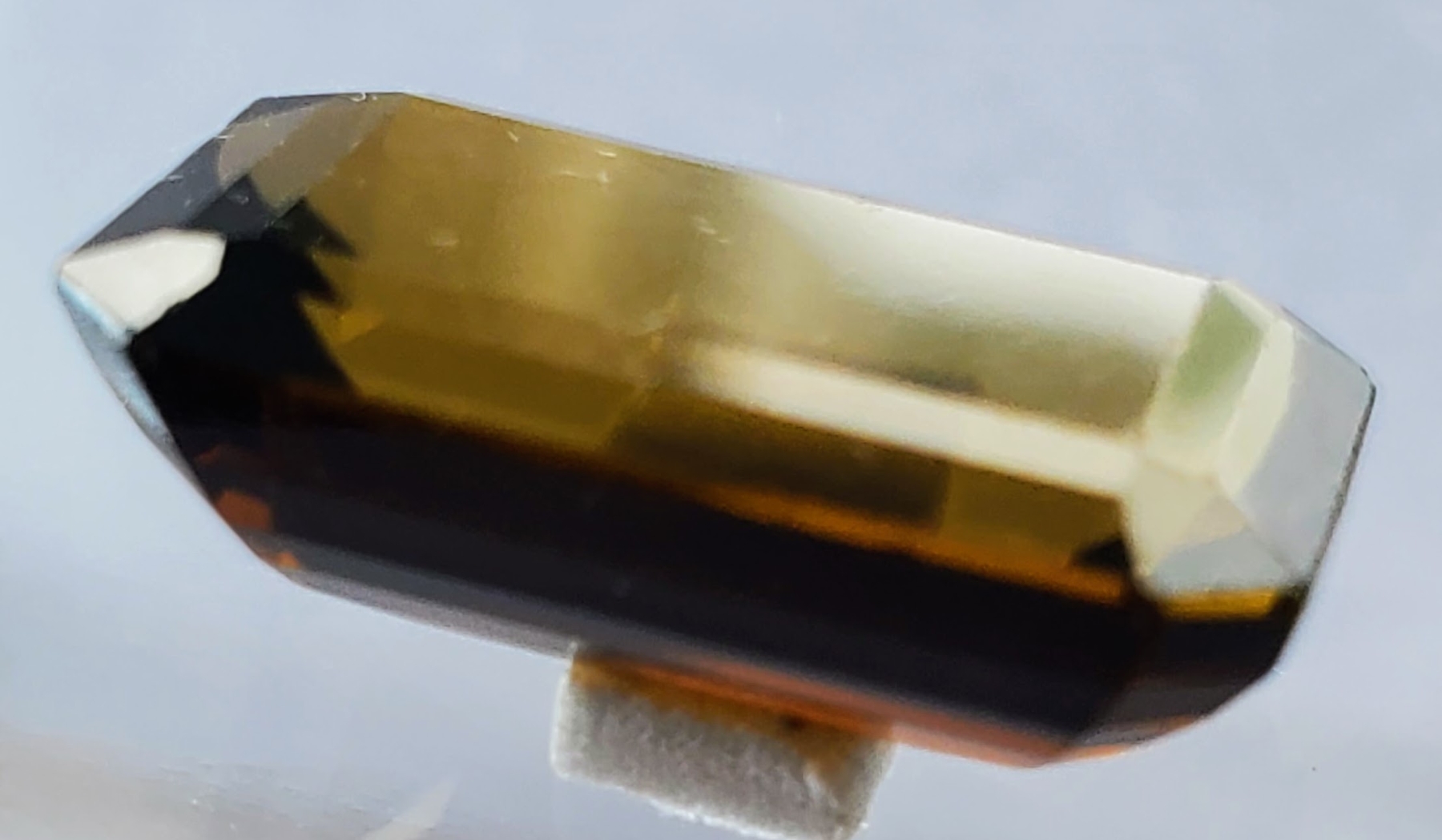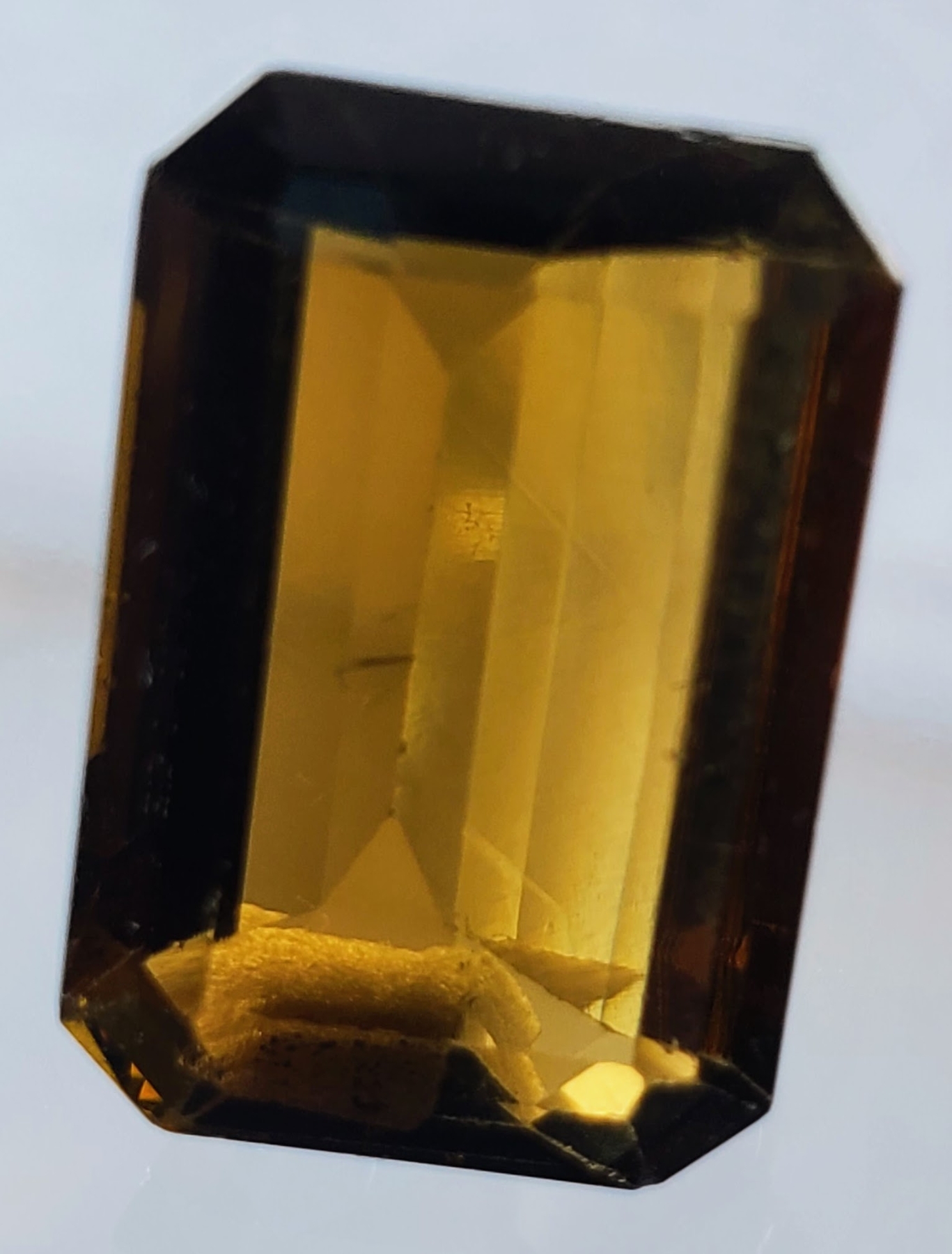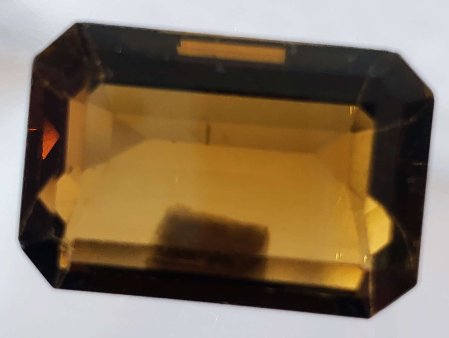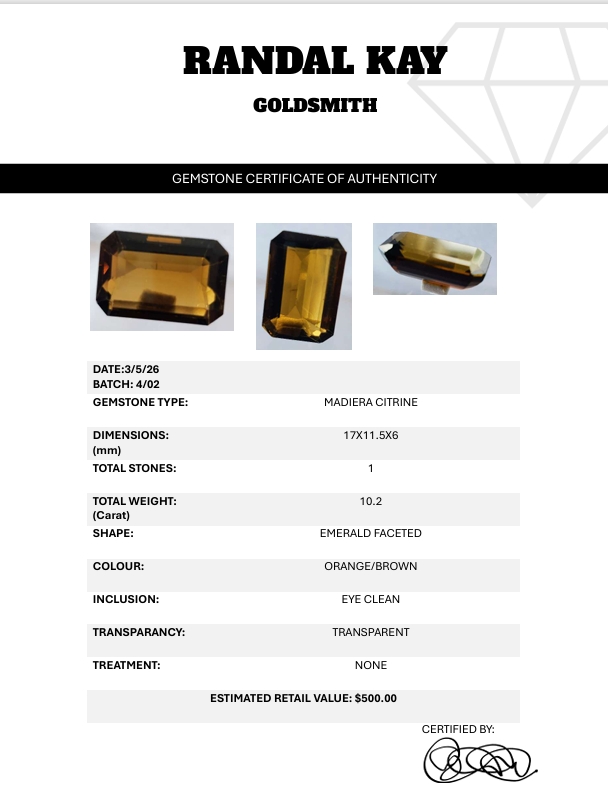 This 10.2-carat Madeira citrine displays rich orange-brown color, eye-clean clarity, and precise emerald faceting. Transparent and untreated, it delivers warm brilliance and depth. Estimated retail price is $500.