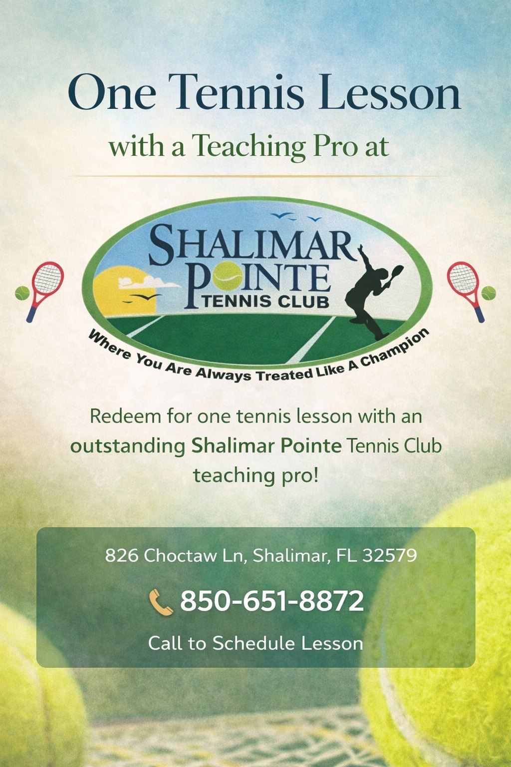 Step onto the court and elevate your game with a private tennis lesson from a professional instructor at the beautiful Shalimar Pointe Tennis Club.