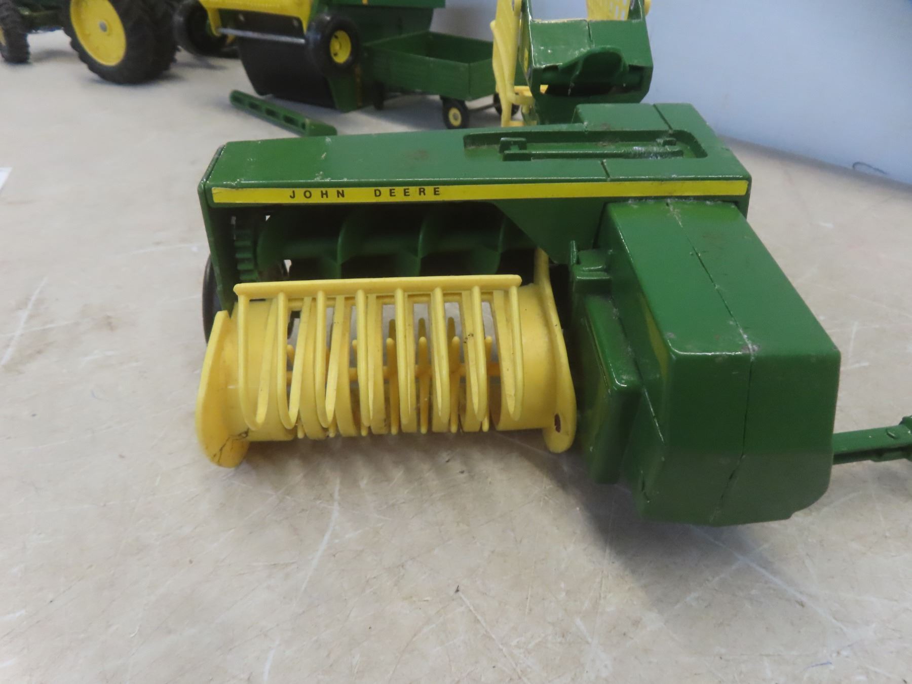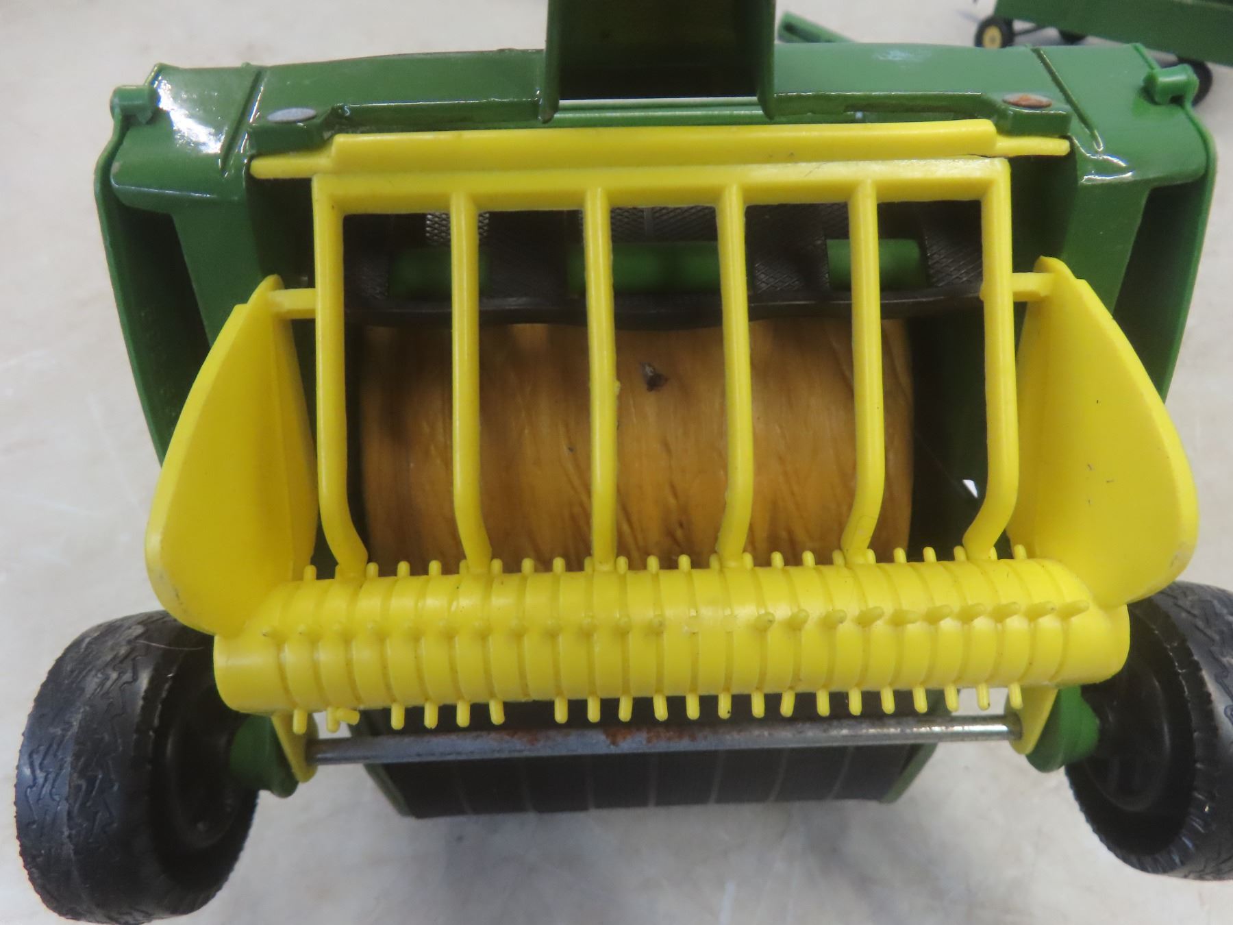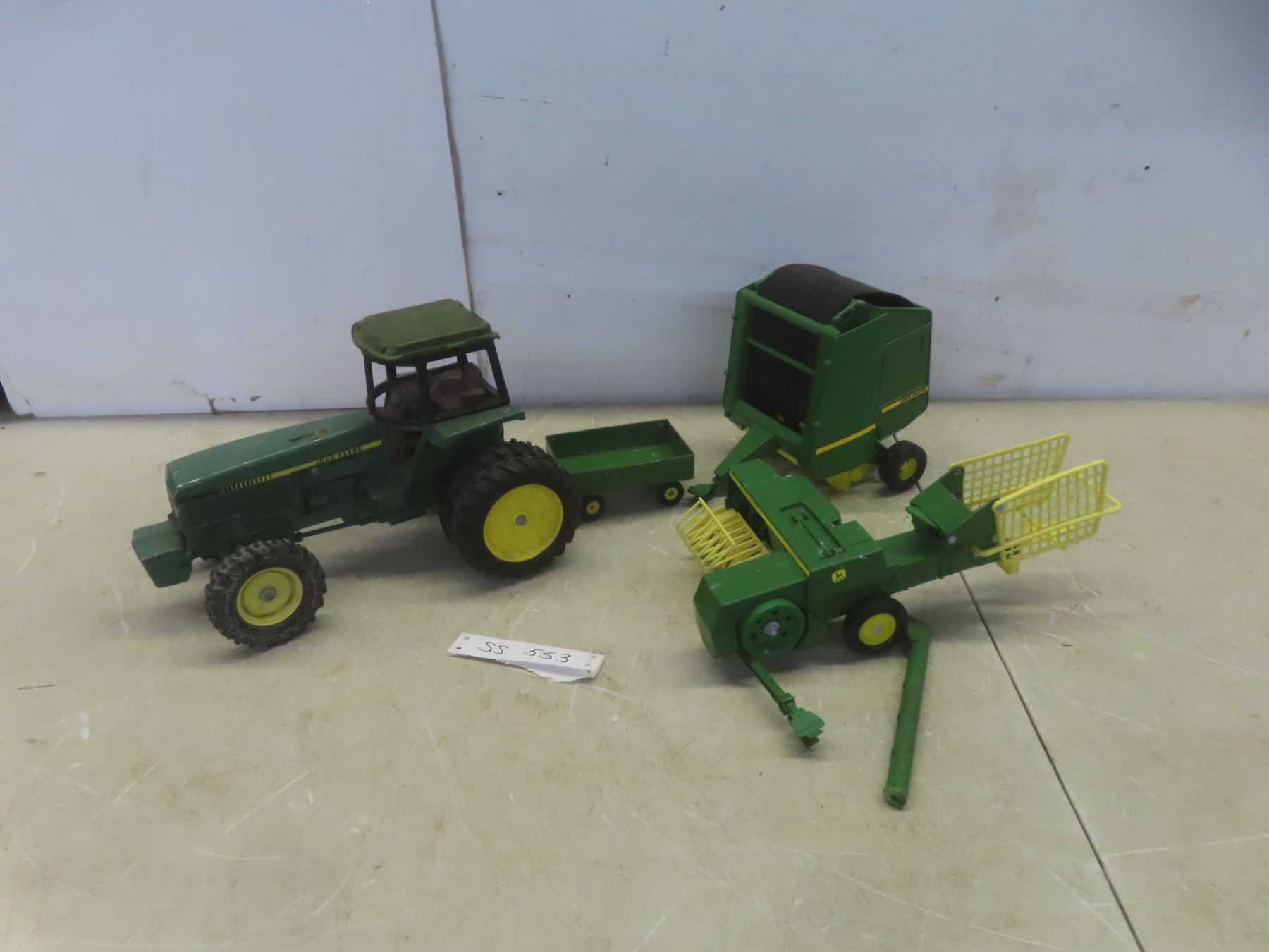 Lot 553 John Deere Metal Toy Tractor 7" × 12" × 8", with Haying Attachments
