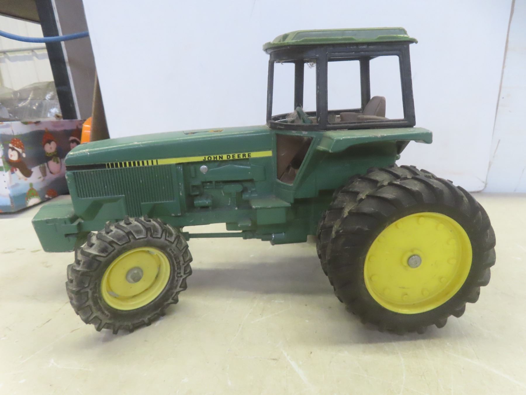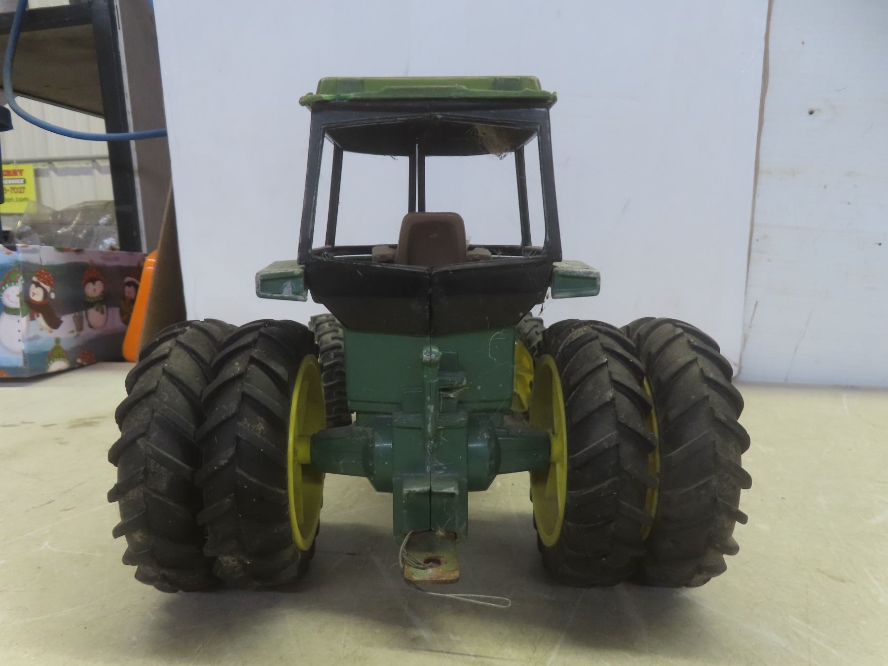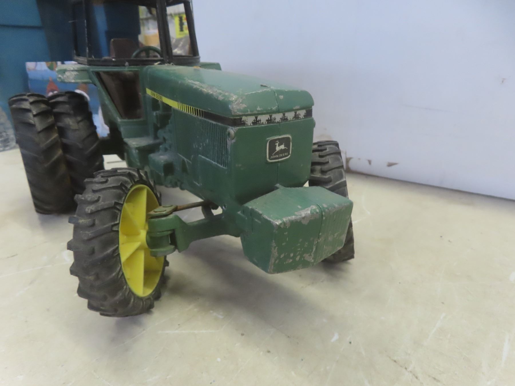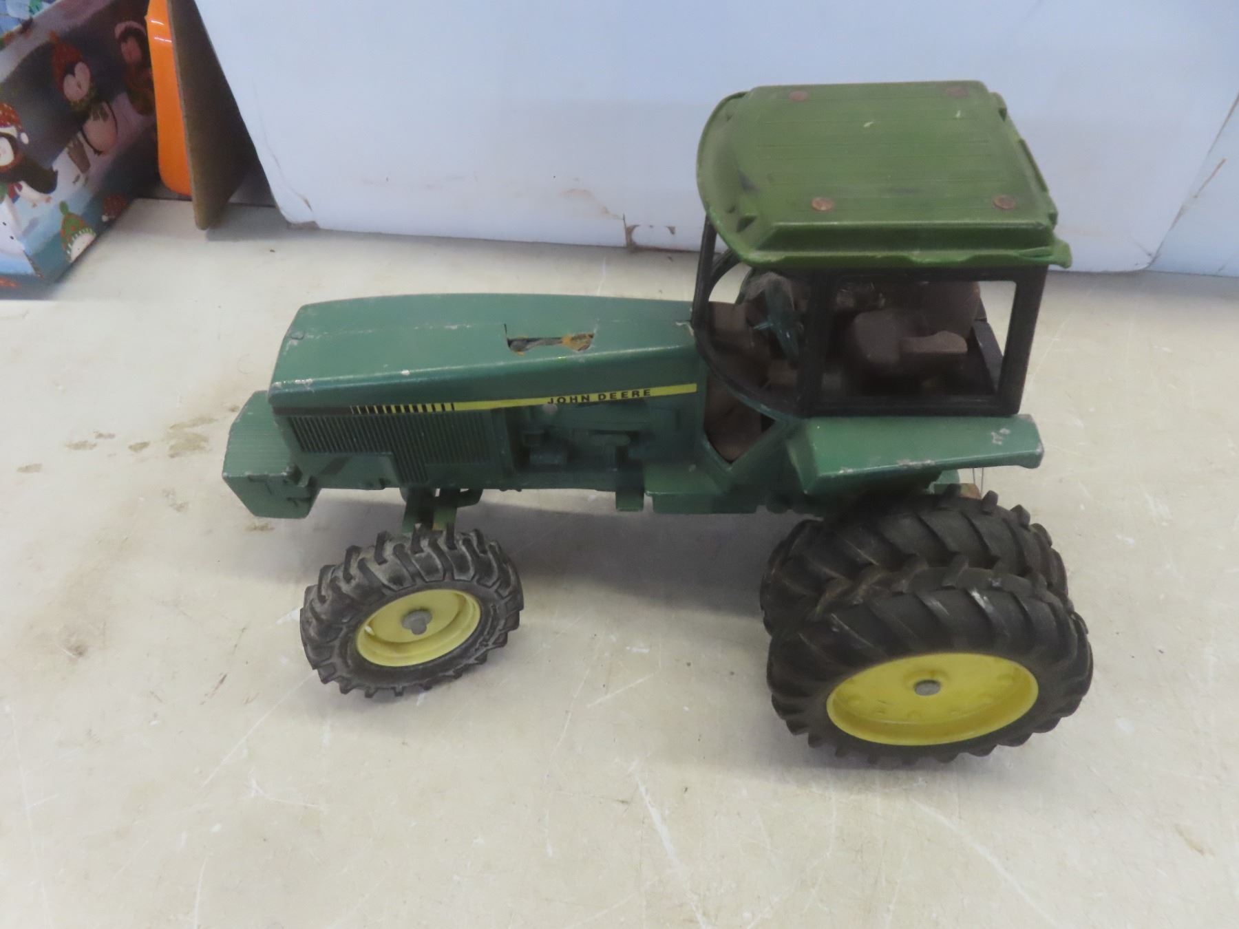 Lot 553 John Deere Metal Toy Tractor 7" × 12" × 8", with Haying Attachments