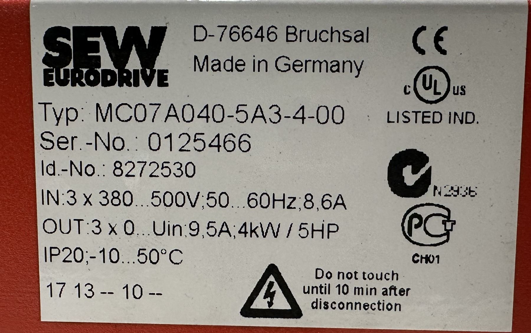 Lot 19 Sew Eurodrive #8272530Type MC07A040-5A3-4-00 Movitrac Inverter