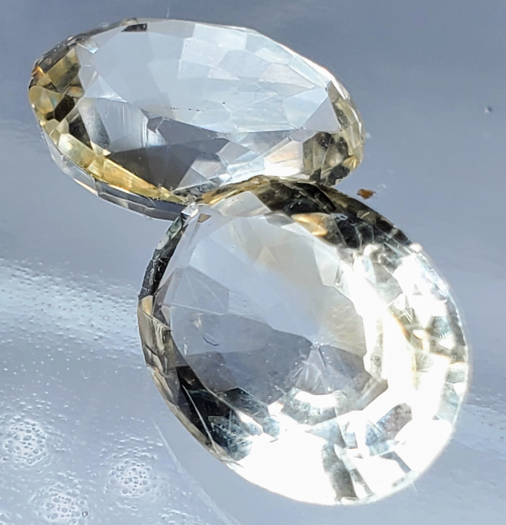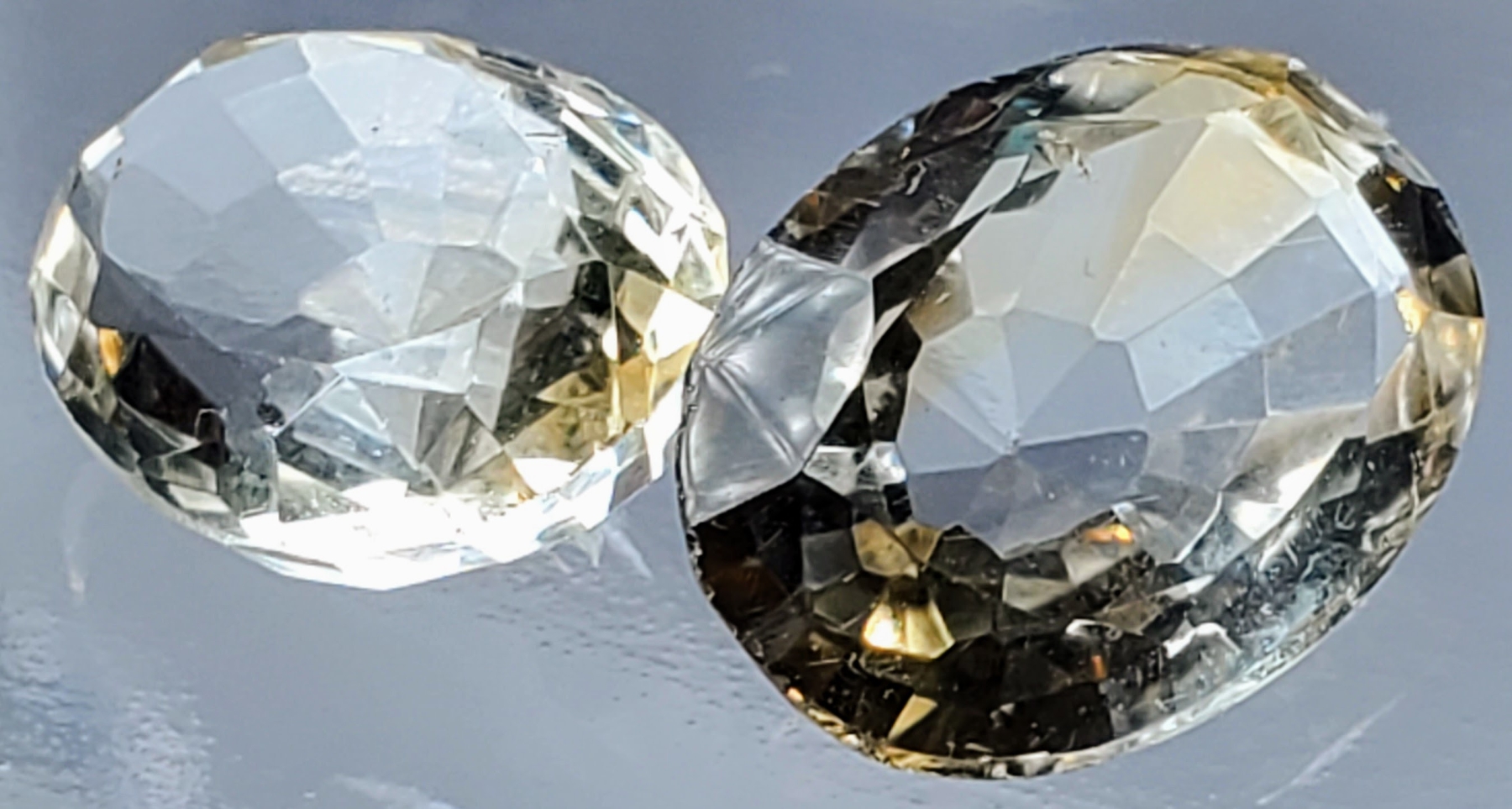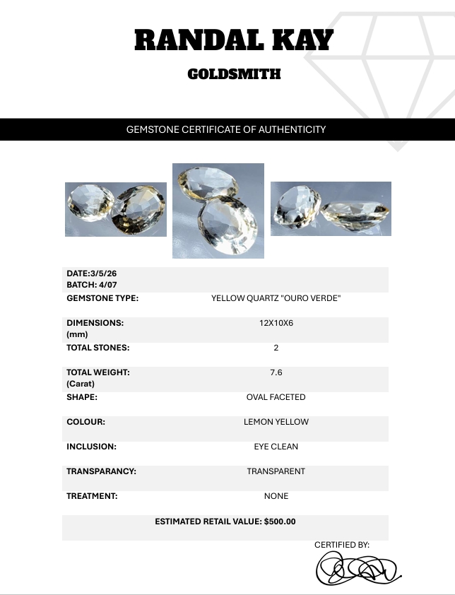 A bright 7.6-carat pair of lemon-yellow Ouro Verde quartz, eye-clean and transparent with crisp oval faceting, offering lively brilliance. Estimated retail price is $500.