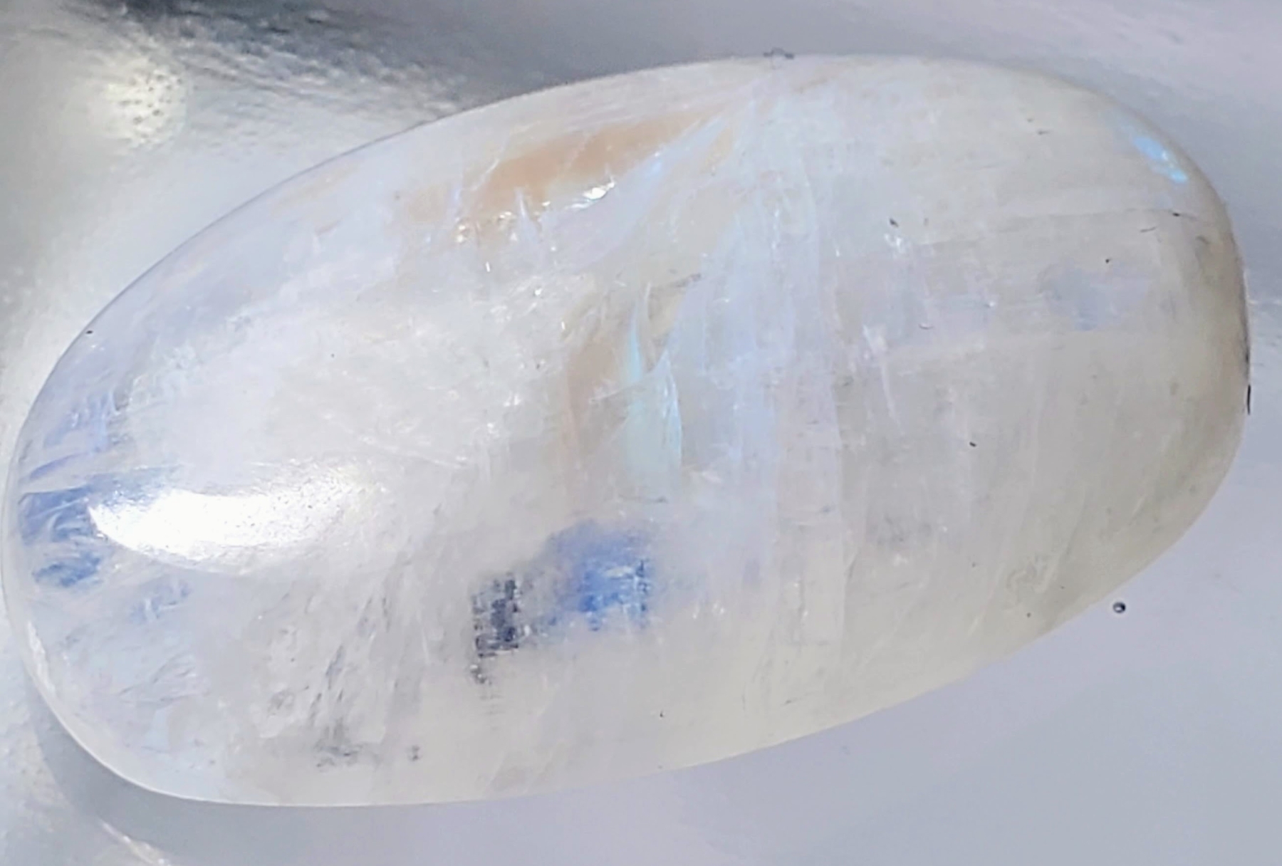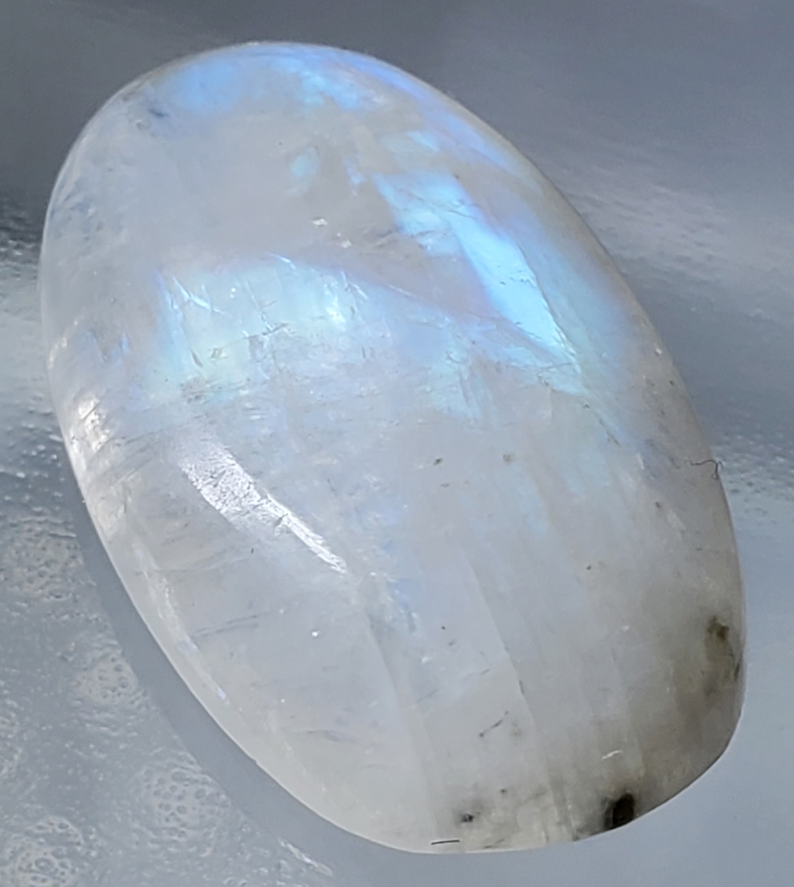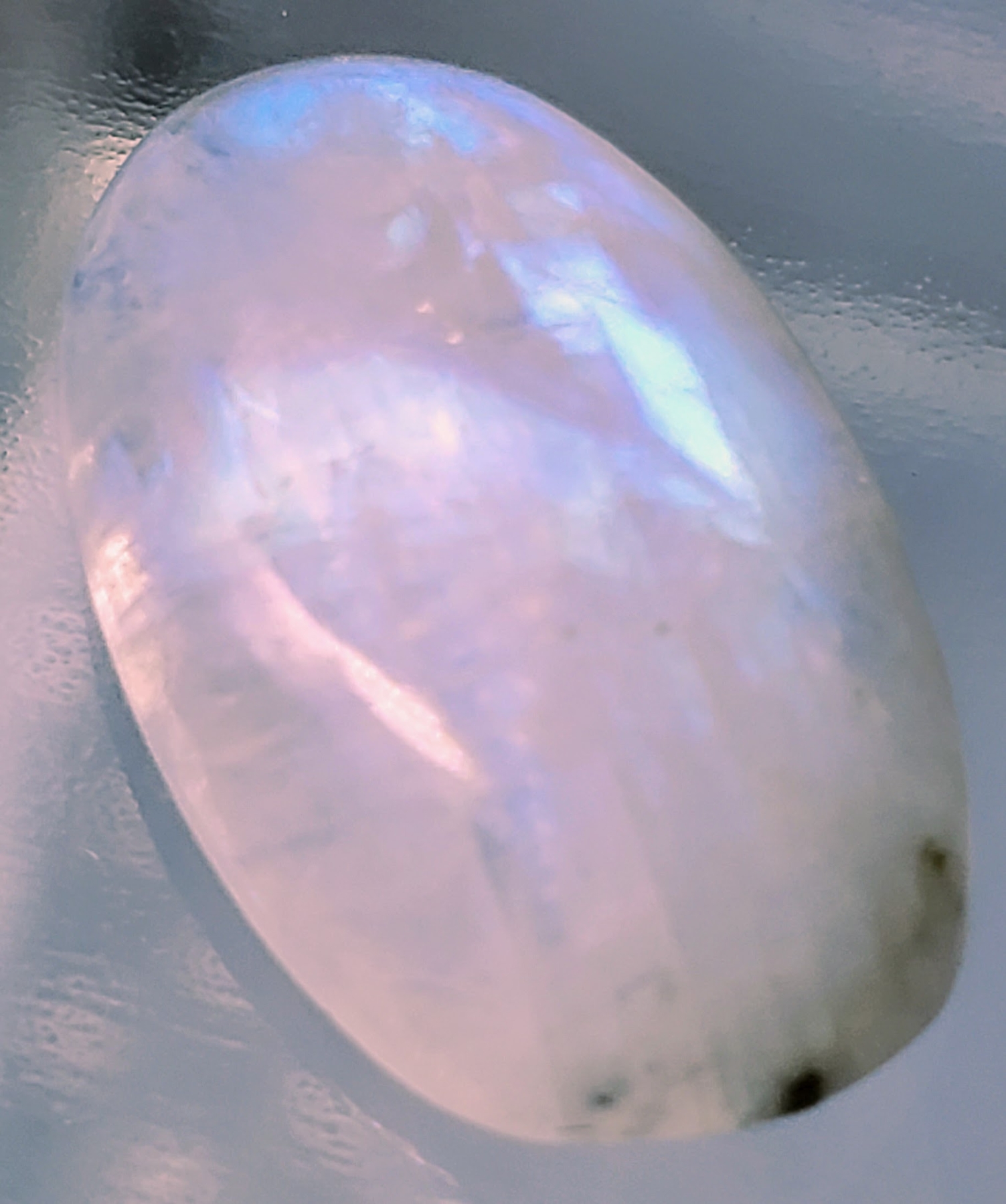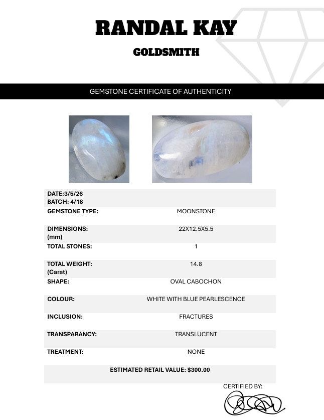 A 14.8-carat moonstone cabochon showing blue pearlescence, translucent body, and natural fractures. Untreated and luminous with soft glow. Estimated retail price is $300.