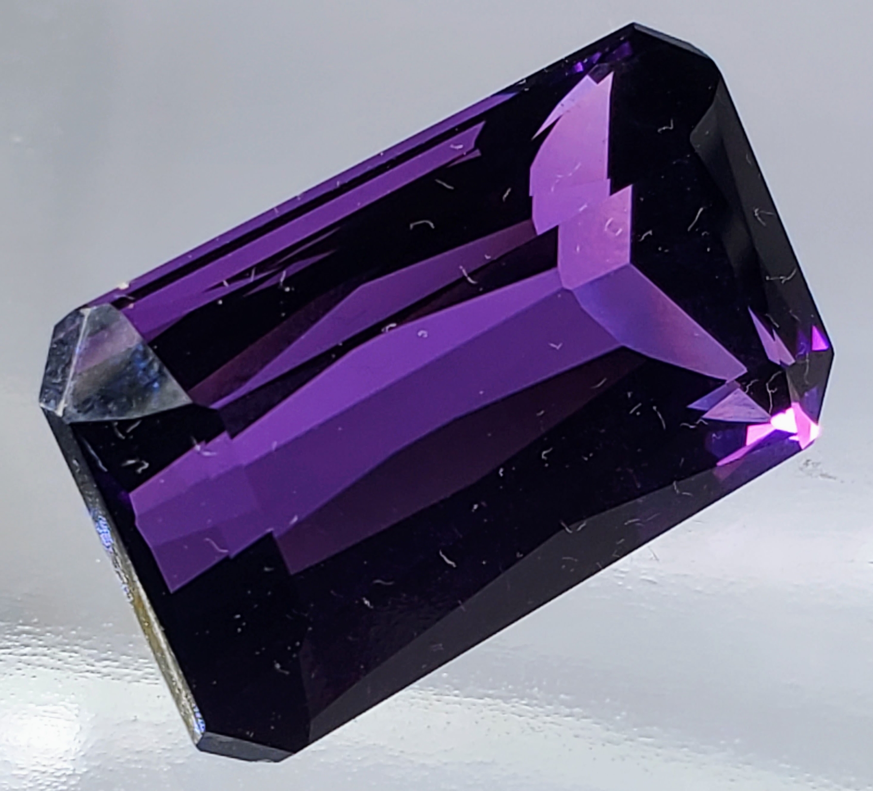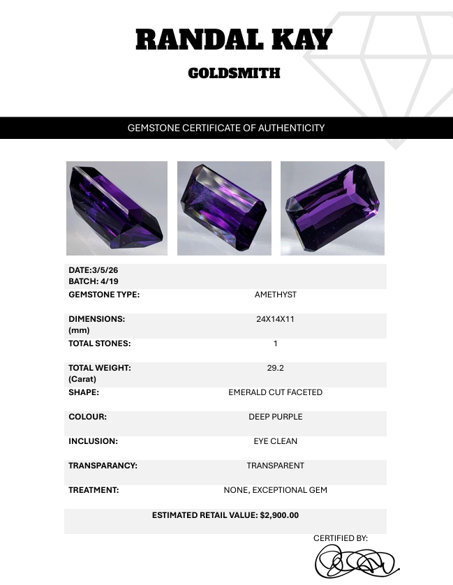An exceptional 29.2-carat deep-purple amethyst with eye-clean clarity and emerald faceting, offering premium brilliance and presence. Estimated retail price is $2,900.
