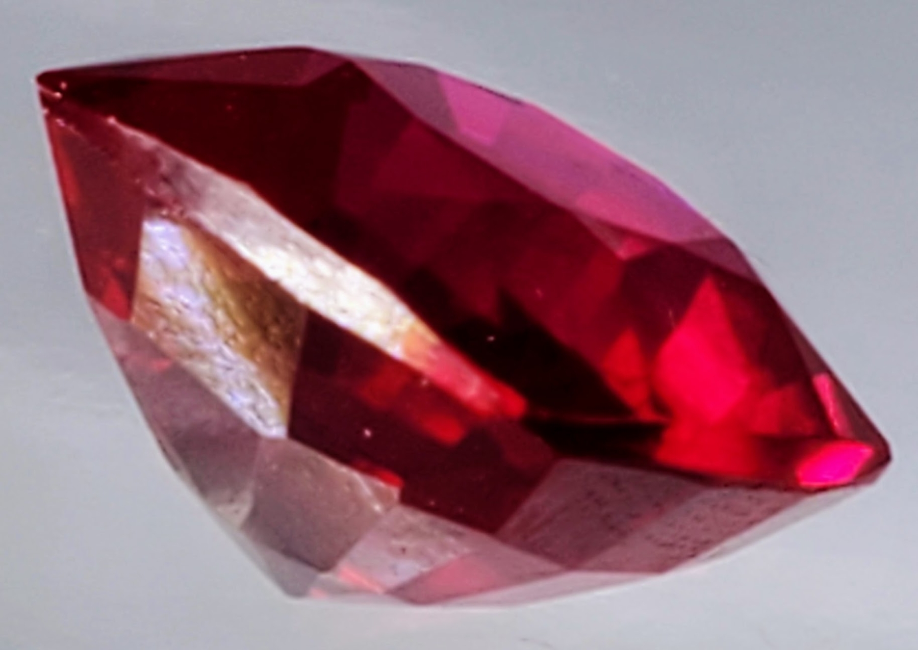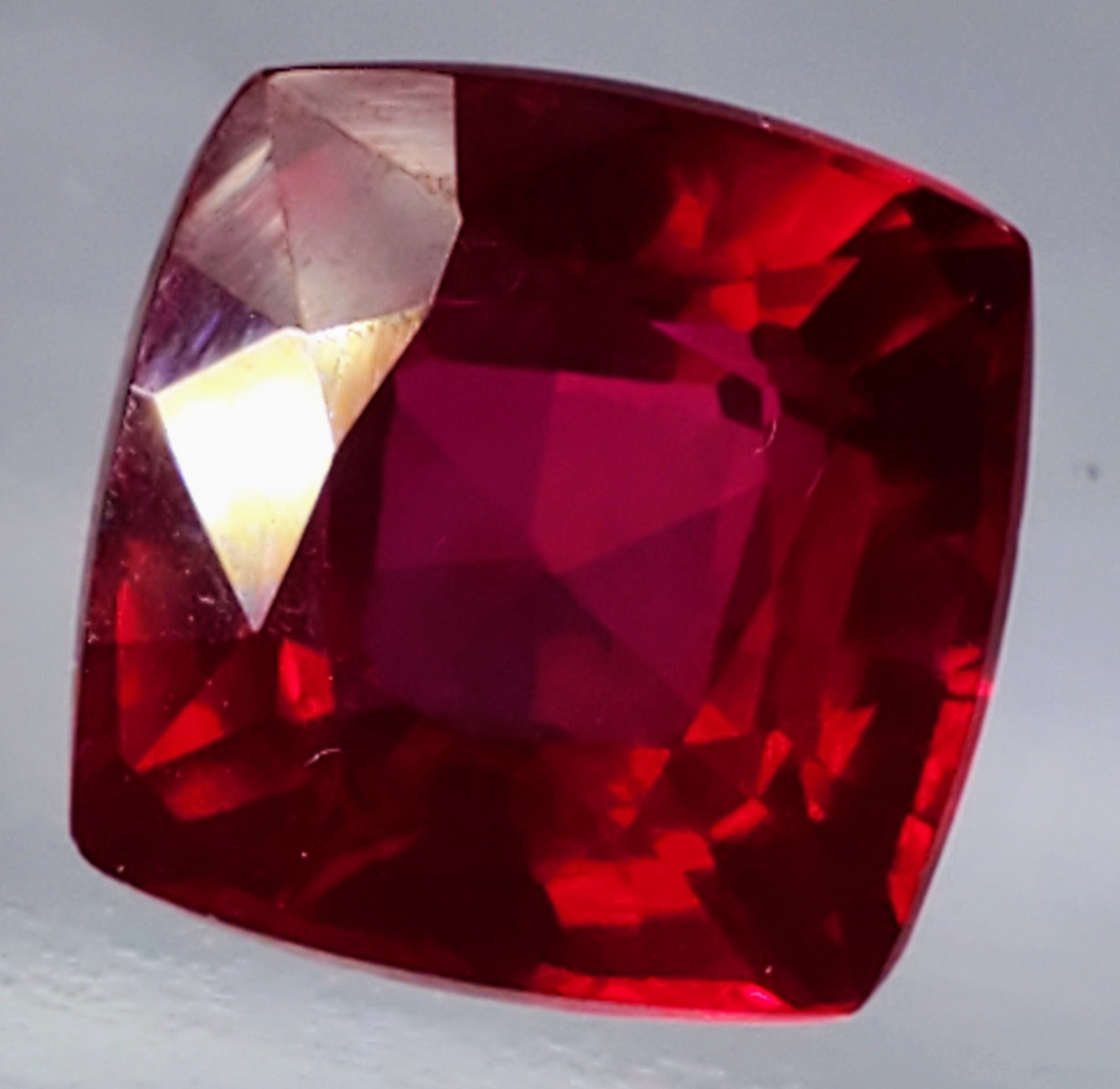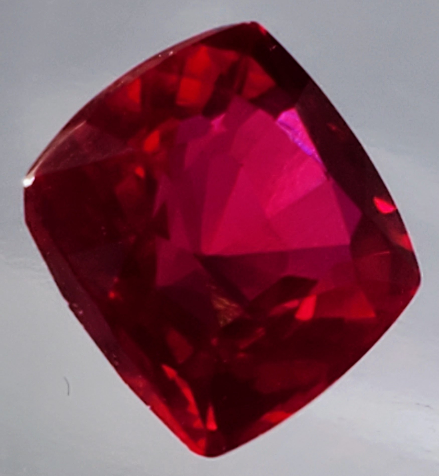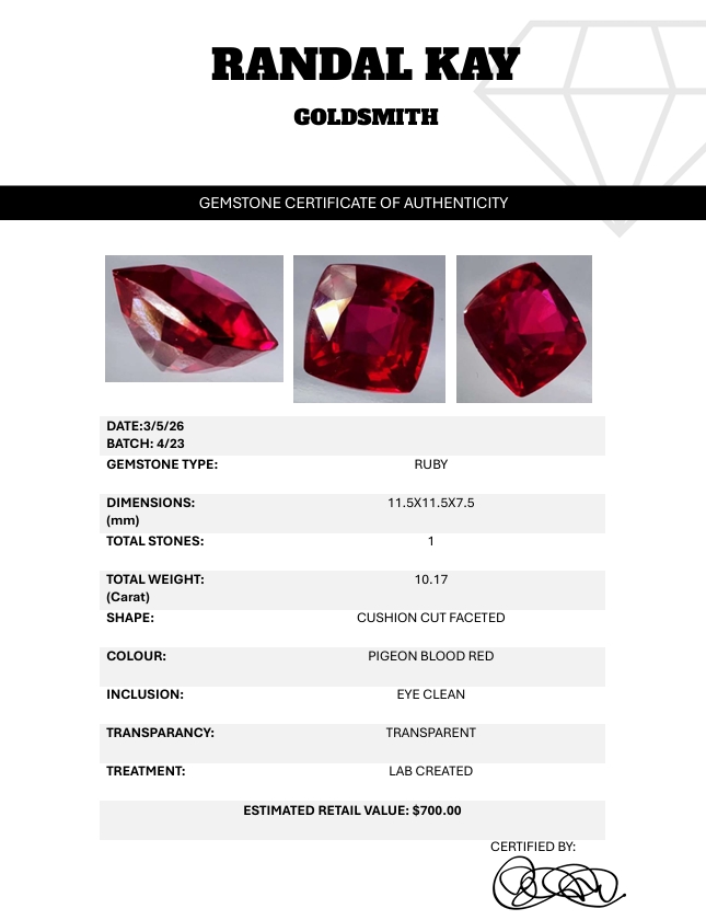 A vivid 10.17-carat pigeon-blood red ruby, lab-created for exceptional clarity and brilliance. Cushion-cut, transparent, and eye-clean with striking color. Estimated retail price is $700.