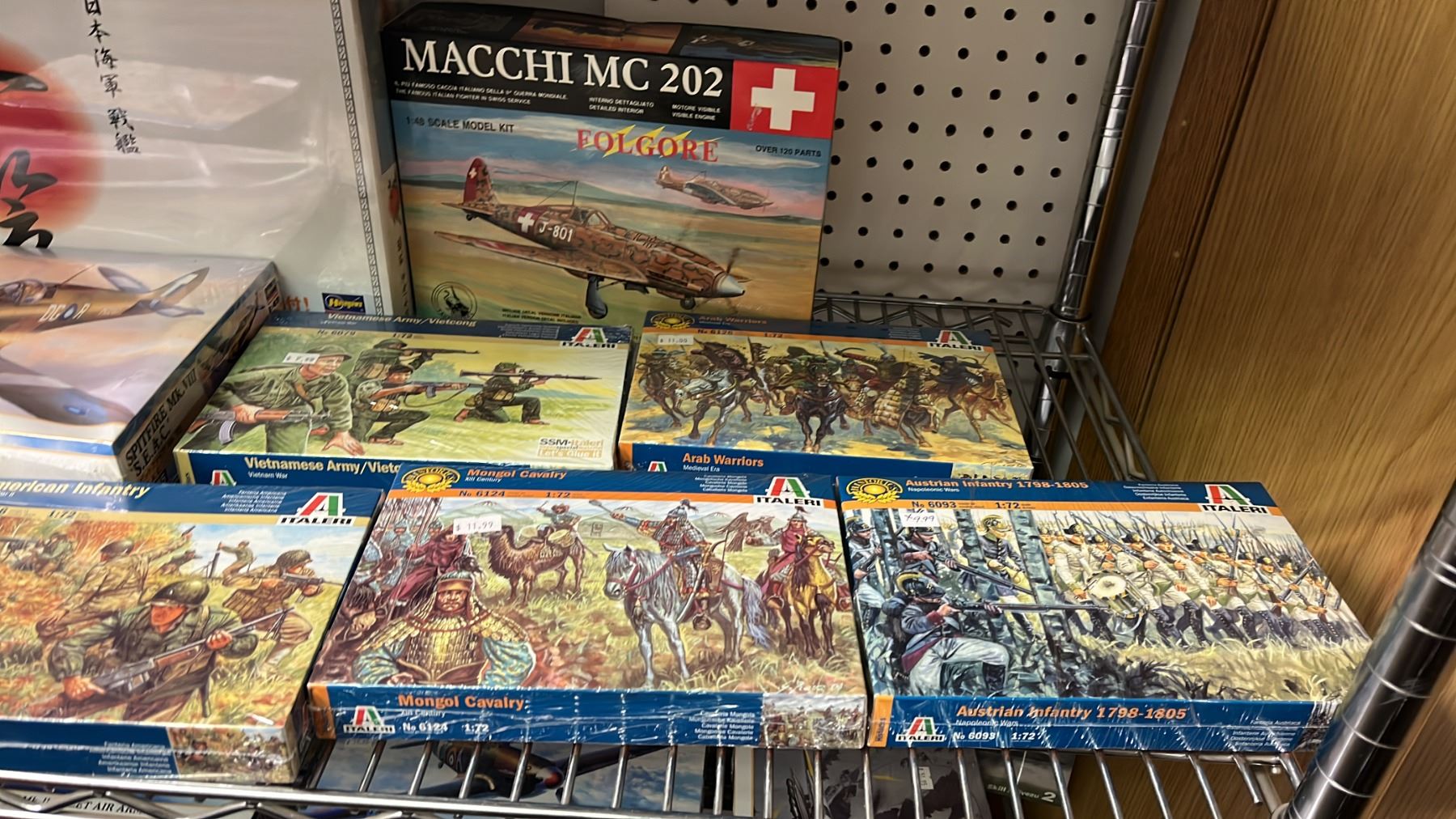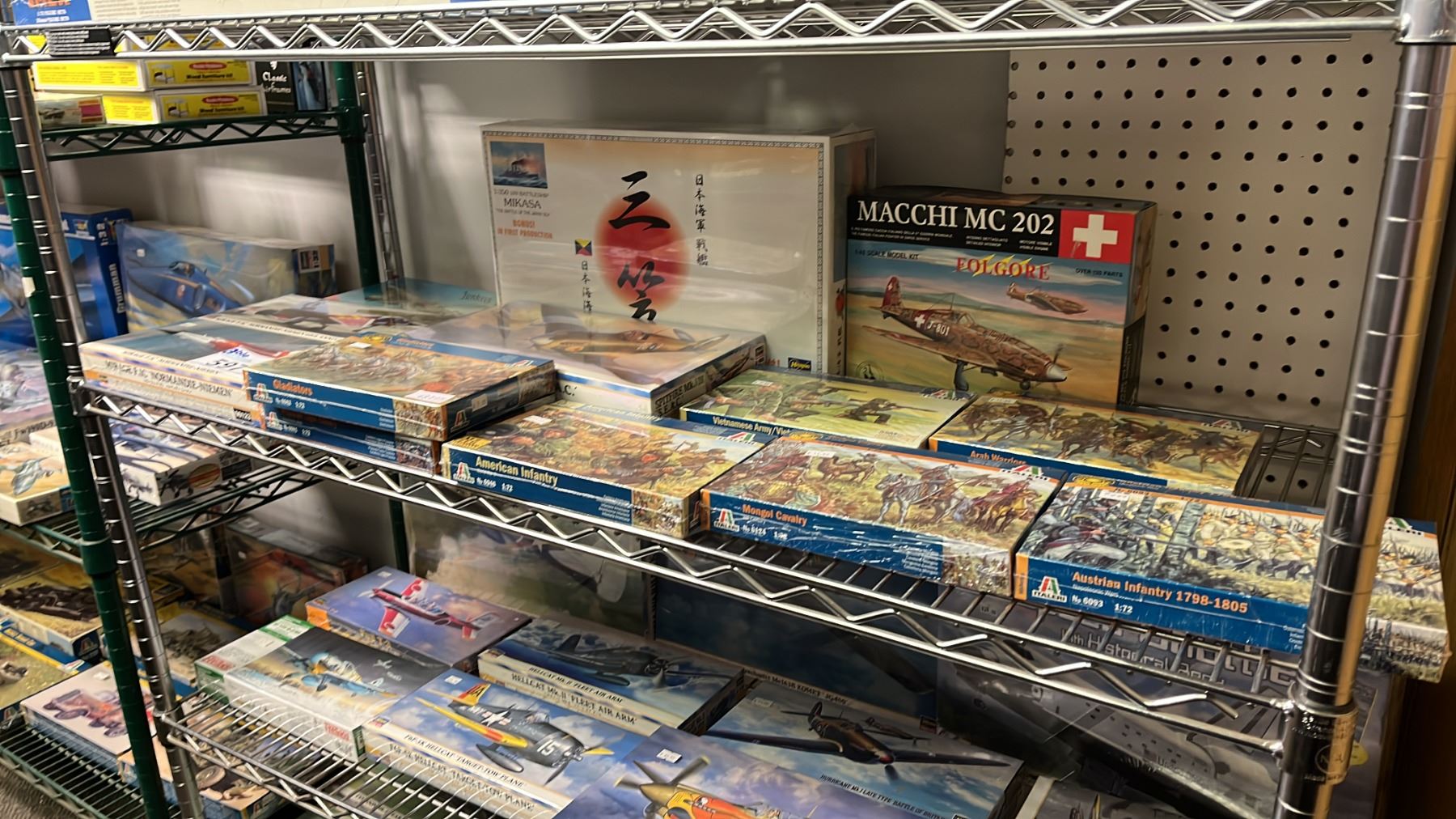 SHELF OF ASSORTED MODEL KITS: BATTLESHIP, AIRPLANES & ASSORTED FIGURE KITS