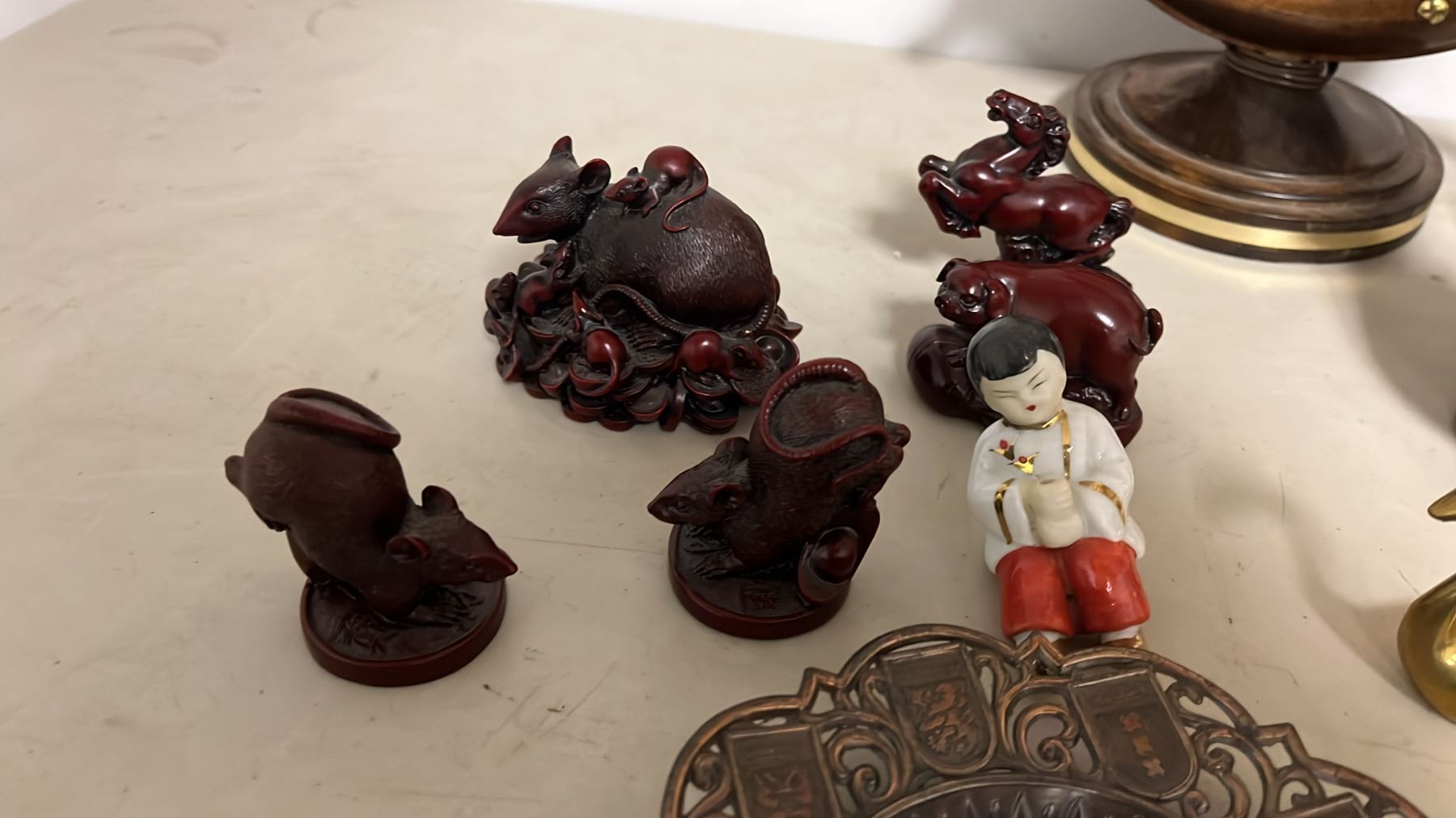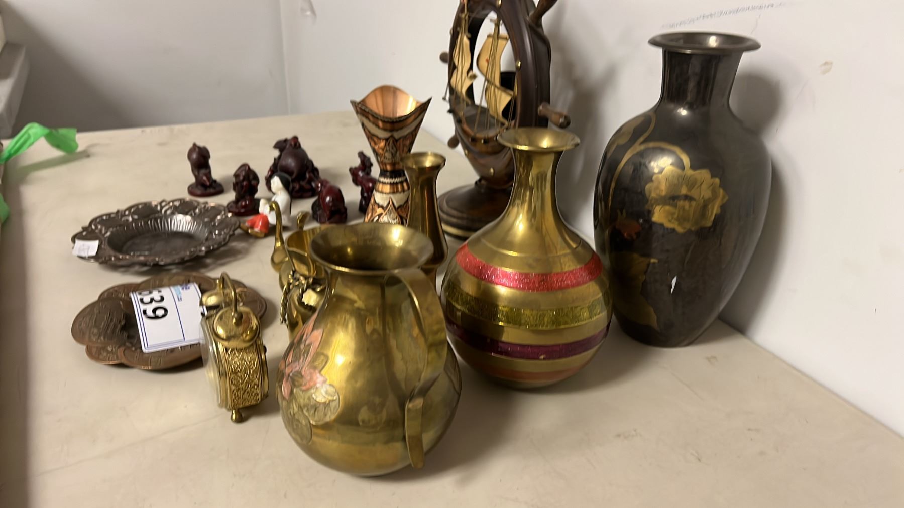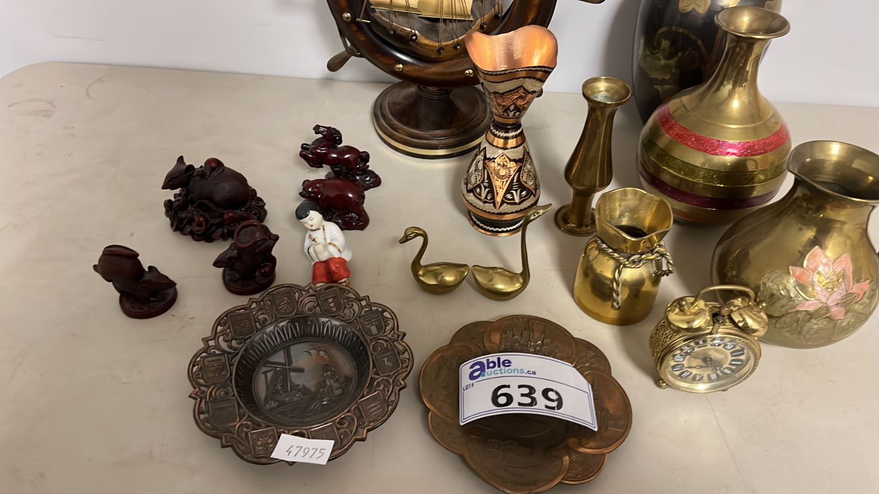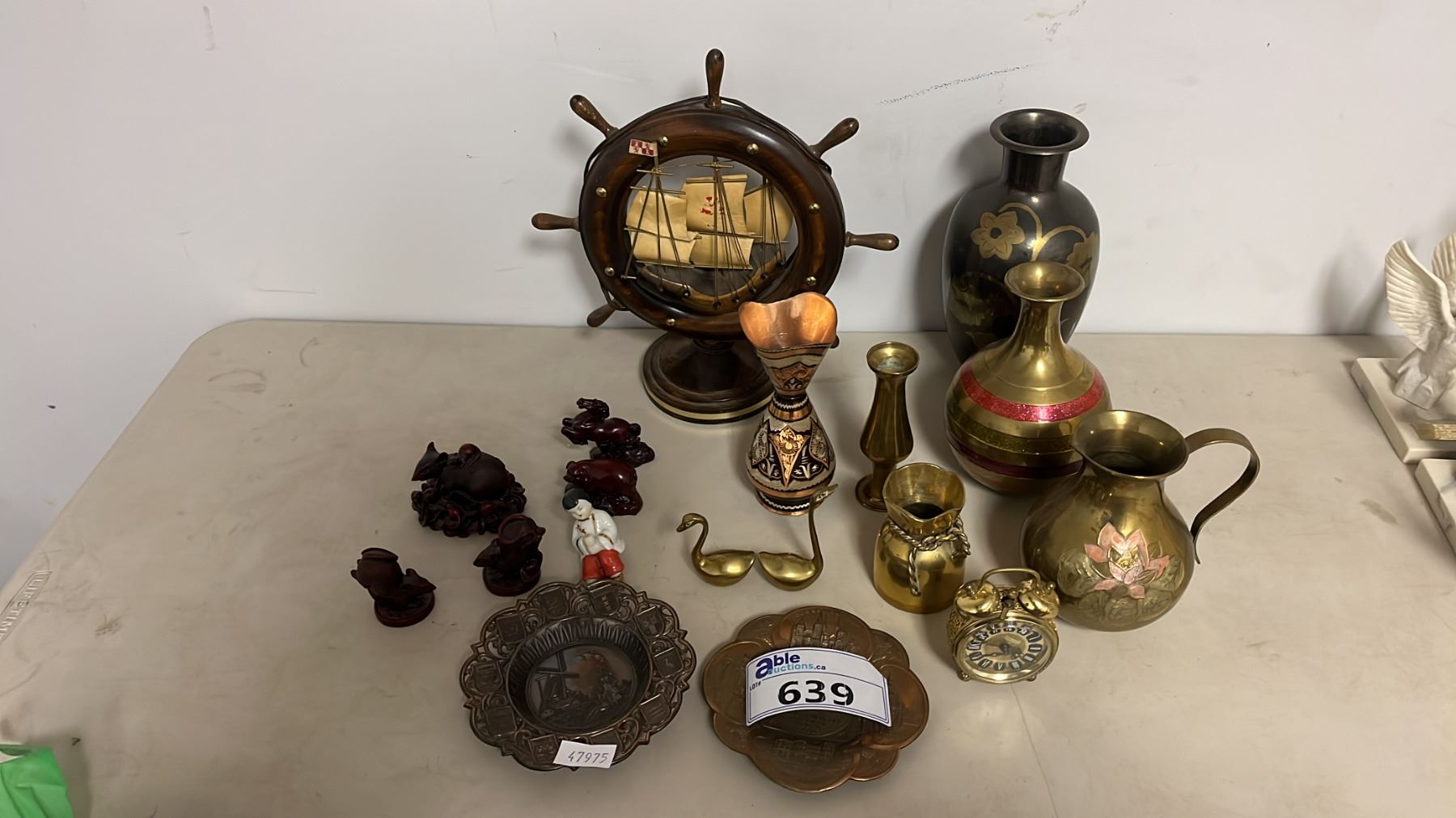 Lot 639 COLLECTION OF ASSORTED VINTAGE BRASS & ENAMEL VASES, DECORATIVE WOOD SHIP'S WHEEL & MORE