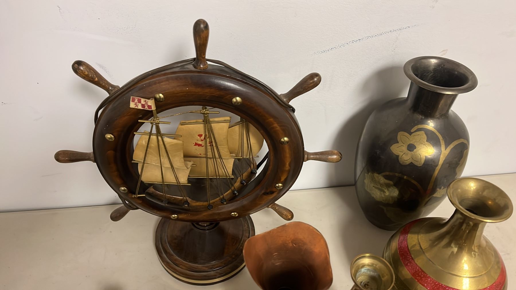 COLLECTION OF ASSORTED VINTAGE BRASS & ENAMEL VASES, DECORATIVE WOOD SHIP'S WHEEL & MORE