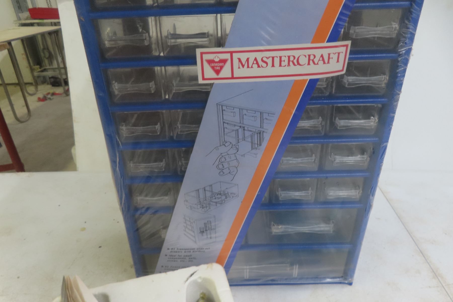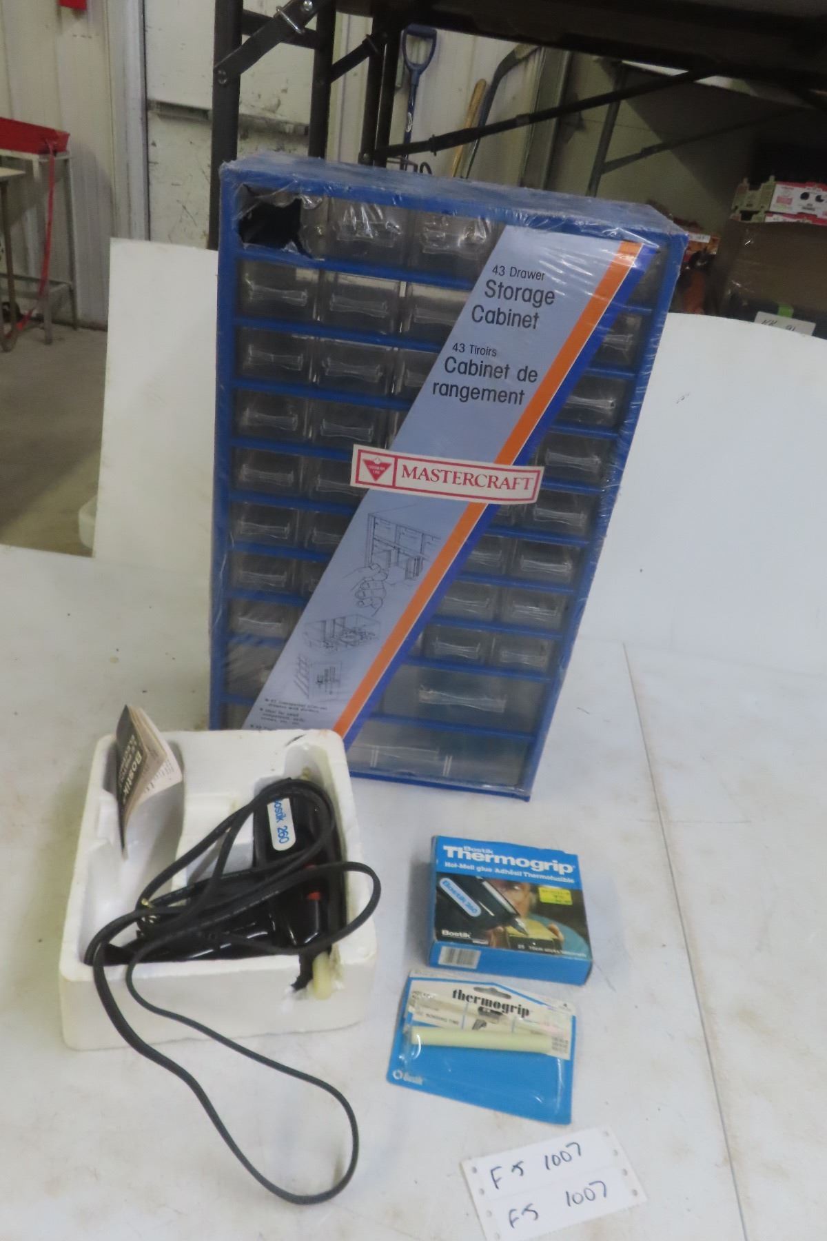 Lot 1007 Mastercraft New 43-Drawer Small Hardware Cabinet , Glue Gun