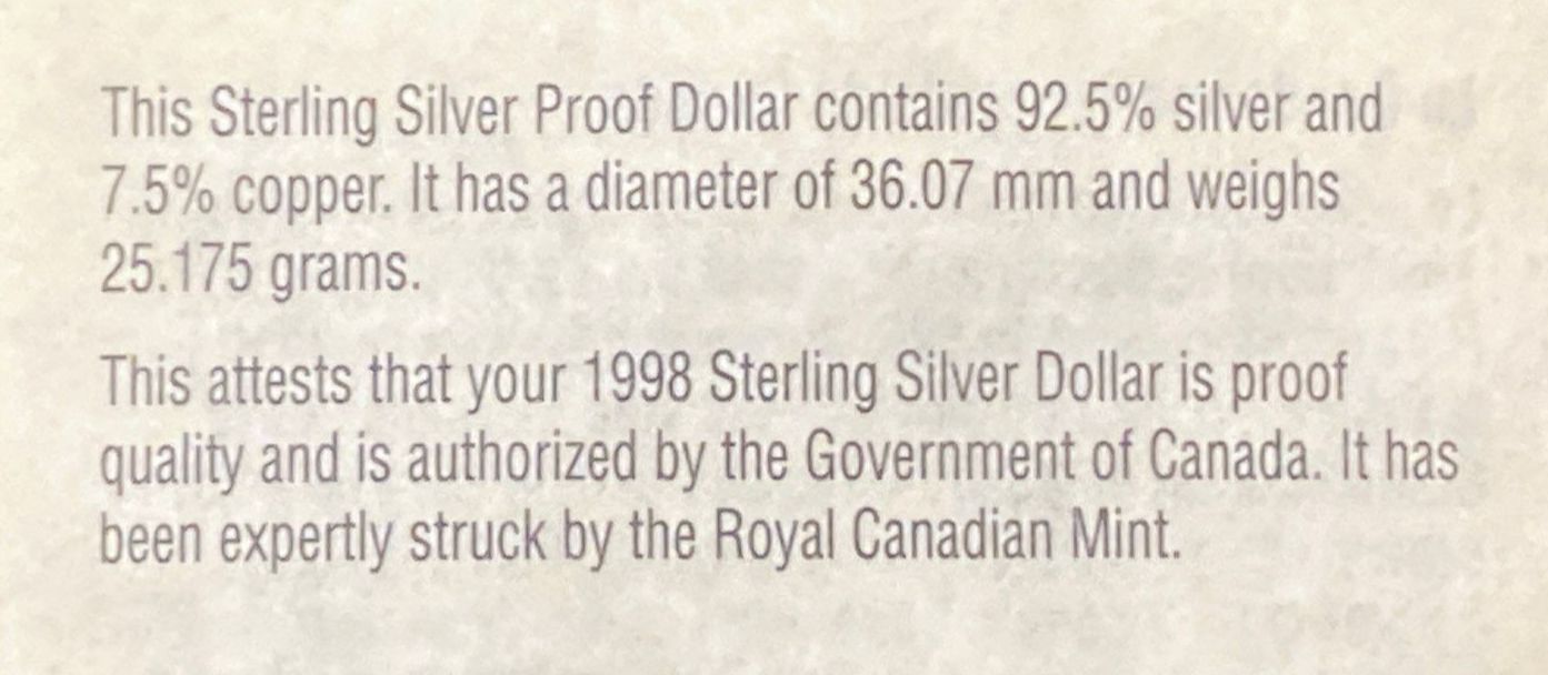 Lot 62 1998 RCMP Proof Coin 92.5% Silver 25.175 Grams