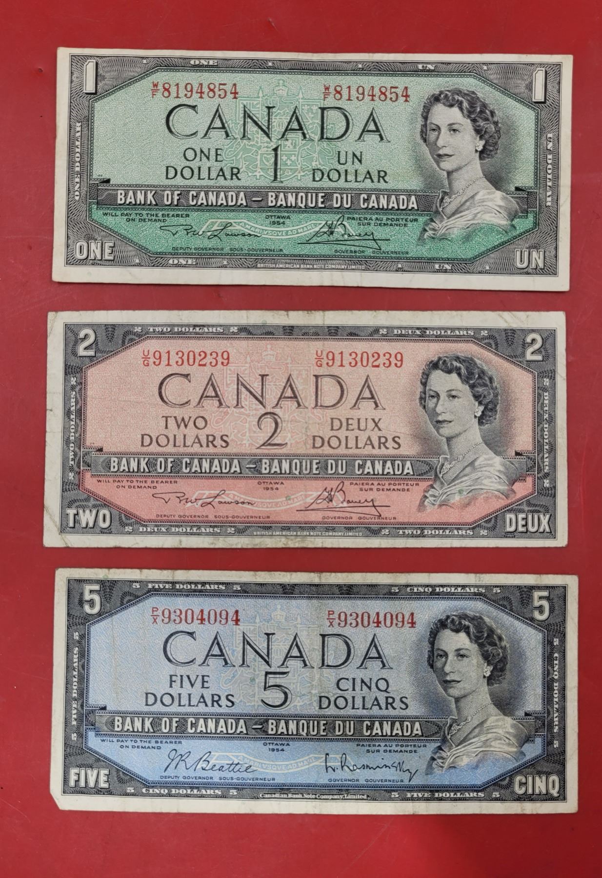 Lot of 1954 Canadian Paper Bills ($1, $2, & $5)
