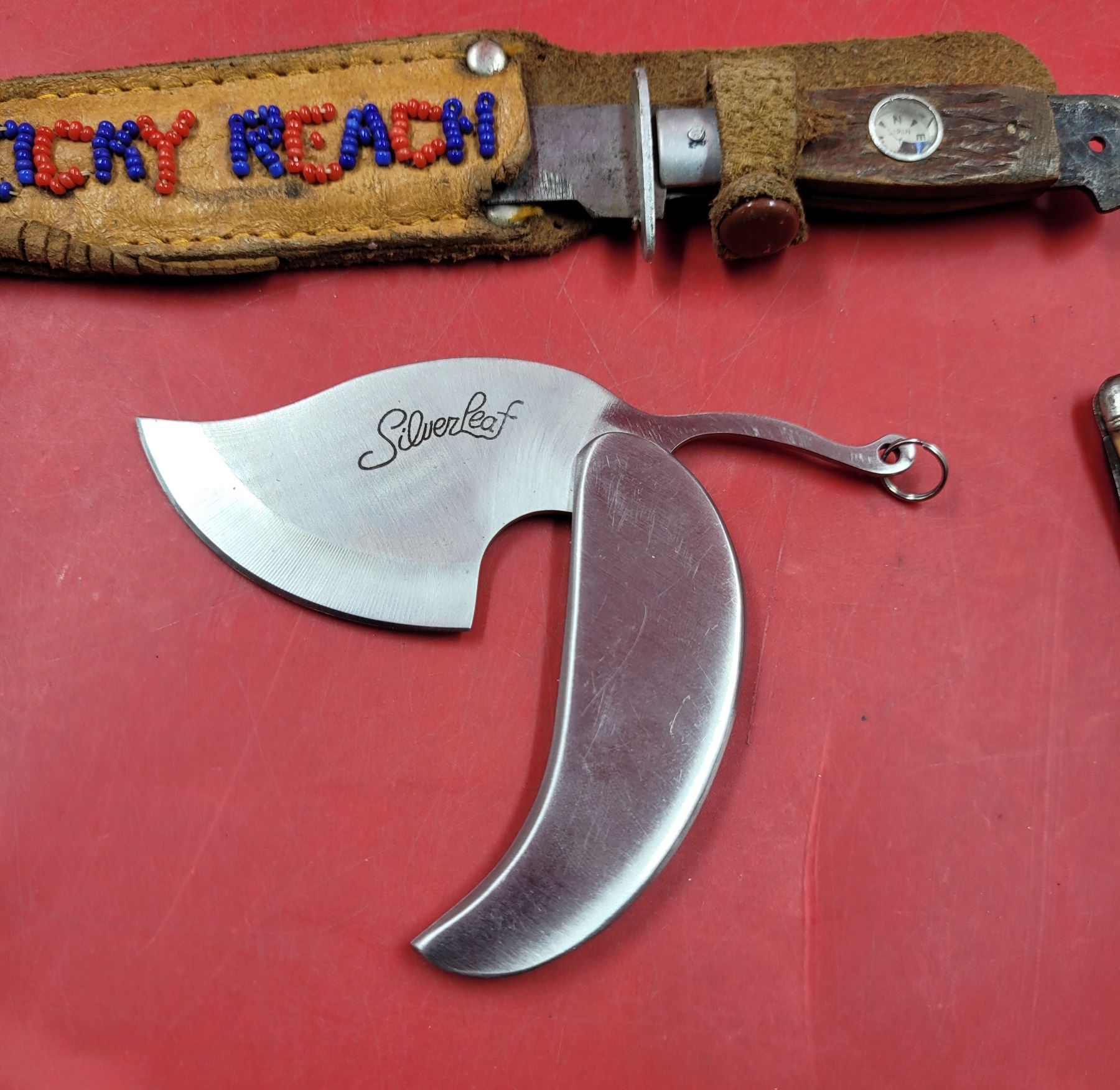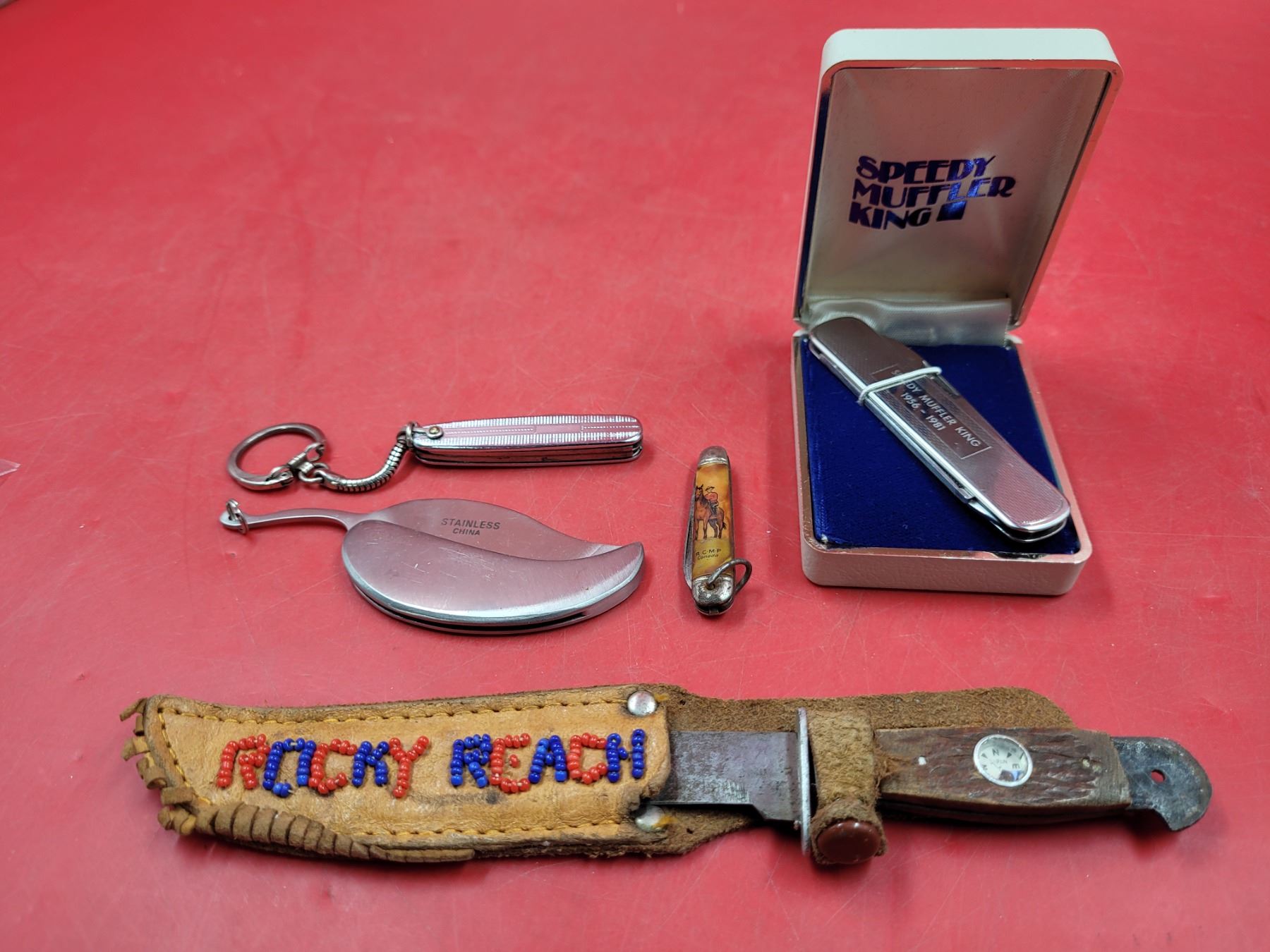 VTG Knife Lot w/ Rocky Beach Knife, Mountie Knife, Speedy Muffler Knife, & More