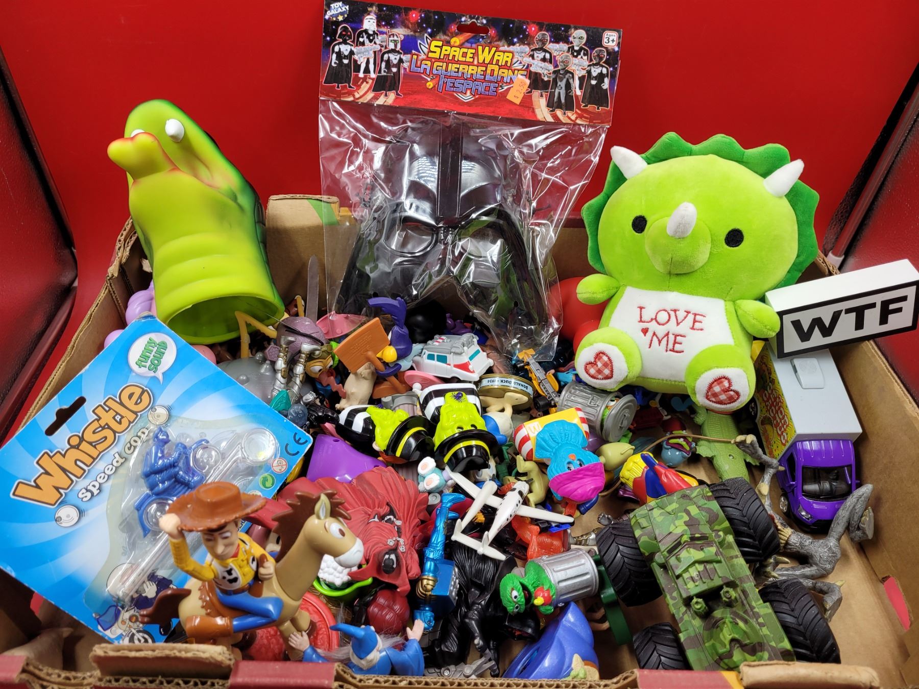 Lot 74 Lot of Assorted Toys w/ Star Wars Mask, TV/Movie Character Toys, Dinosaur Plush, & More