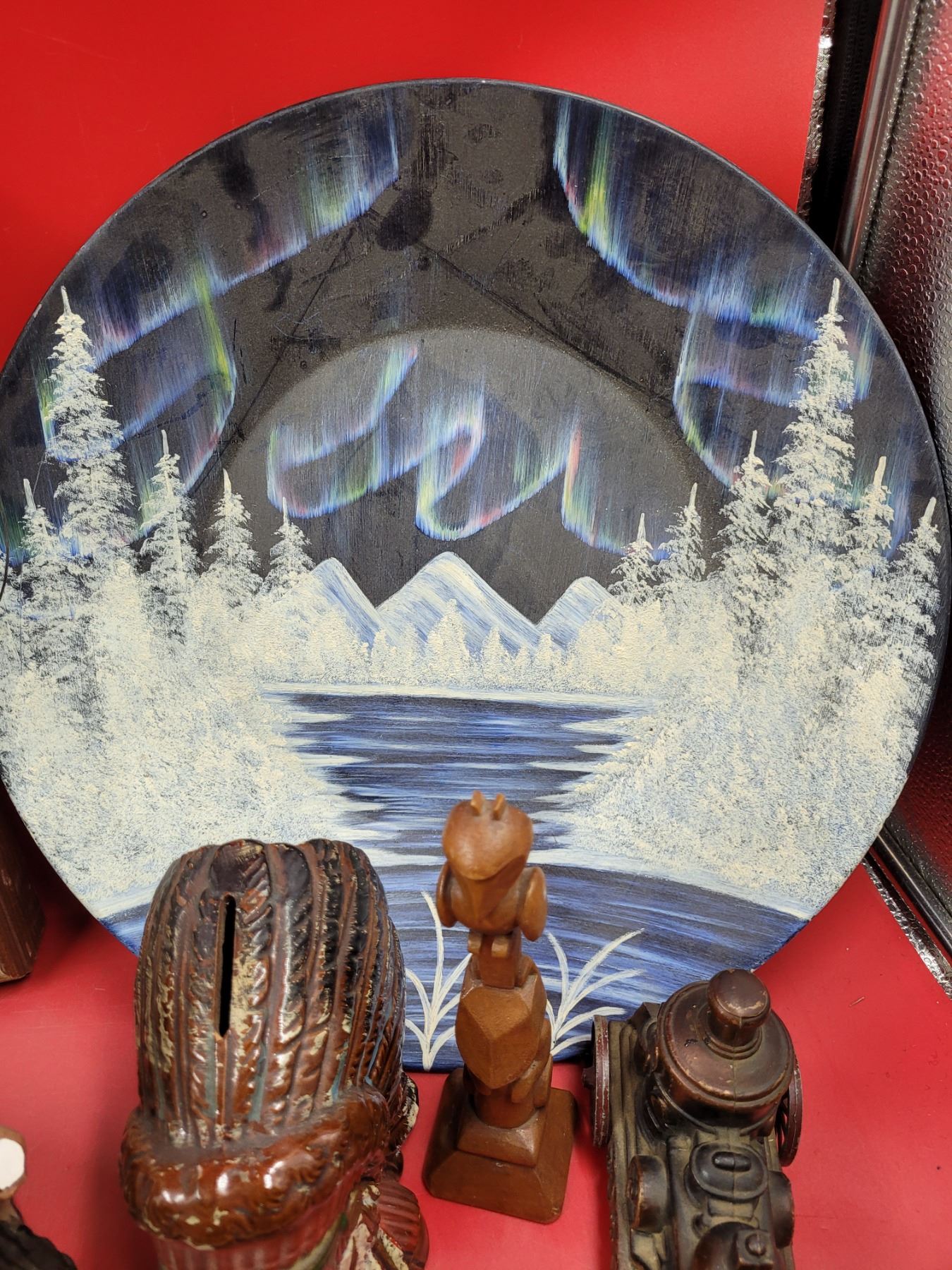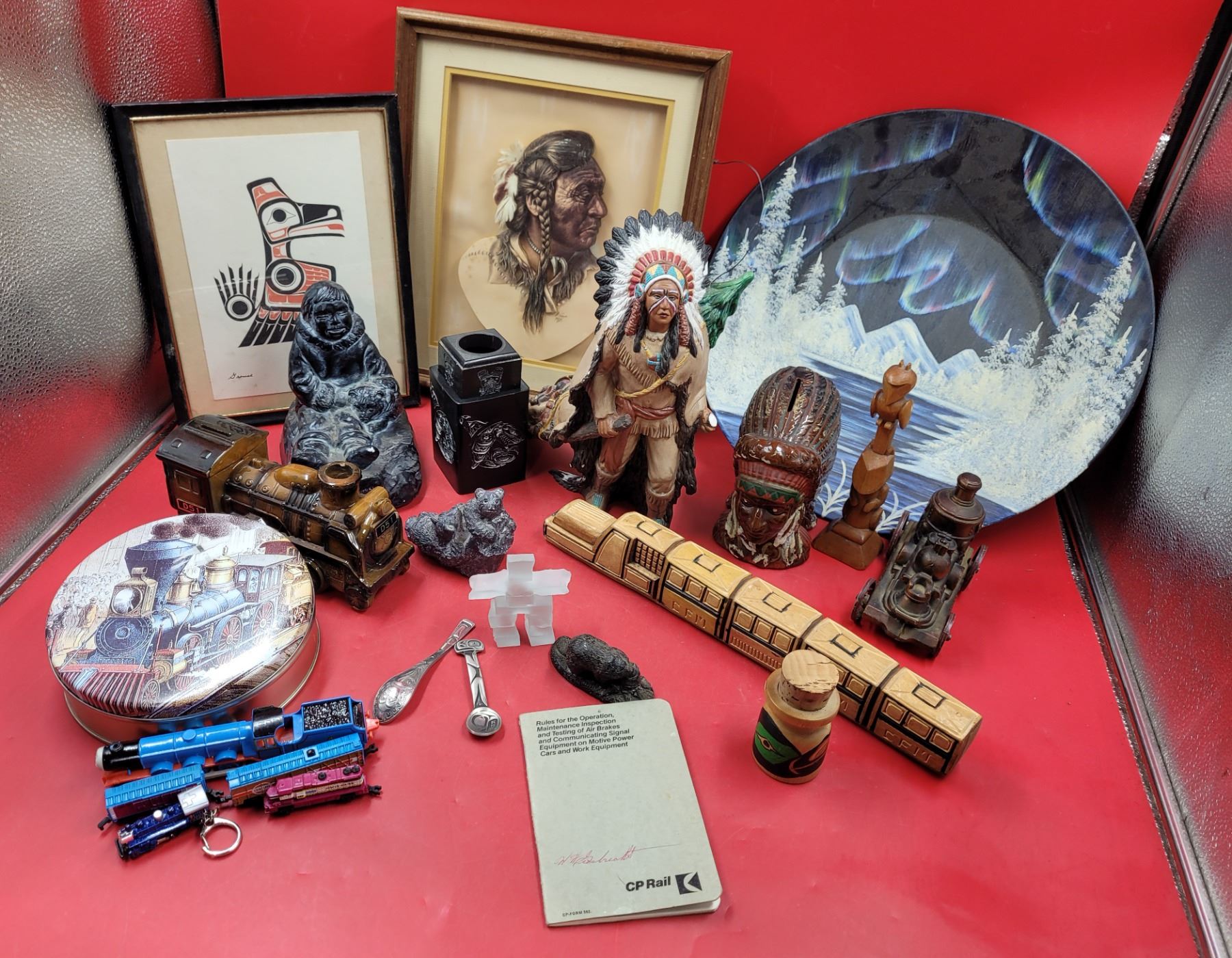Lot 270 Indigenous & Railroad Lot w/ Indigenous Art, Train Tin, Decorative Plate, & More