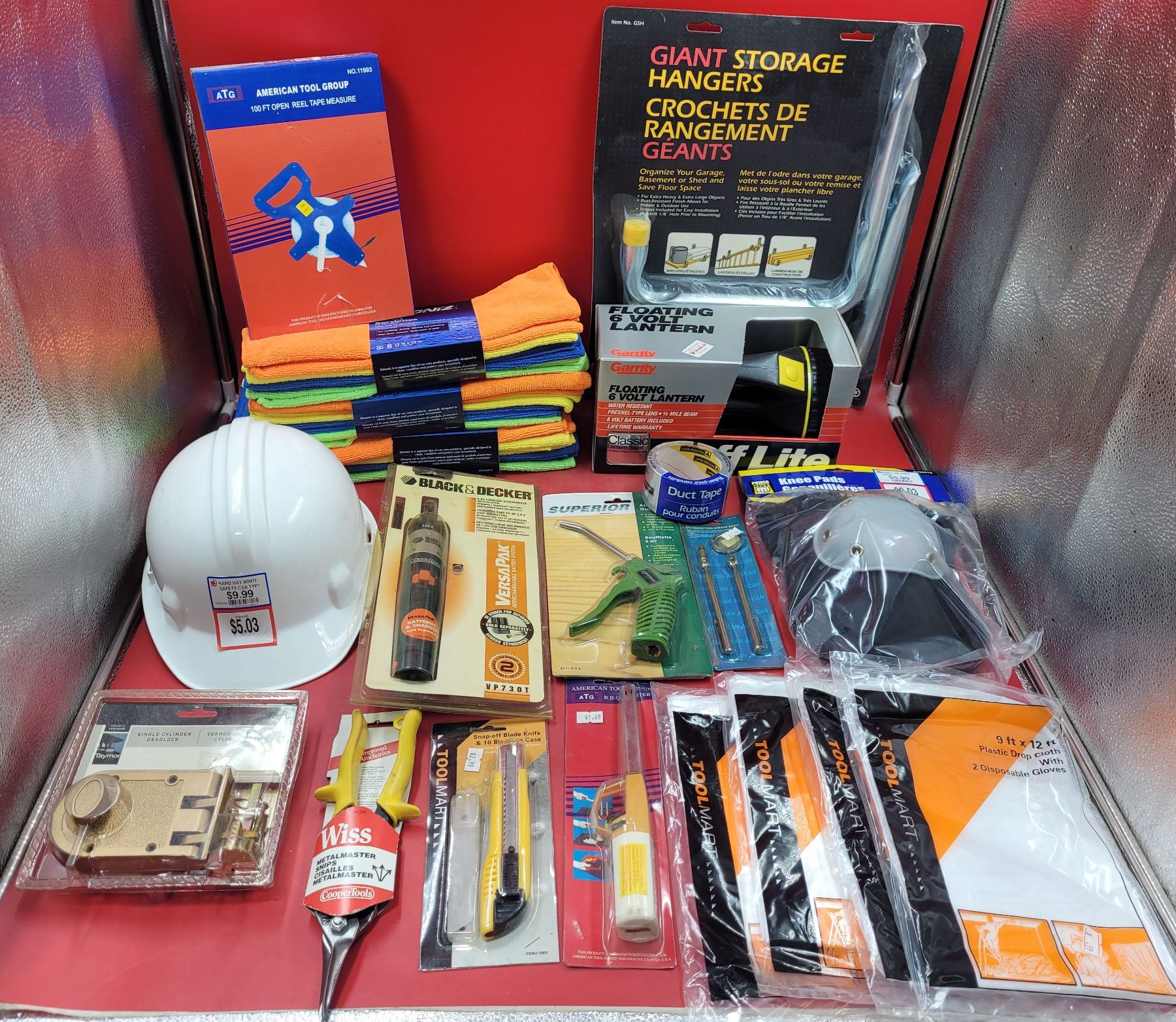 Lot 330 Workwear & Tool Lot w/ Tape Measuring Reel, Hard Hat, Microfiber Cloths, Knee Pads, & More